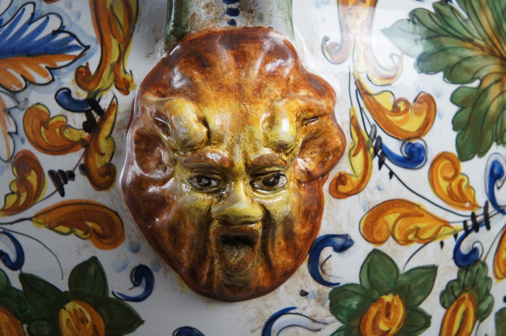 A beautiful 20th century Caffaggiolo jardiniere by Deruta pottery. Features a polychrome finish with elegant scrolling folitate motifs. The planter is handled with figural northwind face beneath. Exceptional craftmanship and color. Made in Italy