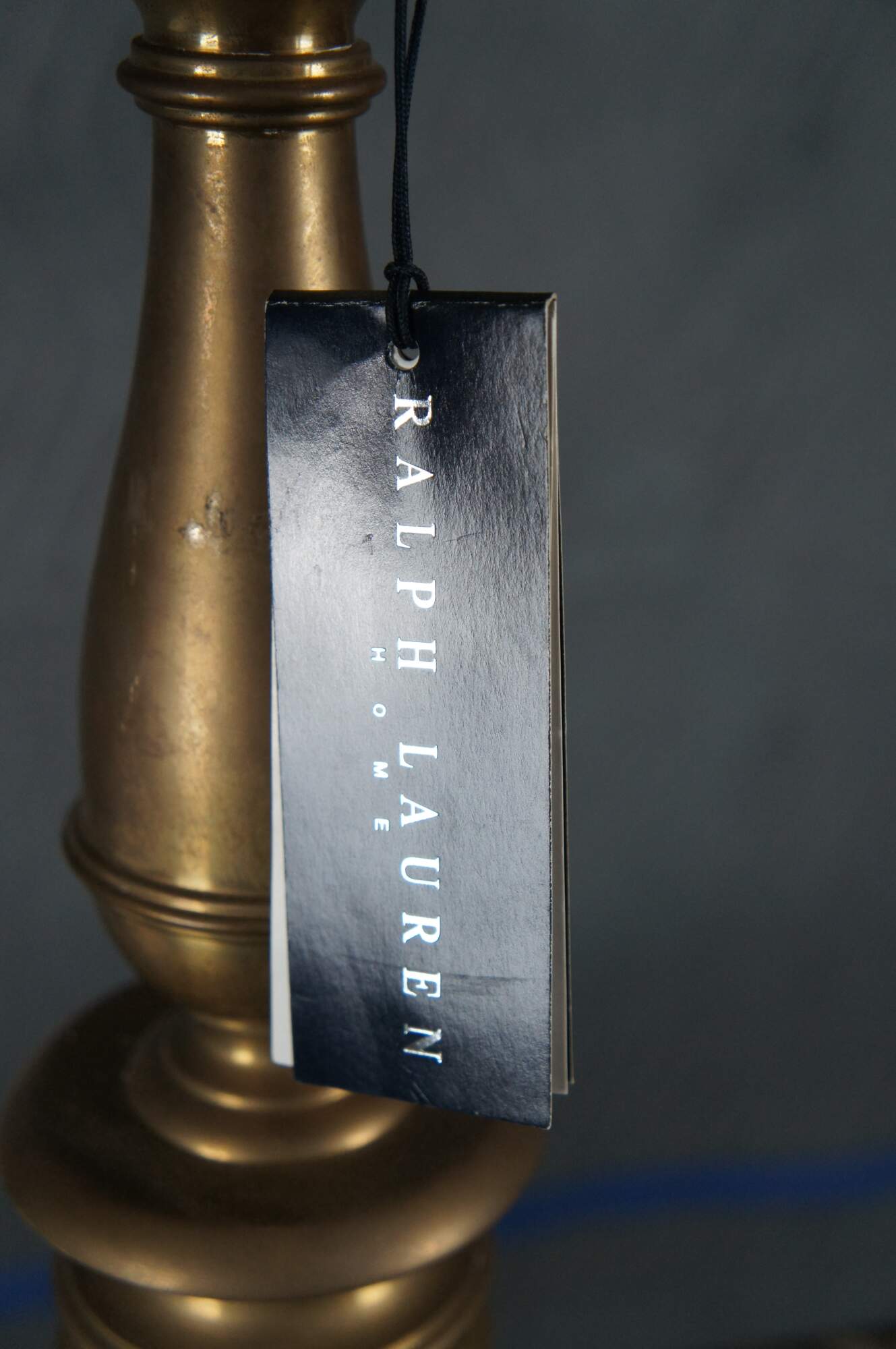 Pair of Ralph Lauren Tudor Candlesticks. Made from antiqued brass with a classic altar stick form featuring tapered adjustable hieght shades.