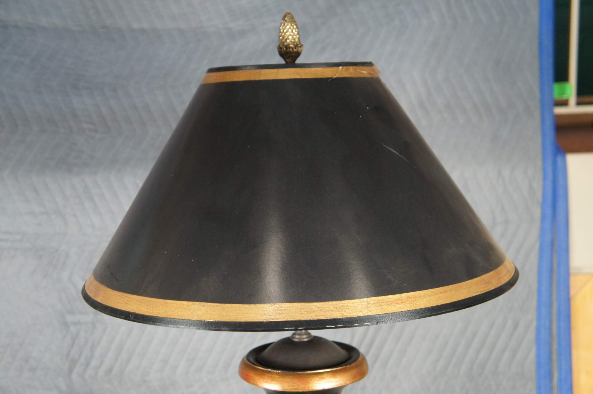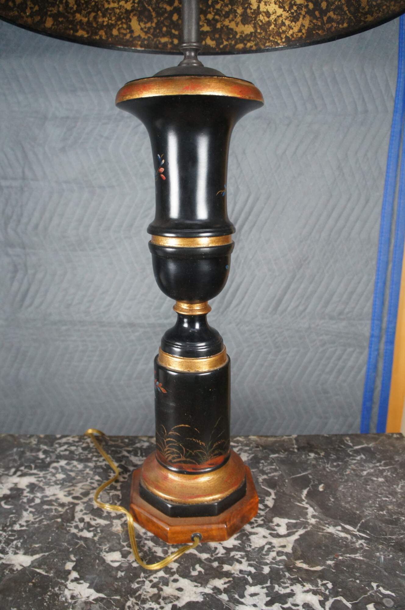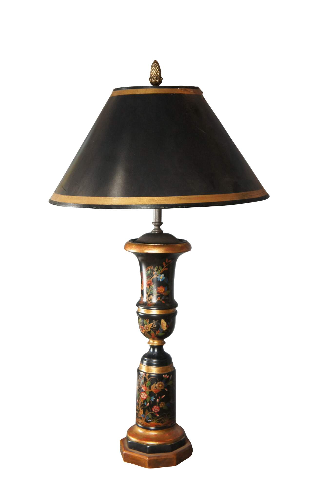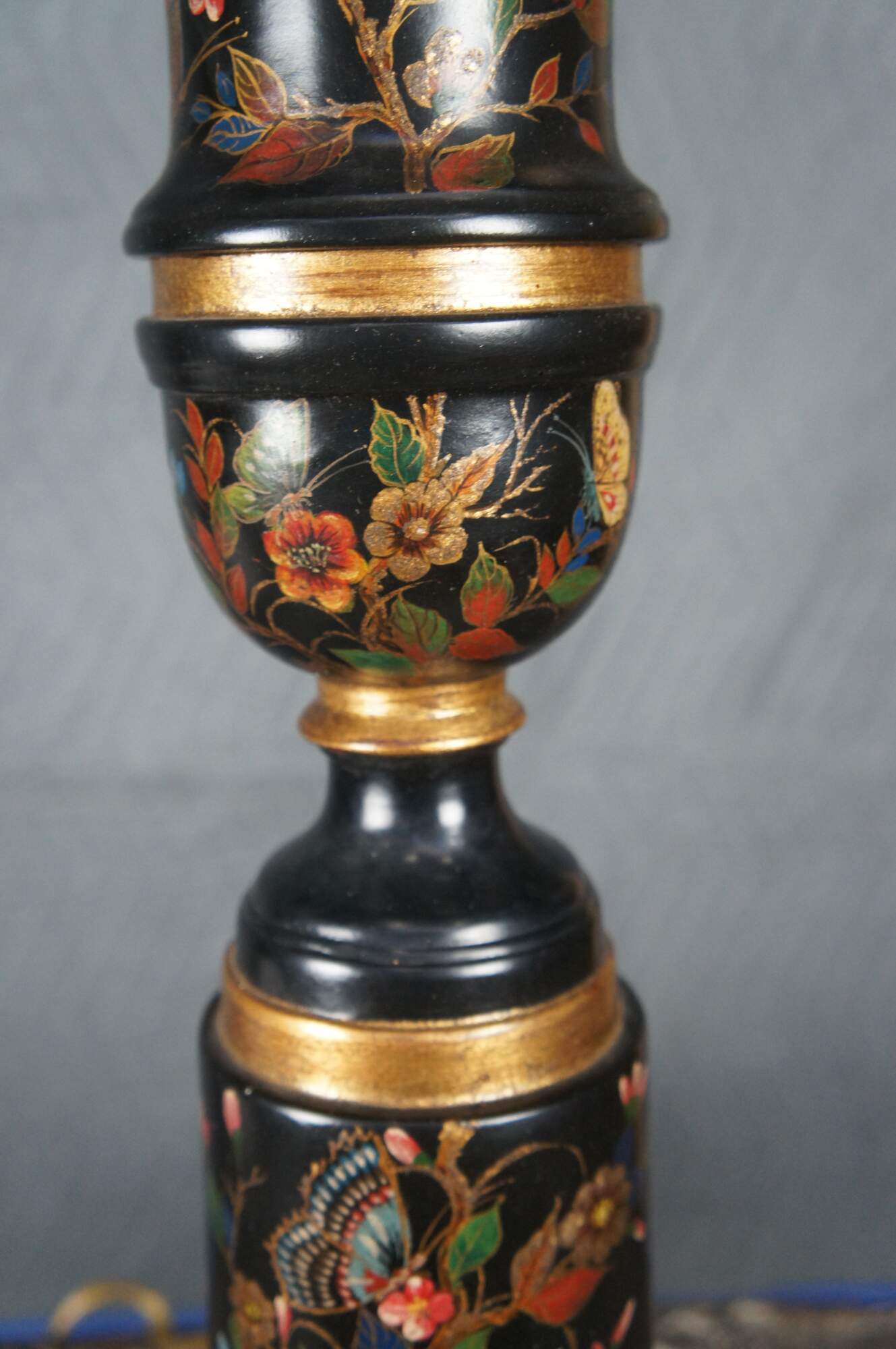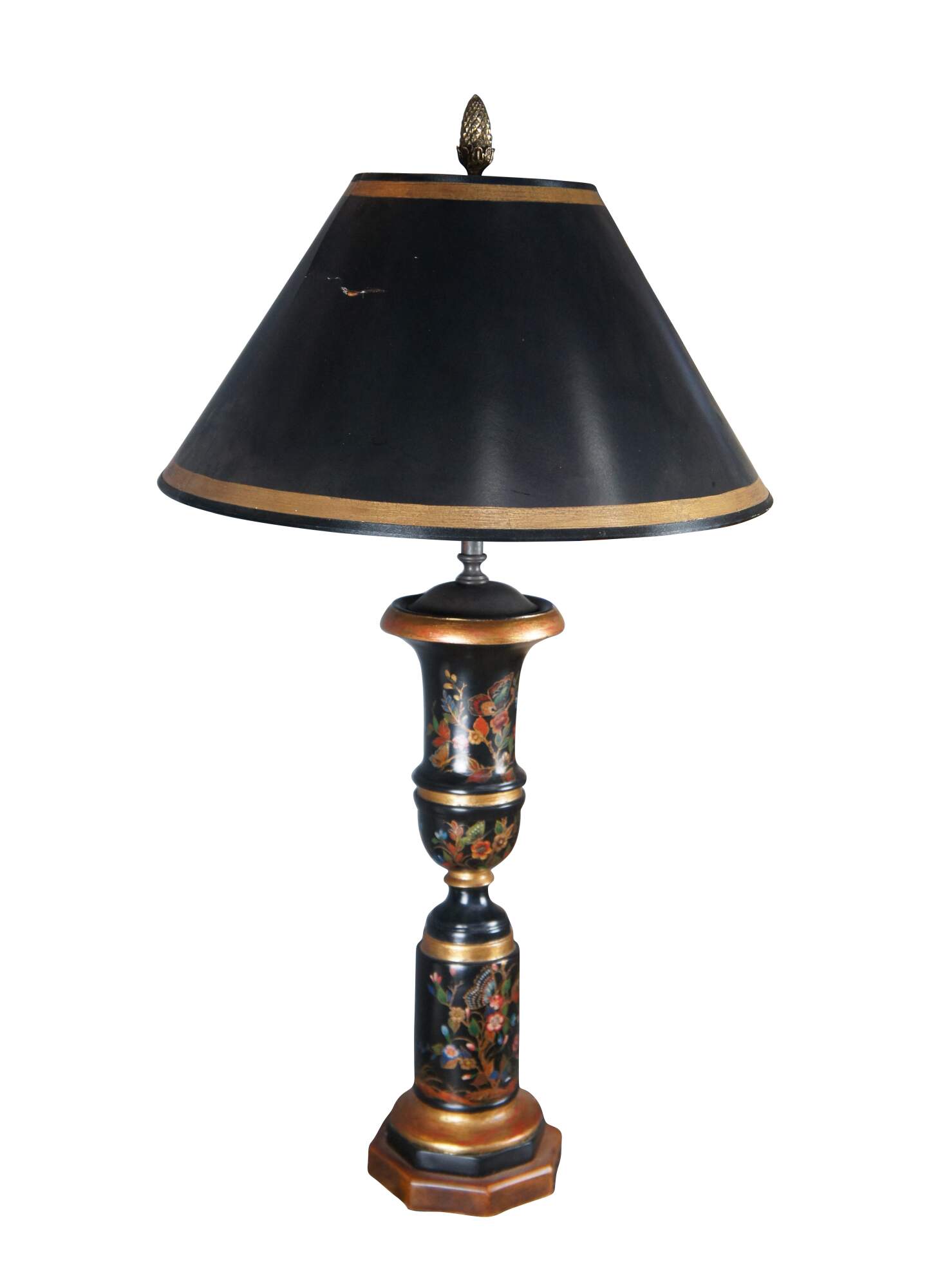 A beautiful Theodore Alexander Tole style table lamp. It features a trumpet or trophy urn form with a black hand painted wooden column decorated in colorful flowers and butterflies. The lamp is accented in gold and has a black tapered shade with gold stripe below rim. The interior of the shade is golf foiled. Includes a brass finial.