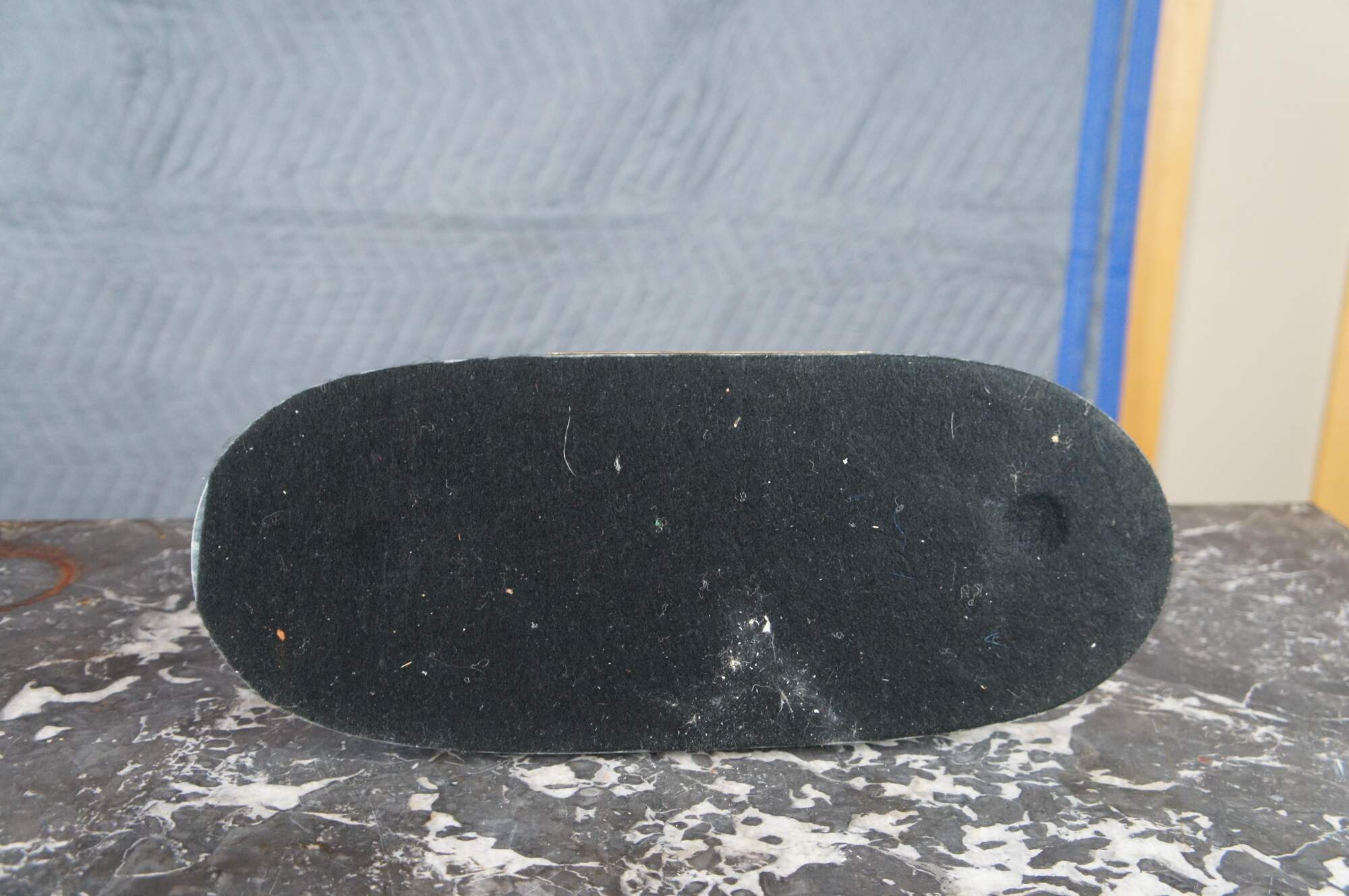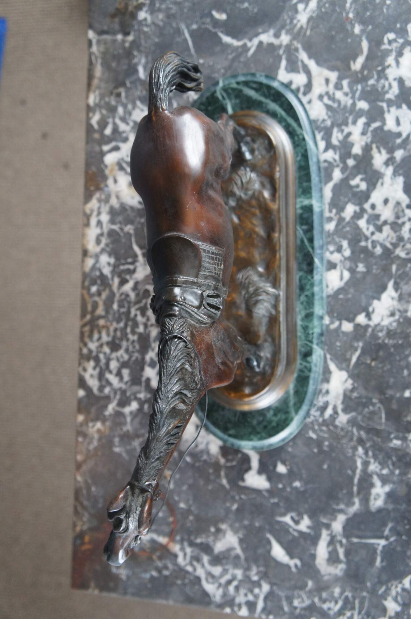 20th Century bronze depicting a saddled race horse. After Jules Moigniez (French, 1835-1894). Signed along the top by the hind legs. The bronze is mounted to a oval green plinth base. Originally used as a trophy for the 1999 Member Guest Invitational at Due Process Stables. The plaque is removable.