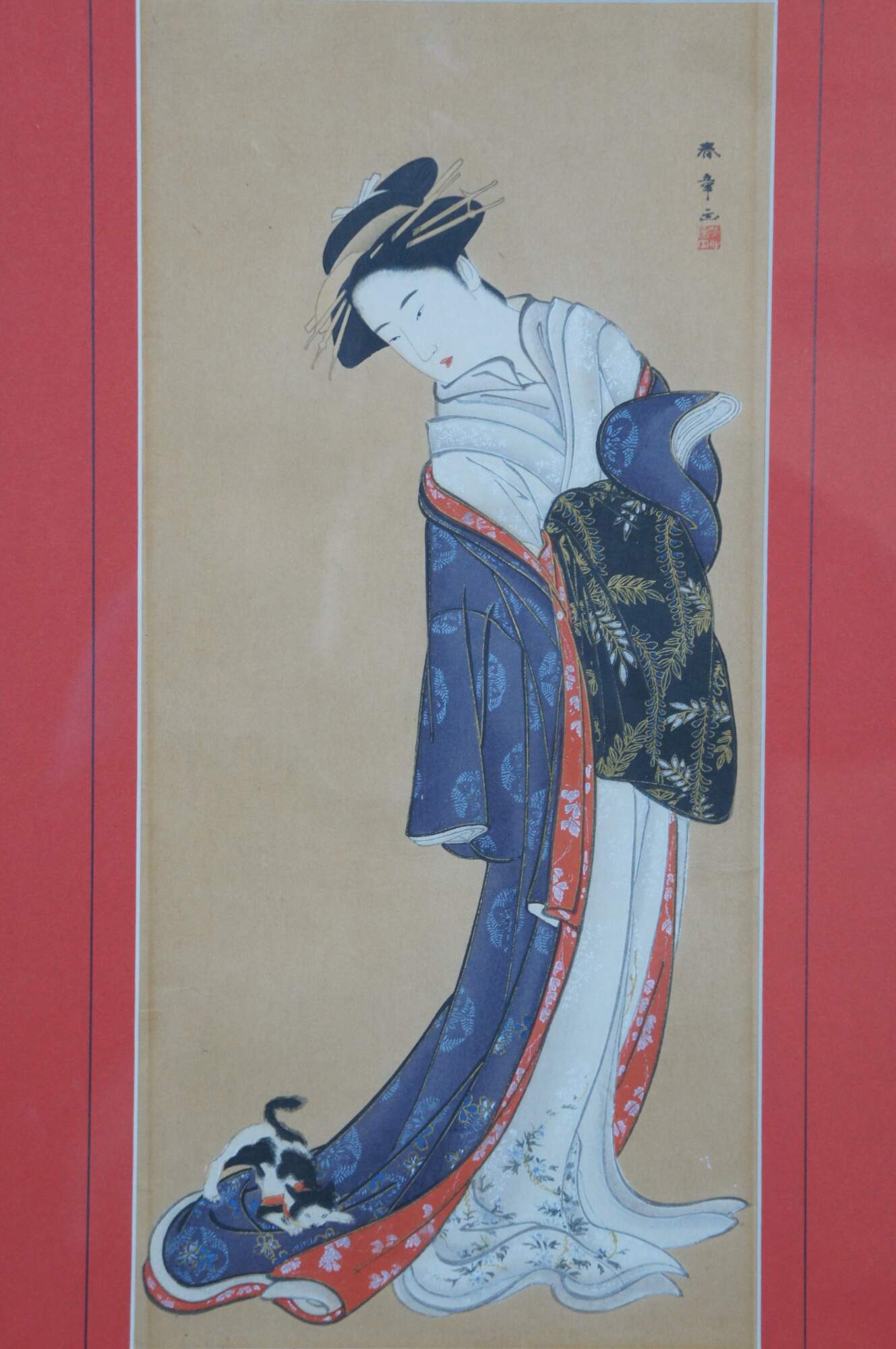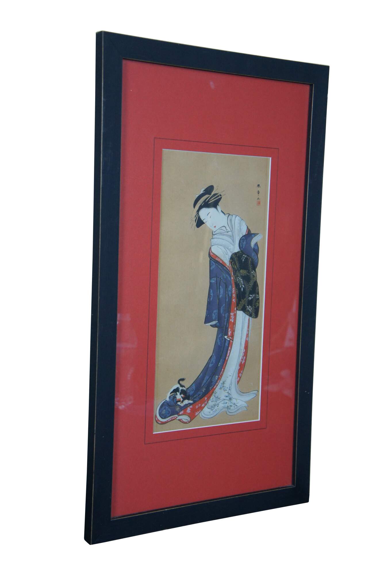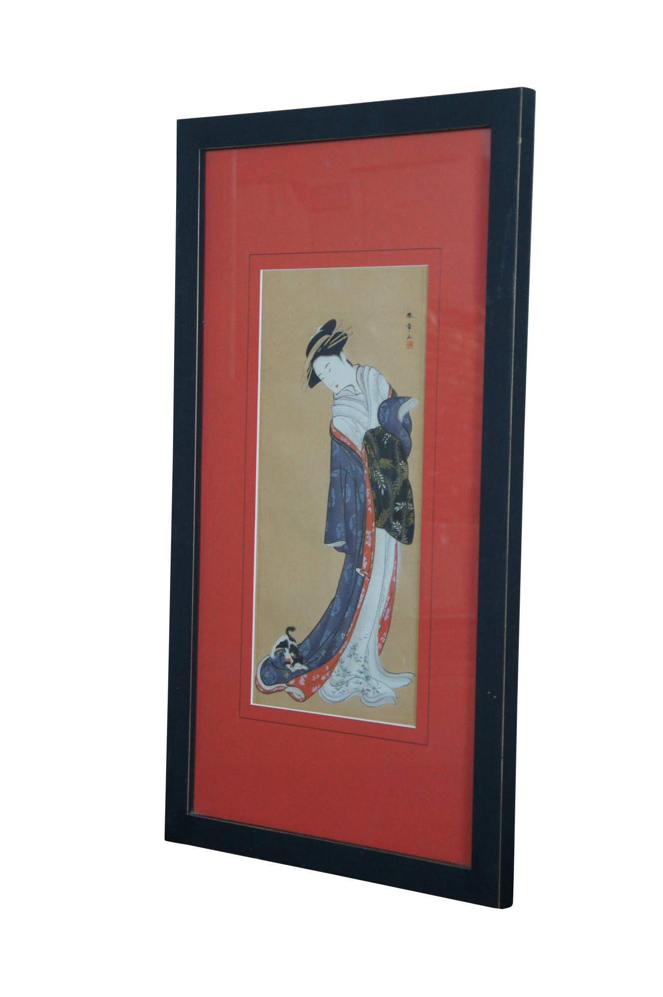 Antique late 18th century edo ukiyo-e style Japanese woodblock print titled "A Beauty with a Cat" by Katsukawa Shunsho. Shows an elegant geisha gazing down at the black and white cat playing on the edge of her kimono. Matte black painted wood frame; red mat.