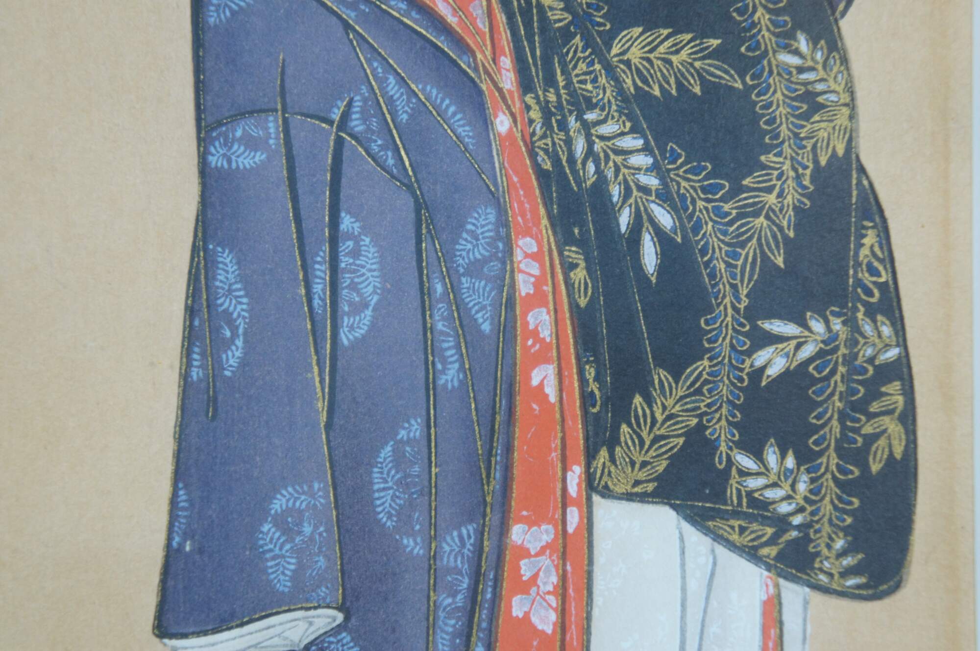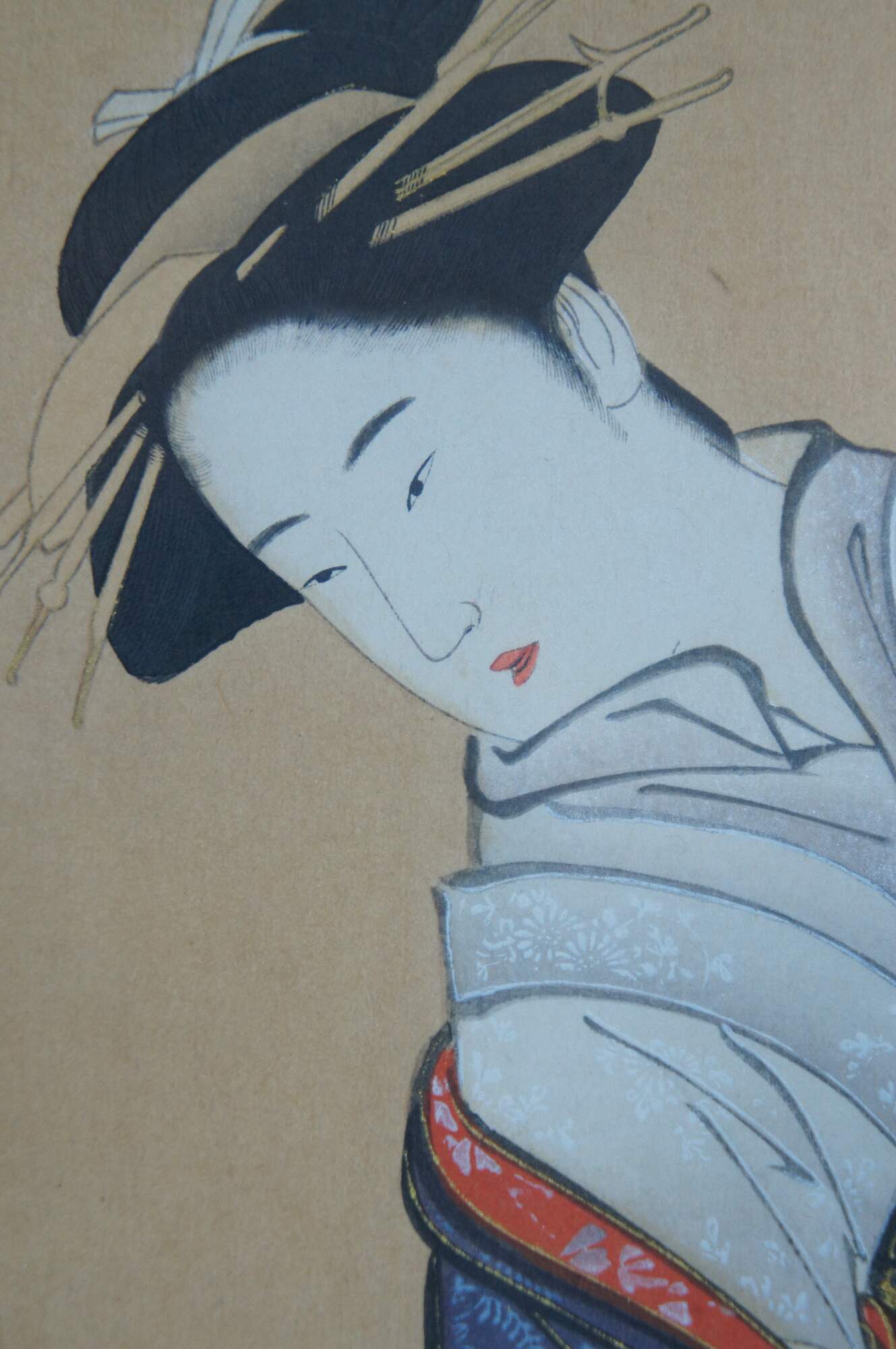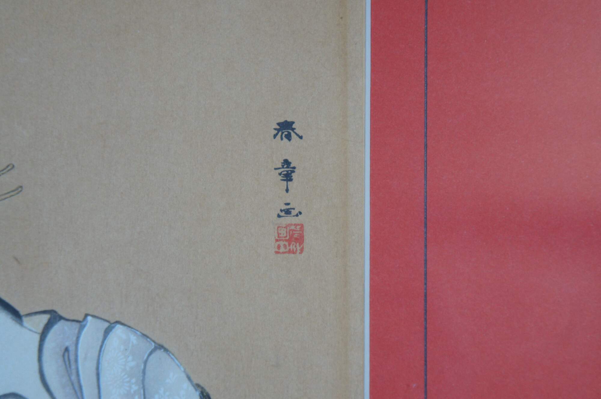 Antique late 18th century edo ukiyo-e style Japanese woodblock print titled "A Beauty with a Cat" by Katsukawa Shunsho. Shows an elegant geisha gazing down at the black and white cat playing on the edge of her kimono. Matte black painted wood frame; red mat.