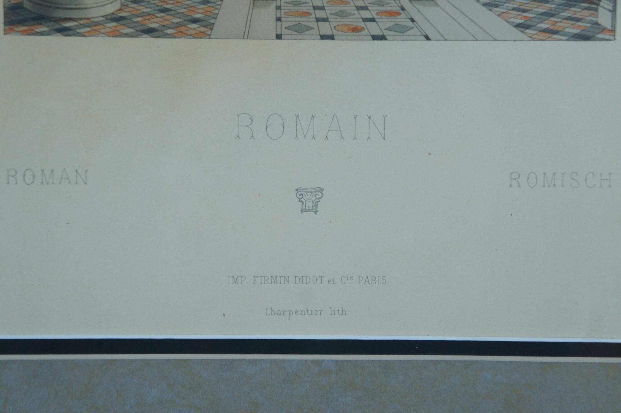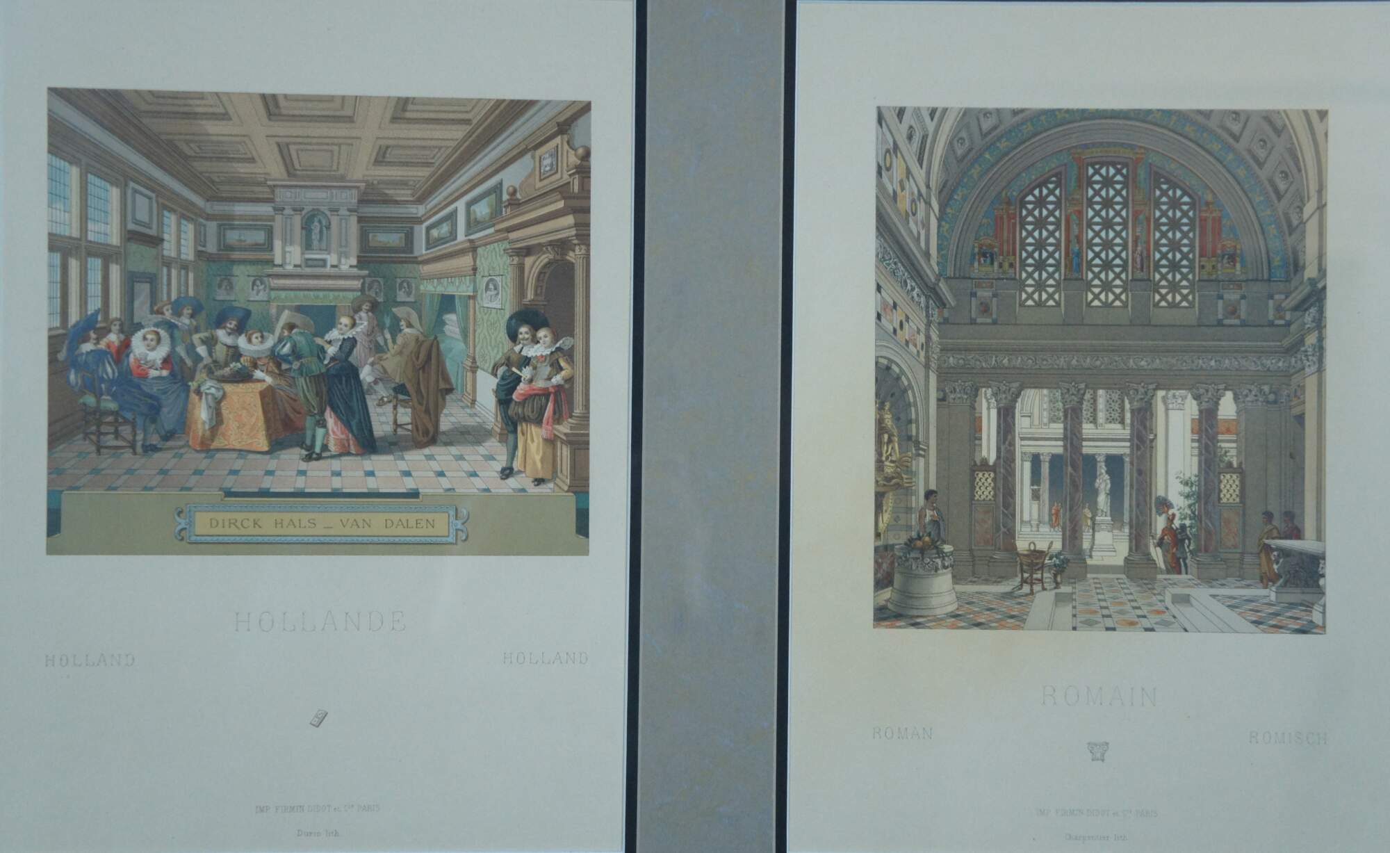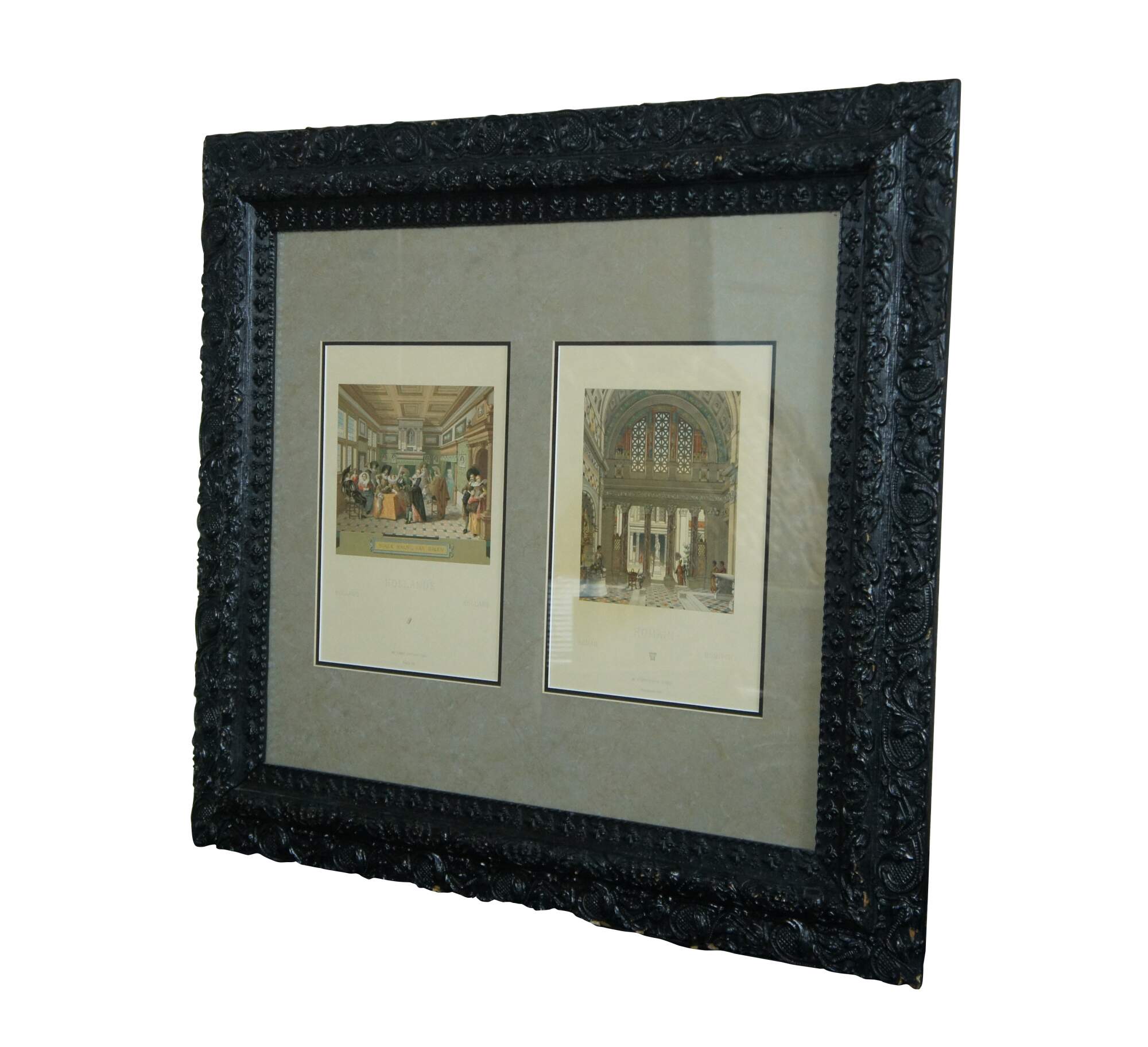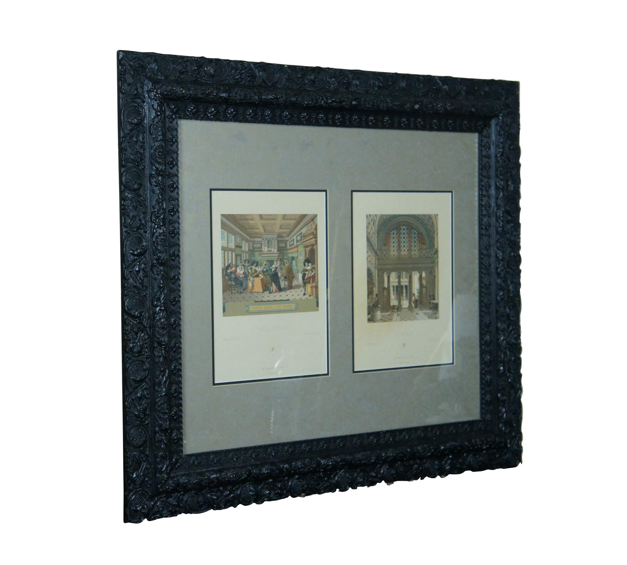Antique 1880s French colored architectural lithograph prints framed as a diptych, showing a pair of elegant interiors - Hollande (Holland - lithographed by Durin) and Romain (Roman - lithographed by Charpentier). Both Imposed by Firmin Didot et Cie, Paris. Dark carved wood frame with scrolling foliates, florals and fleur de lis; mottled silver and gold mat.