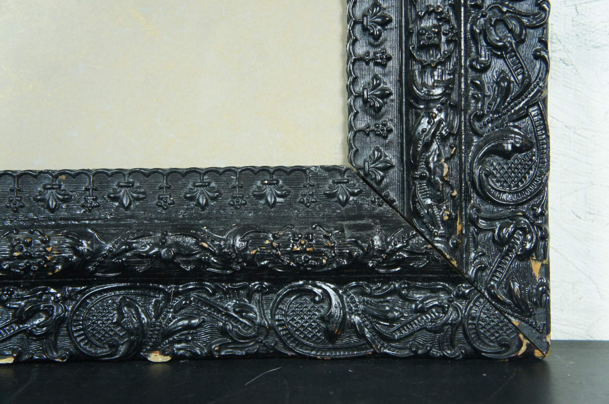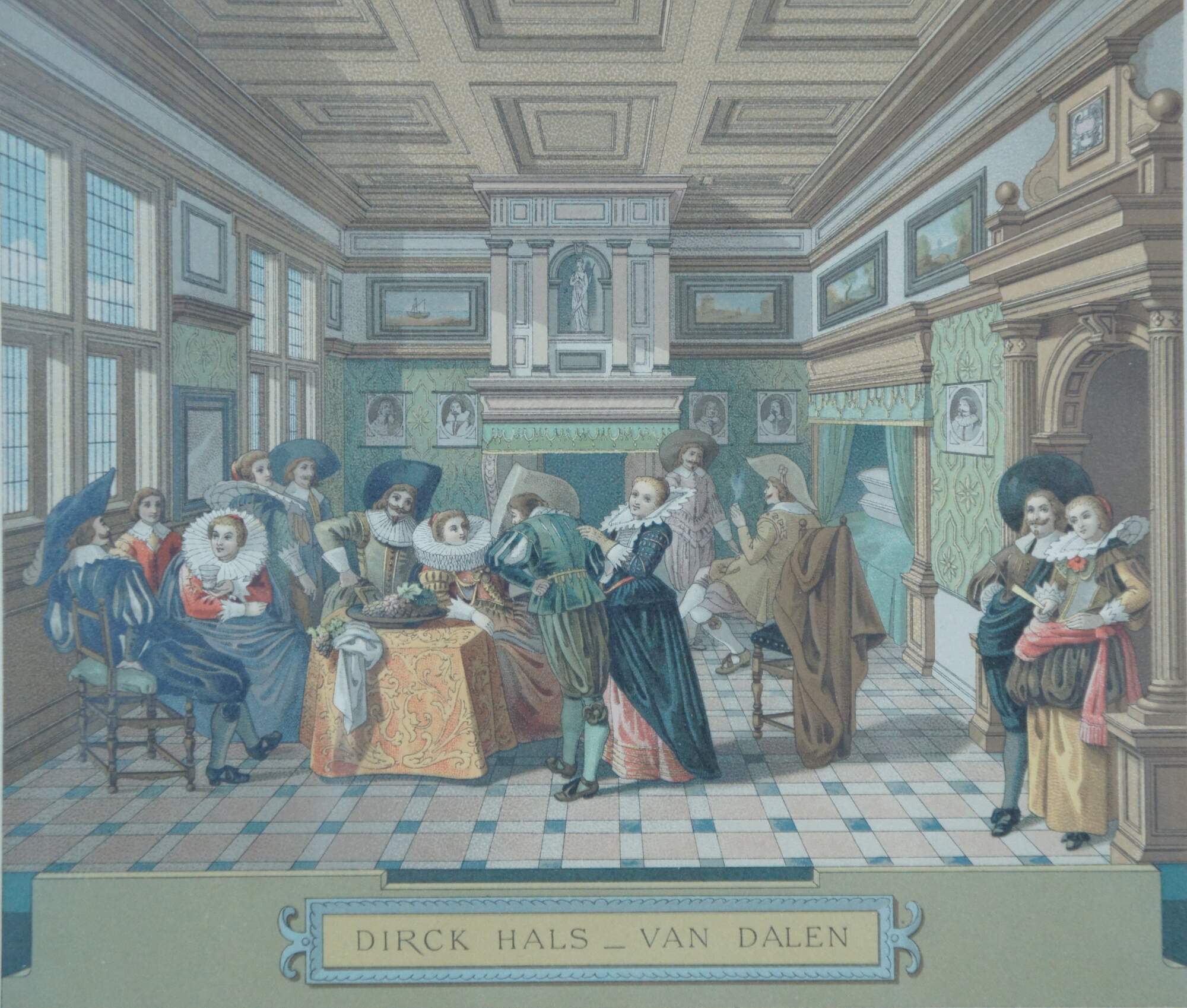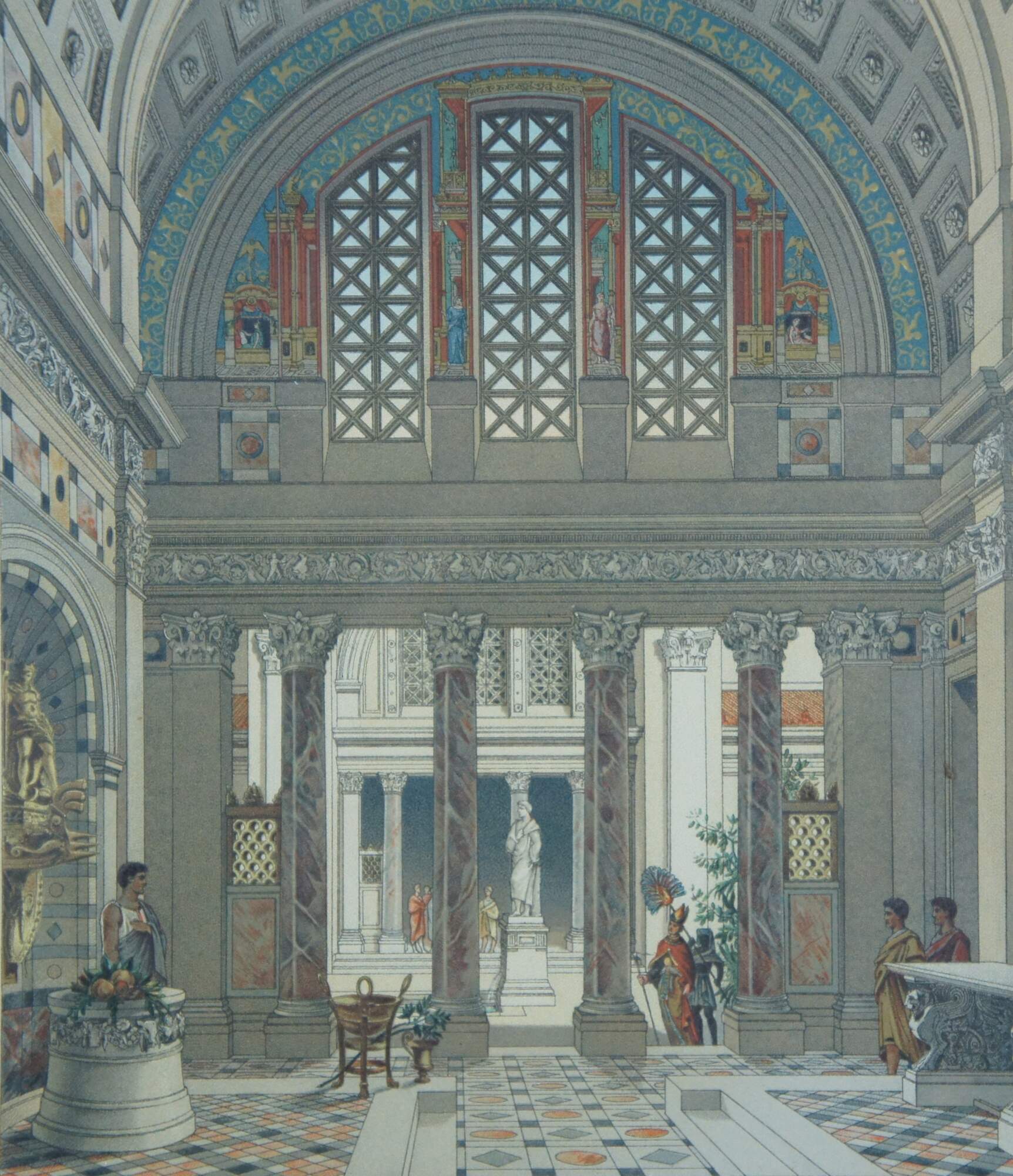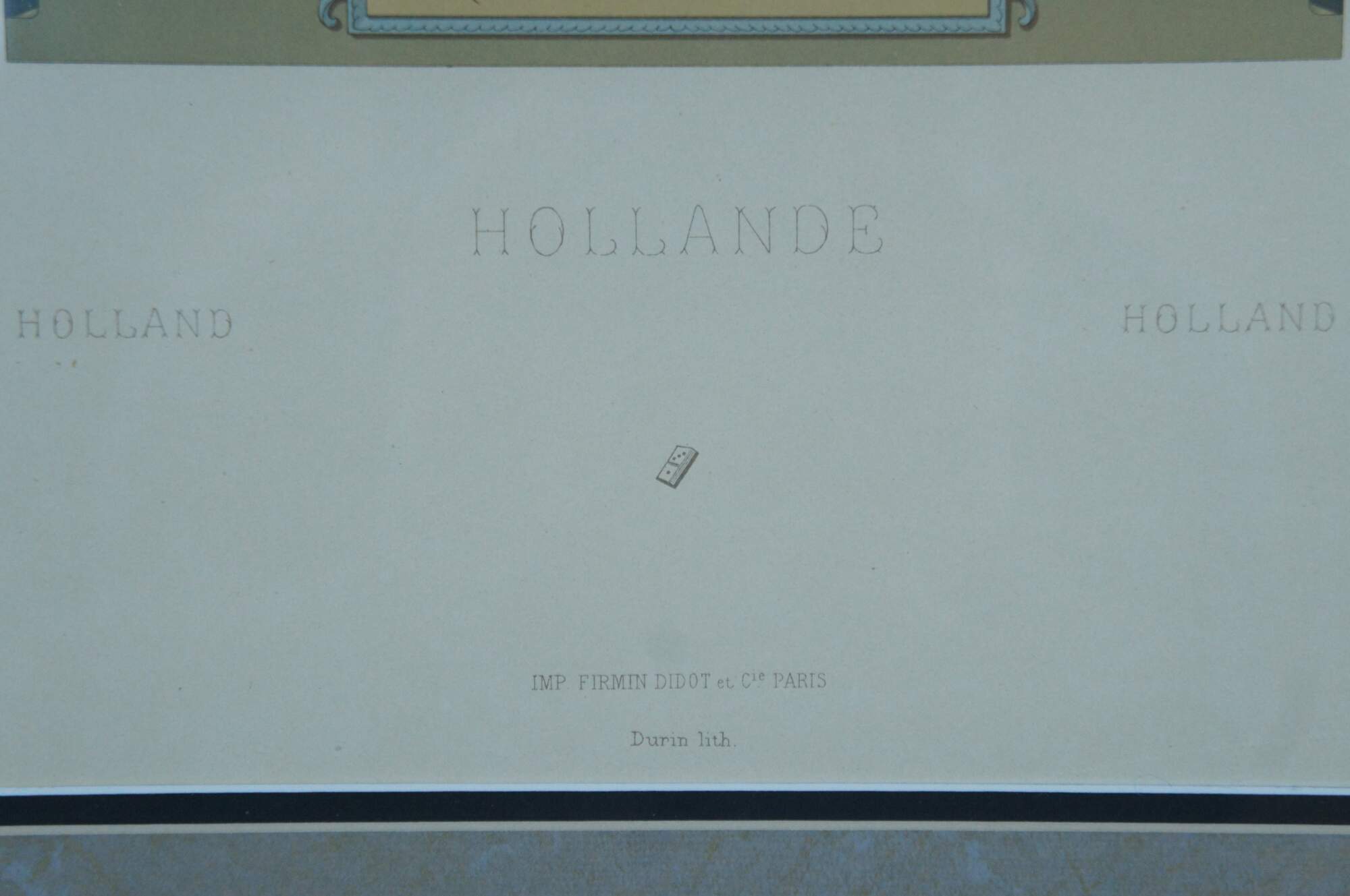 Antique 1880s French colored architectural lithograph prints framed as a diptych, showing a pair of elegant interiors - Hollande (Holland - lithographed by Durin) and Romain (Roman - lithographed by Charpentier). Both Imposed by Firmin Didot et Cie, Paris. Dark carved wood frame with scrolling foliates, florals and fleur de lis; mottled silver and gold mat.