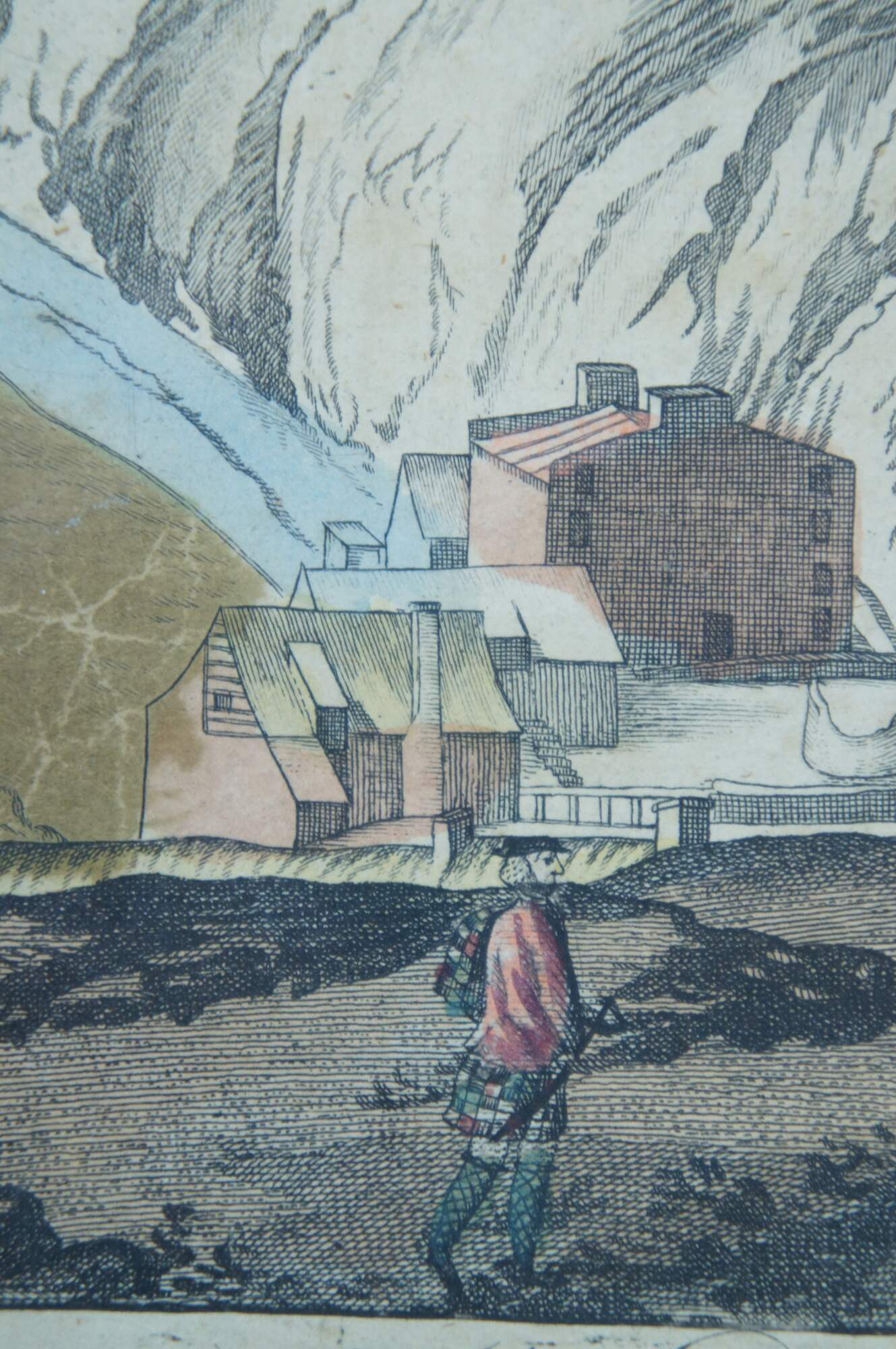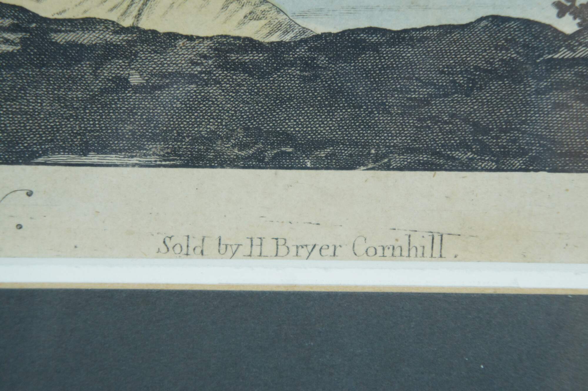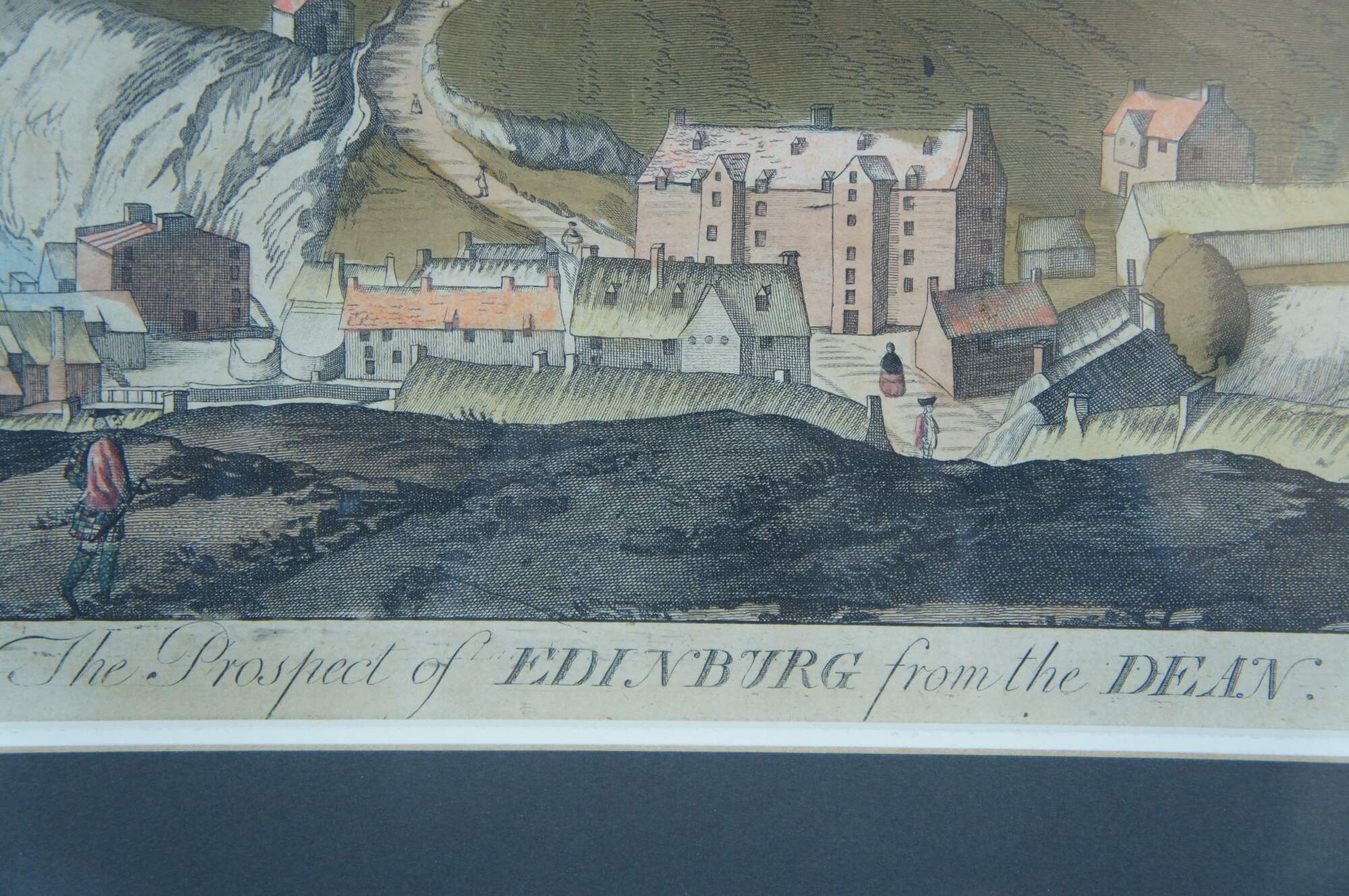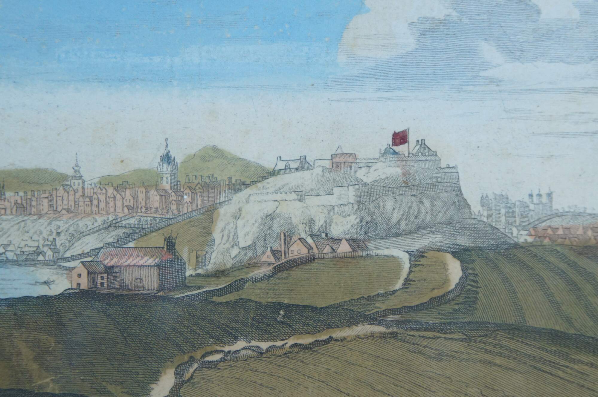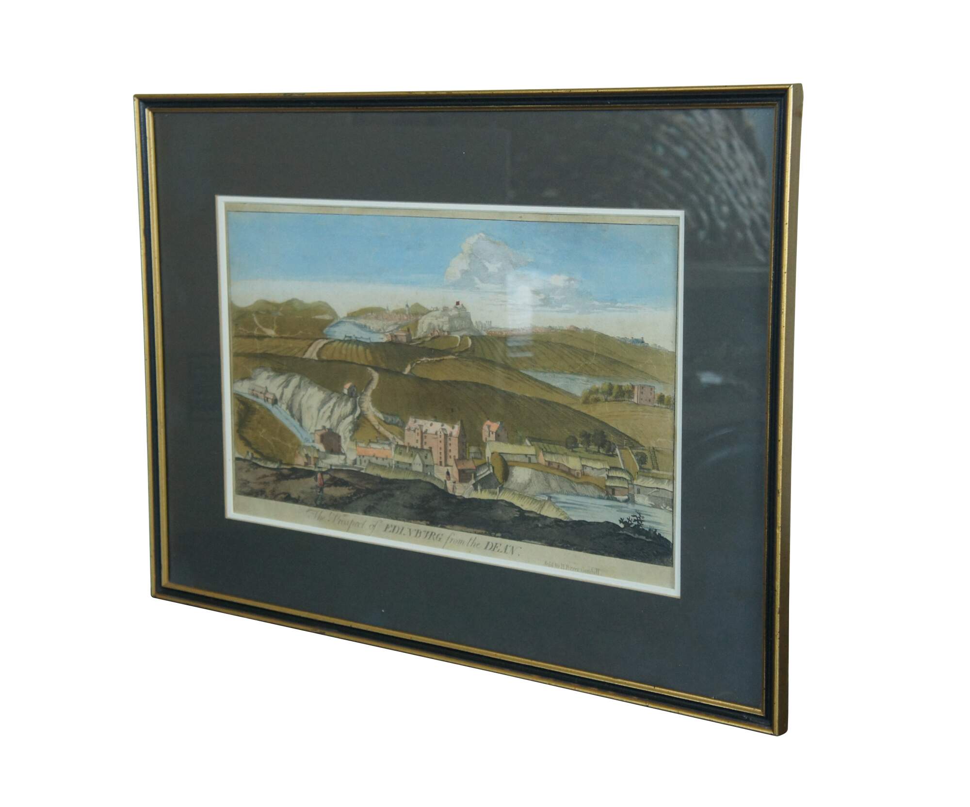 Antique German 17th century hand colored engraving titled "The Prospect of Edinburg from the Dean," by John Slezer, sold by H. Bryer, Cornhill. Giltwood frame with black painted bevel; gray mat. Shows "(t)he opposite view from ‘The Southside of the Castle of Edinburgh', seen from the Village of Dean, which is now part of Edinburgh. Left of the castle is a row of steeples - St Giles' Cathedral, the Tron Church, the Netherbow Port, the Tolbooth, and the Chapel Royal of the Palace of Holyroodhouse. Below the city is North (or 'Nor') Loch, with St Cuthbert's Church to the right. Edinburgh's extinct volcano, Arthur's Seat, is faintly visible behind the city spires, whilst to the left is Calton Hill. Heriot's Hospital is to the right of the castle mound. Image from Theatrum Scotiae by John Slezer, 1693." (Source: National Library of Scotland)