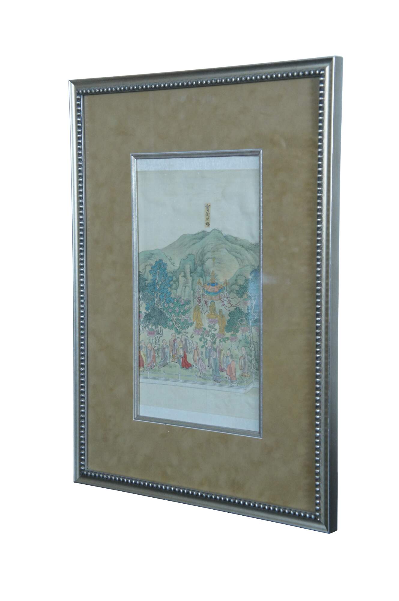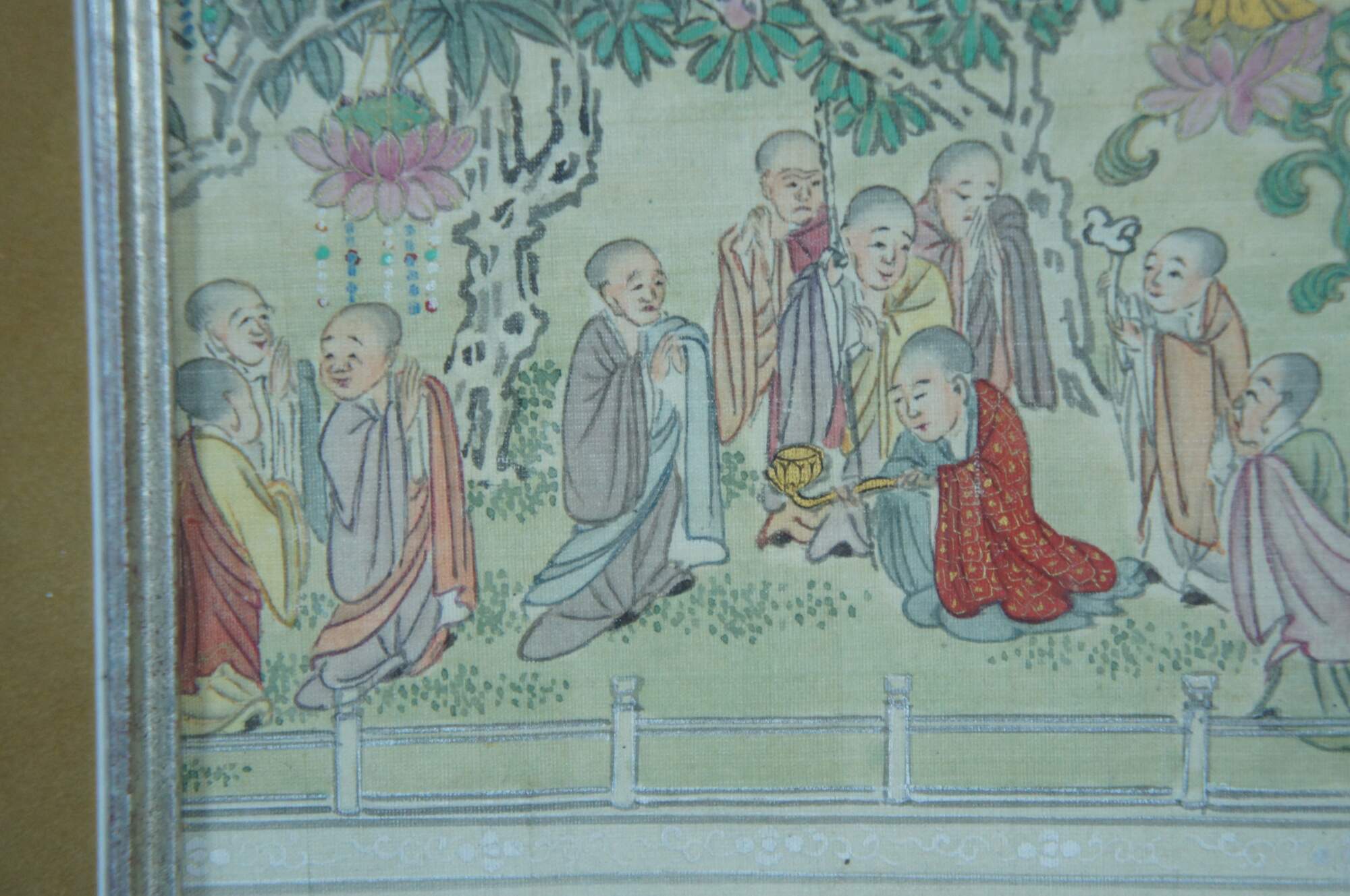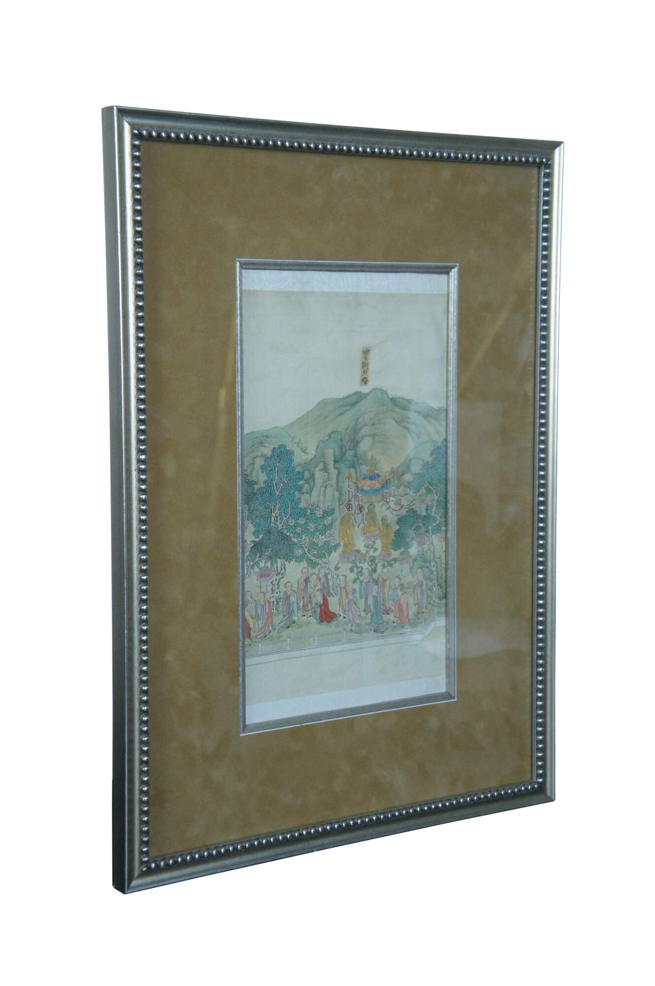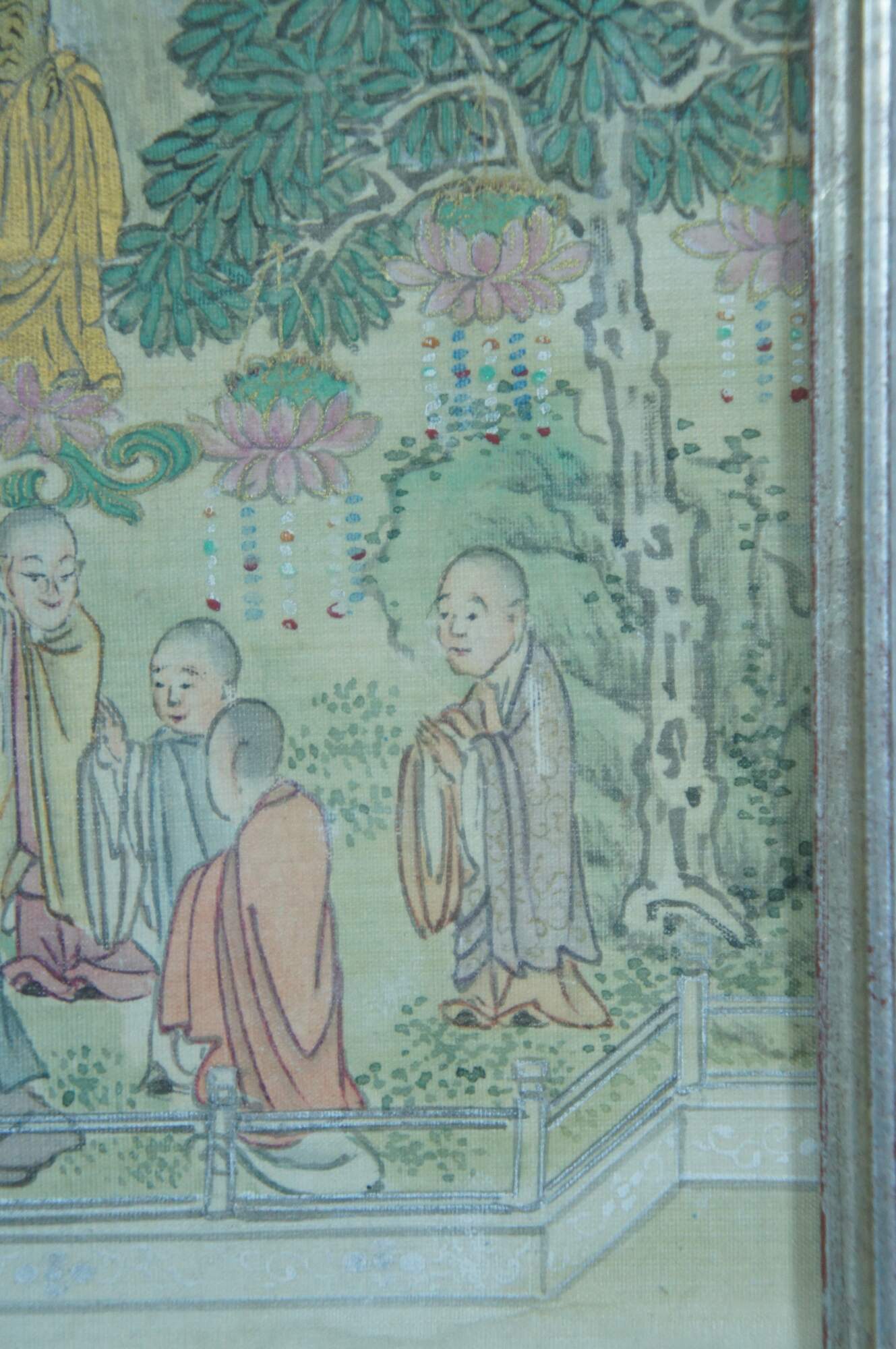 Antique watercolor painting on silk, showing the Buddhas under a floating canopy, seated on lotus flowers, surrounded by other monks smoking a pipe and meditating, all in a fenced off landscape of trees and hills. Paper label affixed to sky. Beveled silver gilt frame and inner border with beaded edge; mottled brown mat.
