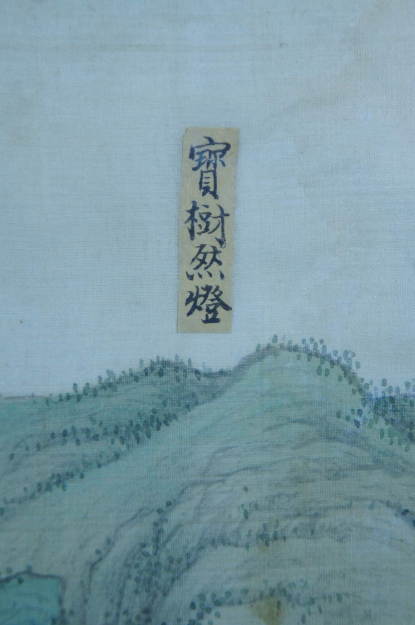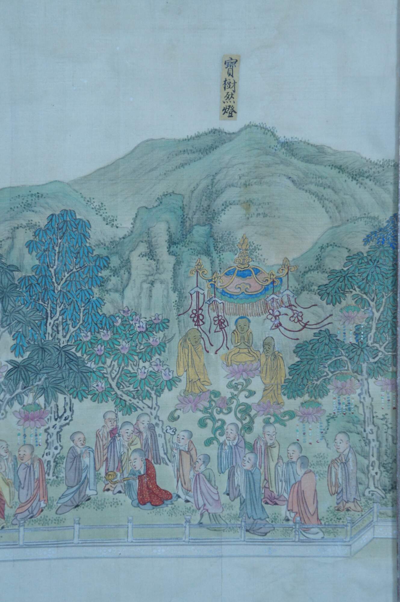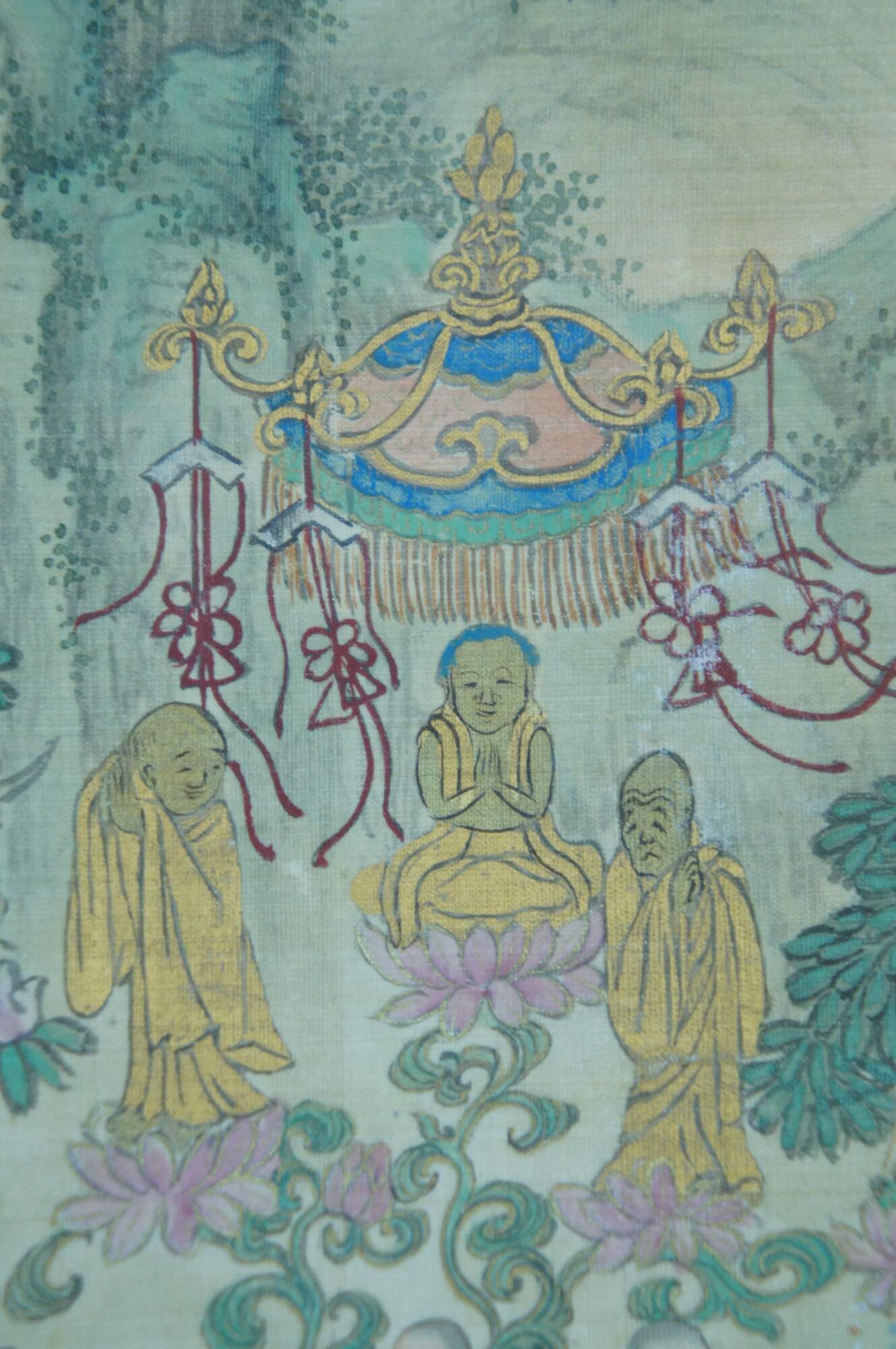 Antique watercolor painting on silk, showing the Buddhas under a floating canopy, seated on lotus flowers, surrounded by other monks smoking a pipe and meditating, all in a fenced off landscape of trees and hills. Paper label affixed to sky. Beveled silver gilt frame and inner border with beaded edge; mottled brown mat.