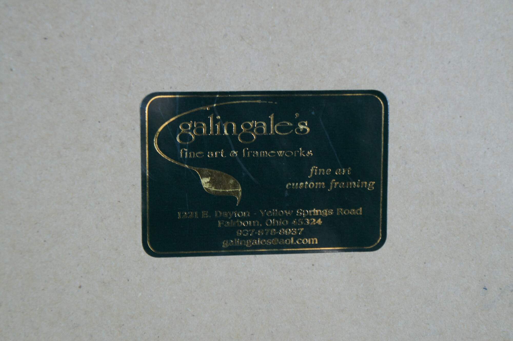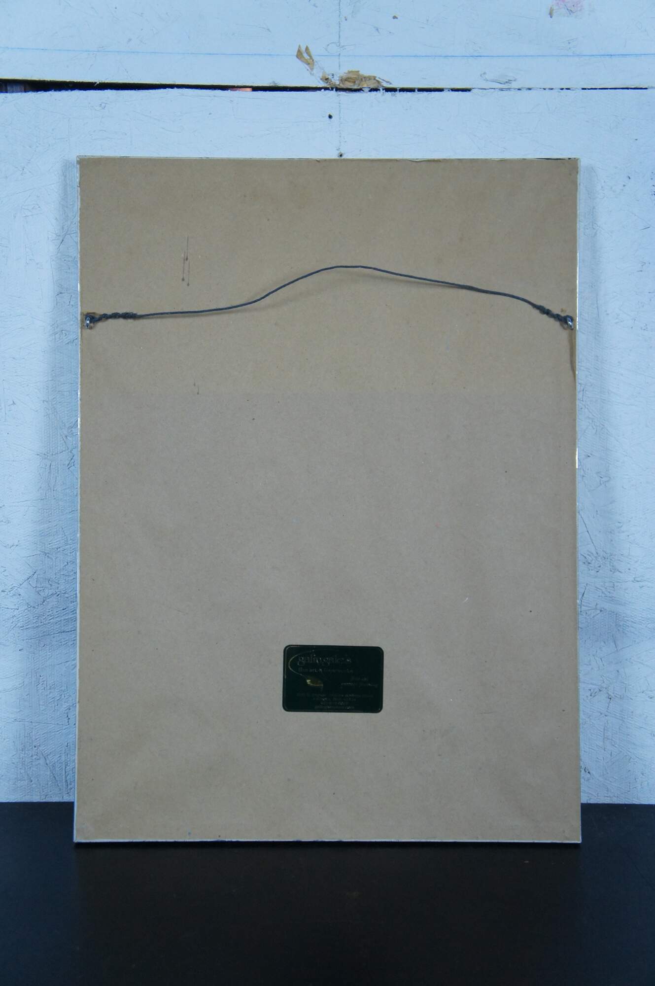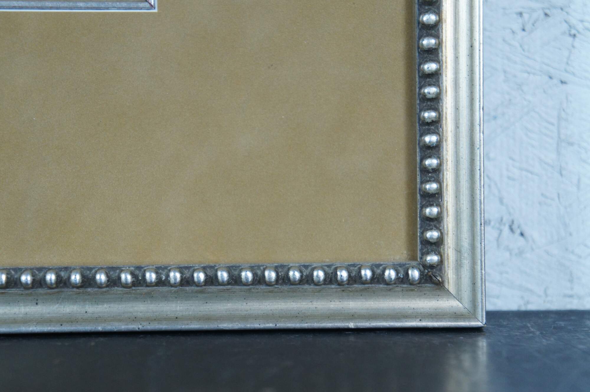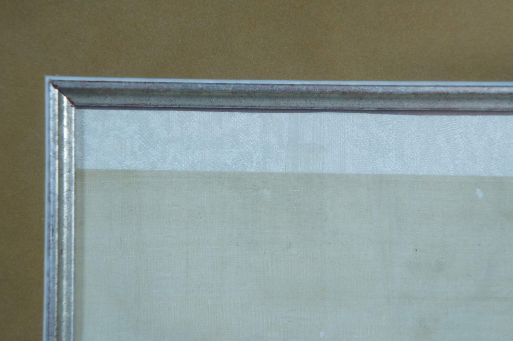 Antique watercolor painting on silk, showing the Buddhas under a floating canopy, seated on lotus flowers, surrounded by other monks smoking a pipe and meditating, all in a fenced off landscape of trees and hills. Paper label affixed to sky. Beveled silver gilt frame and inner border with beaded edge; mottled brown mat.