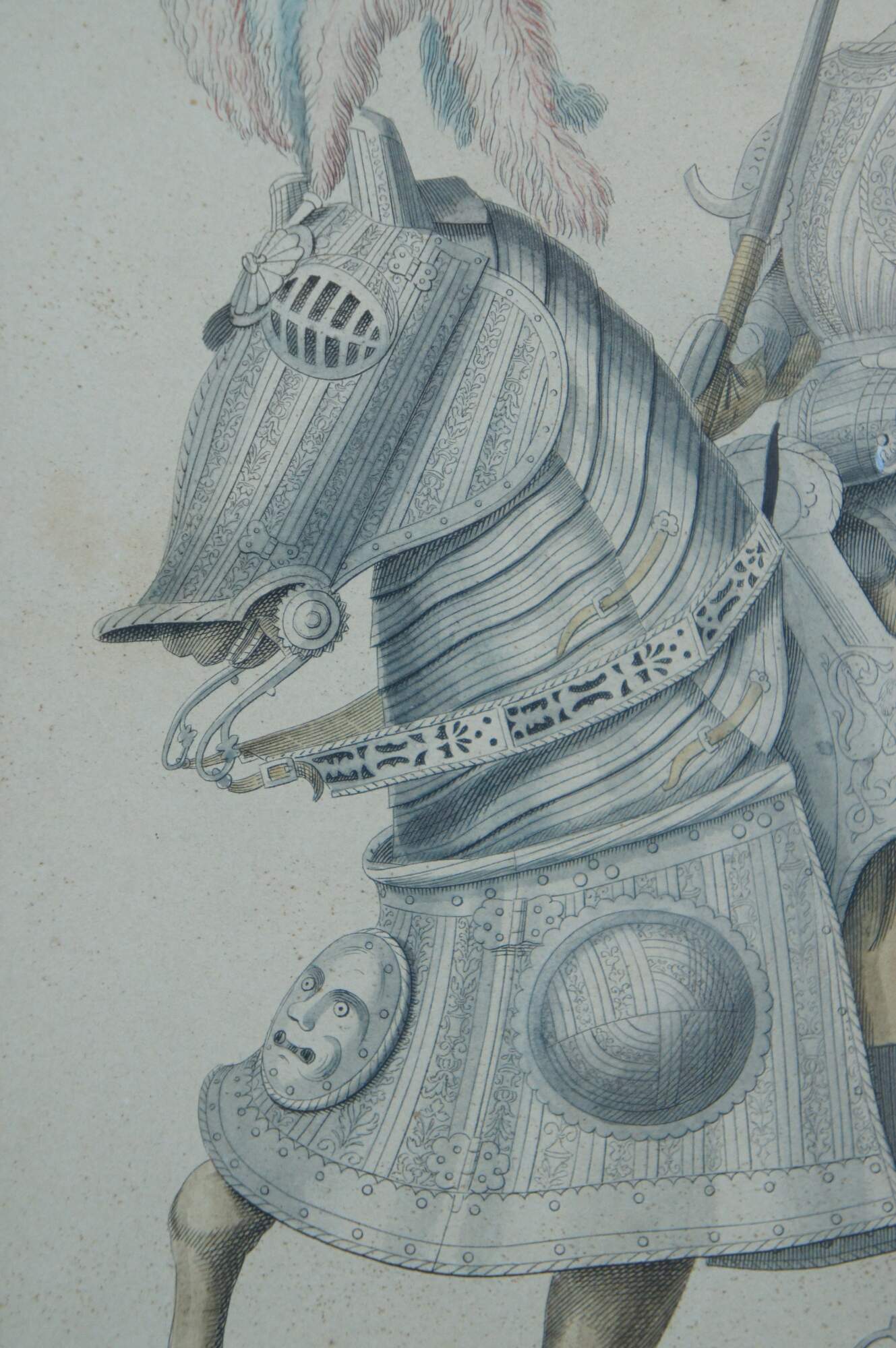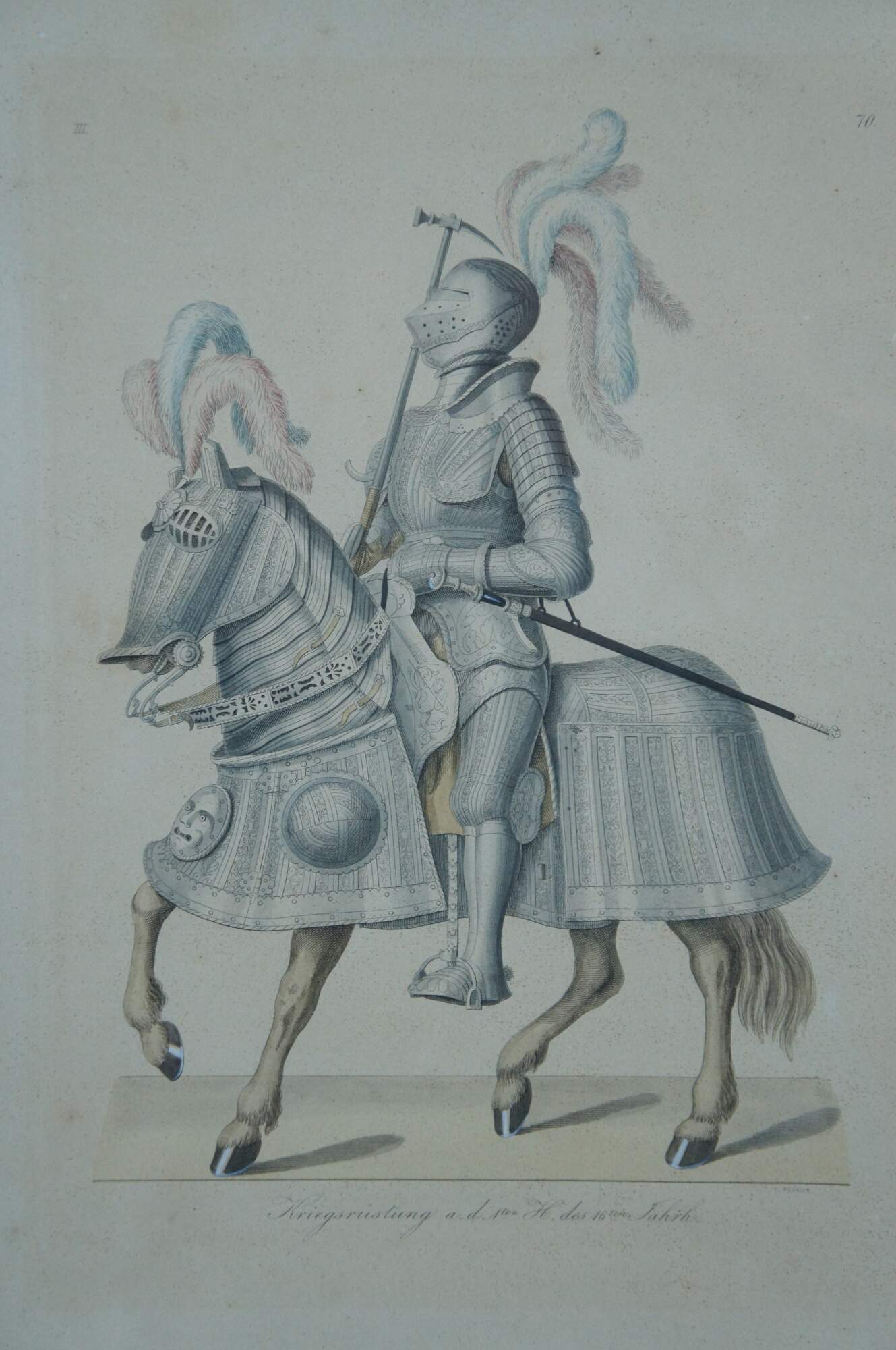 - Plate 70 - Kriegsrustung a.d.1 ten H. des 16 ten Jahrh (War Armour from the 1st century of the 16th Century - marked C. Regnier in lower right). Full suit of ornate armor for man and horse.. Chromolithograph from Jakob Heinrich von Hefner-Altenecks Costumes, Artworks and Appliances from the Middle Ages to the 17th Century, Frankfurt, 1889