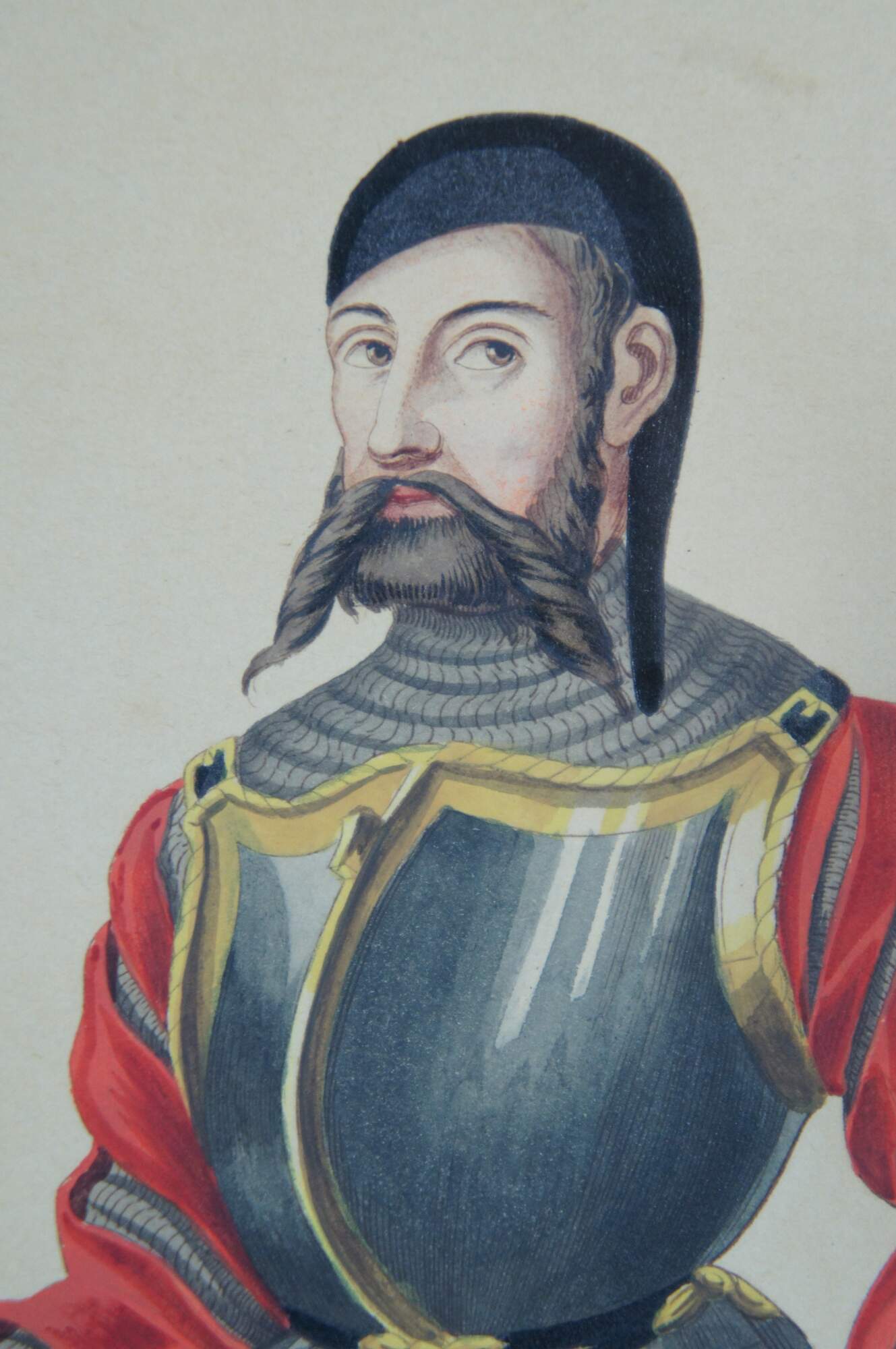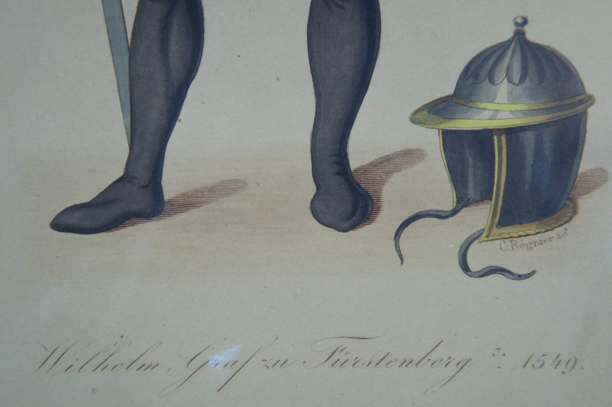 - Wilhelm, Grafzu Furstenberg + 1549 (Wilhelm, Count of Furstenberg, died 1549 - marked C. Regnier under helmet). Portrait of William IV, Count of Furstenberg, 1491-1549. He wears a black leather hood (worn under the helmet) and cuirass and cuisses in steel edged with brass. Under the armour is a chainmail tunic and red velvet doublet. He has a two-handed sword, a sword and dagger. An unusual helmet lies on the floor.