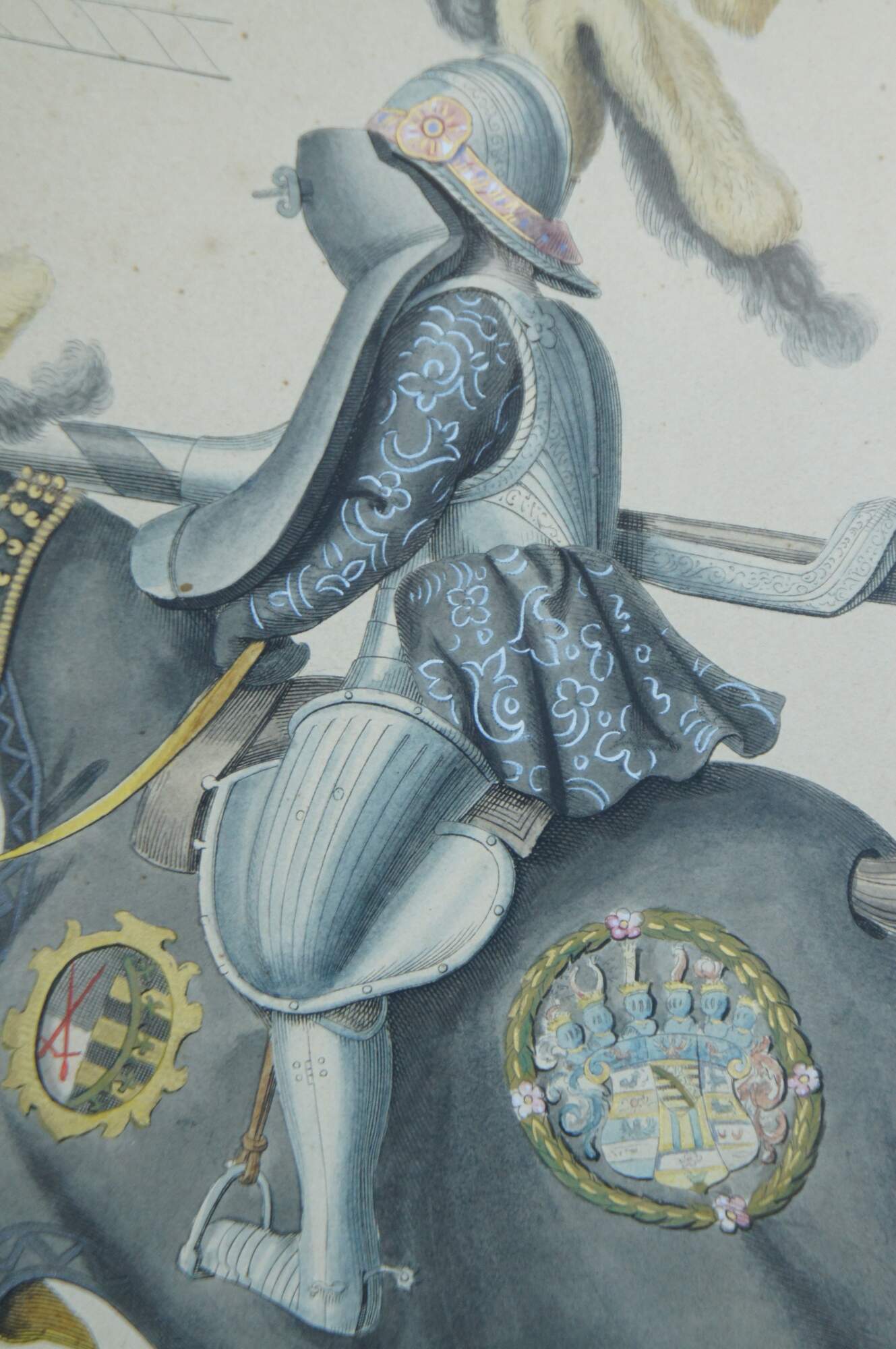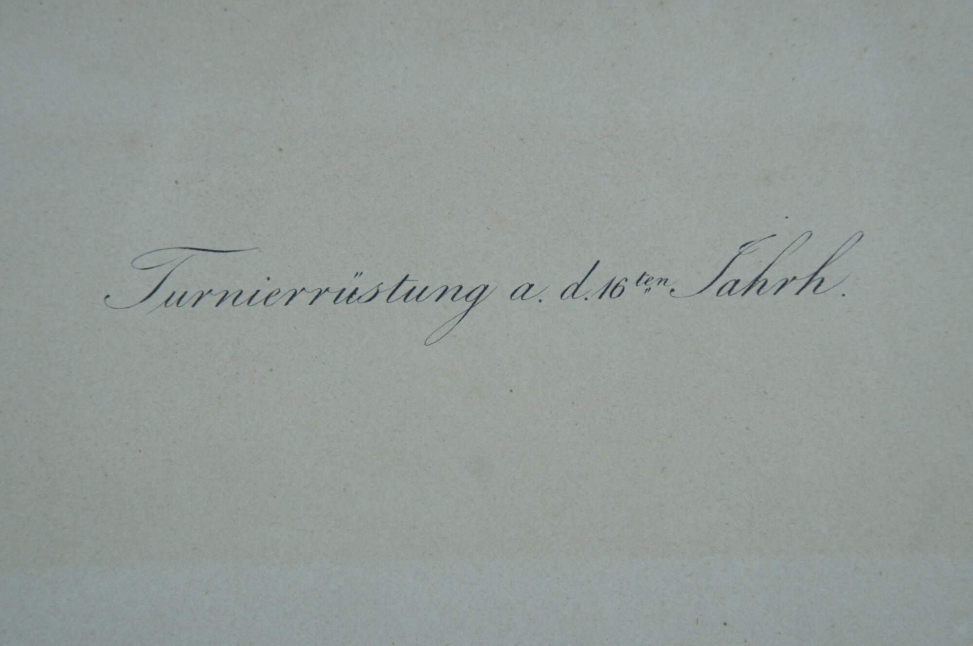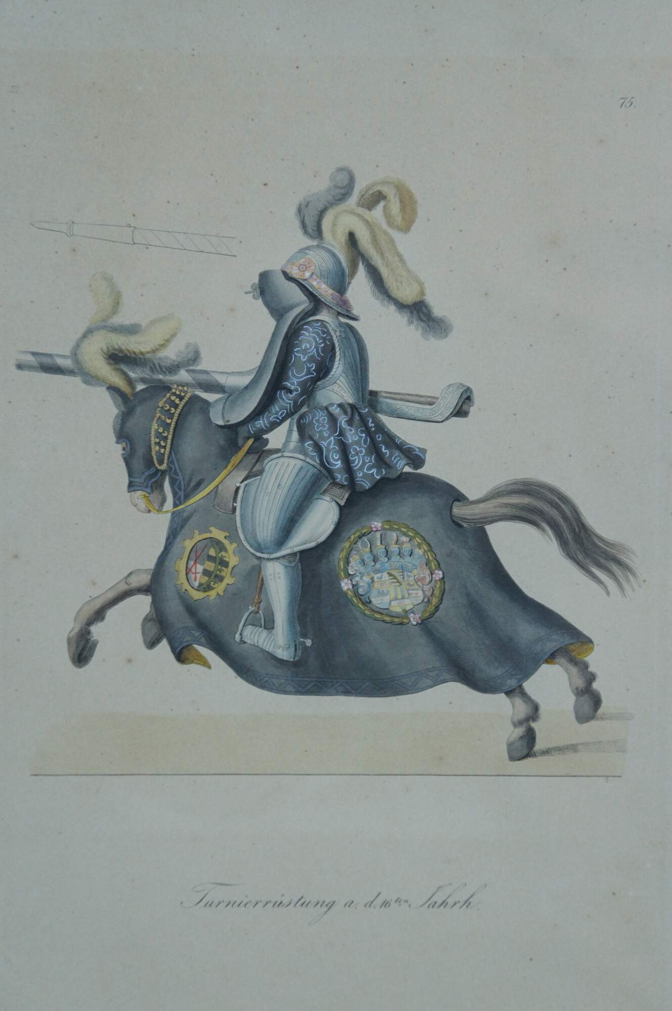 - Plate 75 - Turnierrustung a.d. 16ten Jarh (Tournament Armour 16th century - not specifically marked as engraved by C. Regnier). Brushed gunmetal frame; mottled charcoal gray mat. German knight in jousting armour, 16th century. This type of armour is particular to Scharfrennen or Feldrennen type jousts. He wears a kettle helmet retained from the 15th century, a bolted-on buckler and vizor protects the left side of the body, while the lance and vamplate protects the right. Leg armour (cuisses and greaves), and horse in caparison. From a suit of armour in Dresden Museum of History. Chromolithograph from Hefner-Alteneck's "Costumes, Artworks and Appliances from the Middle Ages to the 17th Century," Frankfurt, 1889. Dr. Jakob Heinrich von Hefner-Alteneck (1811-1903