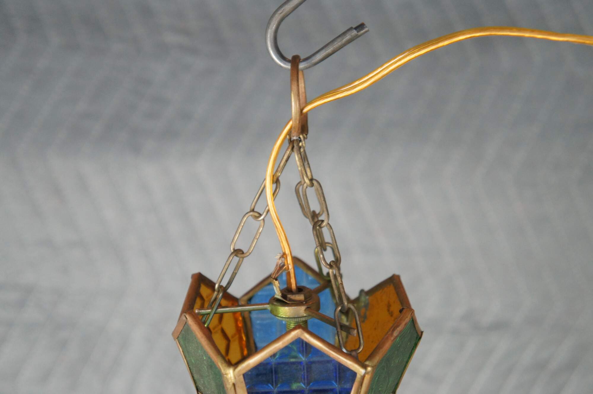 Late 20th Century Moroccan / Moorish Lantern. Made from brass with pierced / reticulated panels and colofrul slag glass. A nice pendant or swag lamp for any setting.