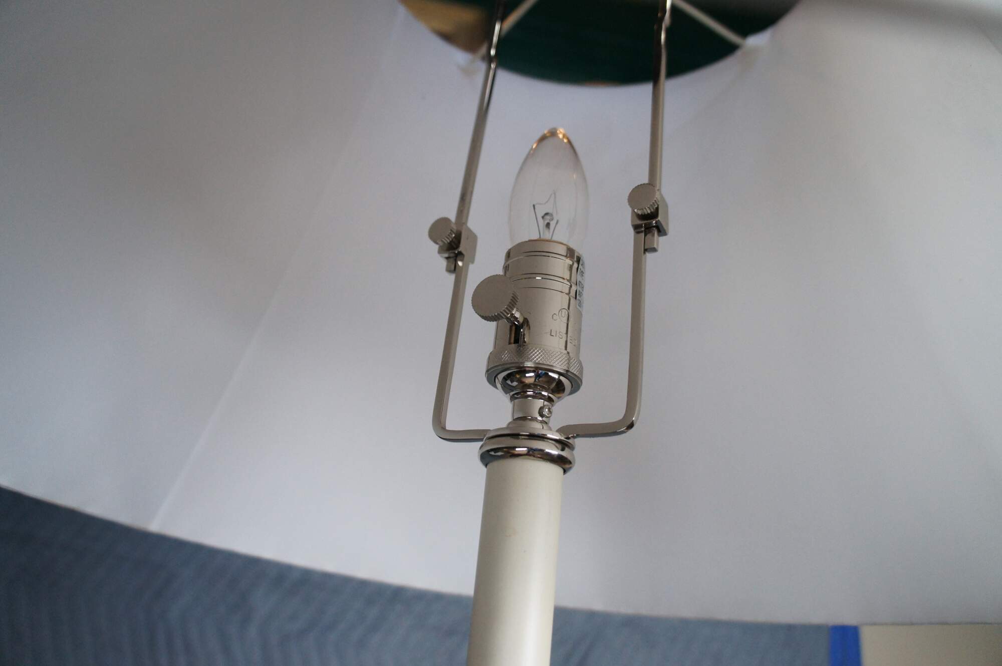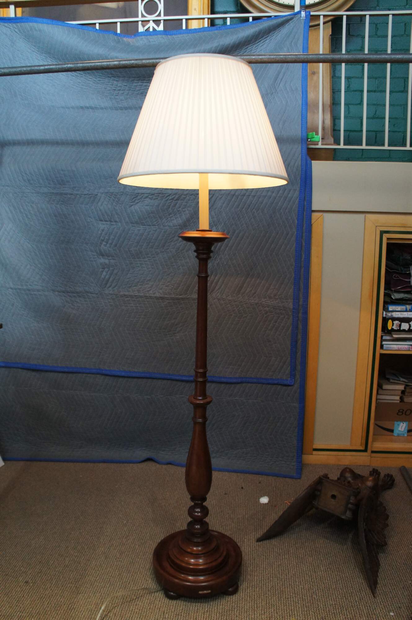 A traditional rich brown mahogany floor lamp by Ralph Lauren. The lamp is in the form of a large Early American / Colonial candle stand with candlestick center and adjustable harp allowing the shade to be raised / lowered. Features a baluster turned center over a round base with bun feet. The Harp is Chrome and the shade is pleated silk. A timeless classic that will make a warm addition to any space.