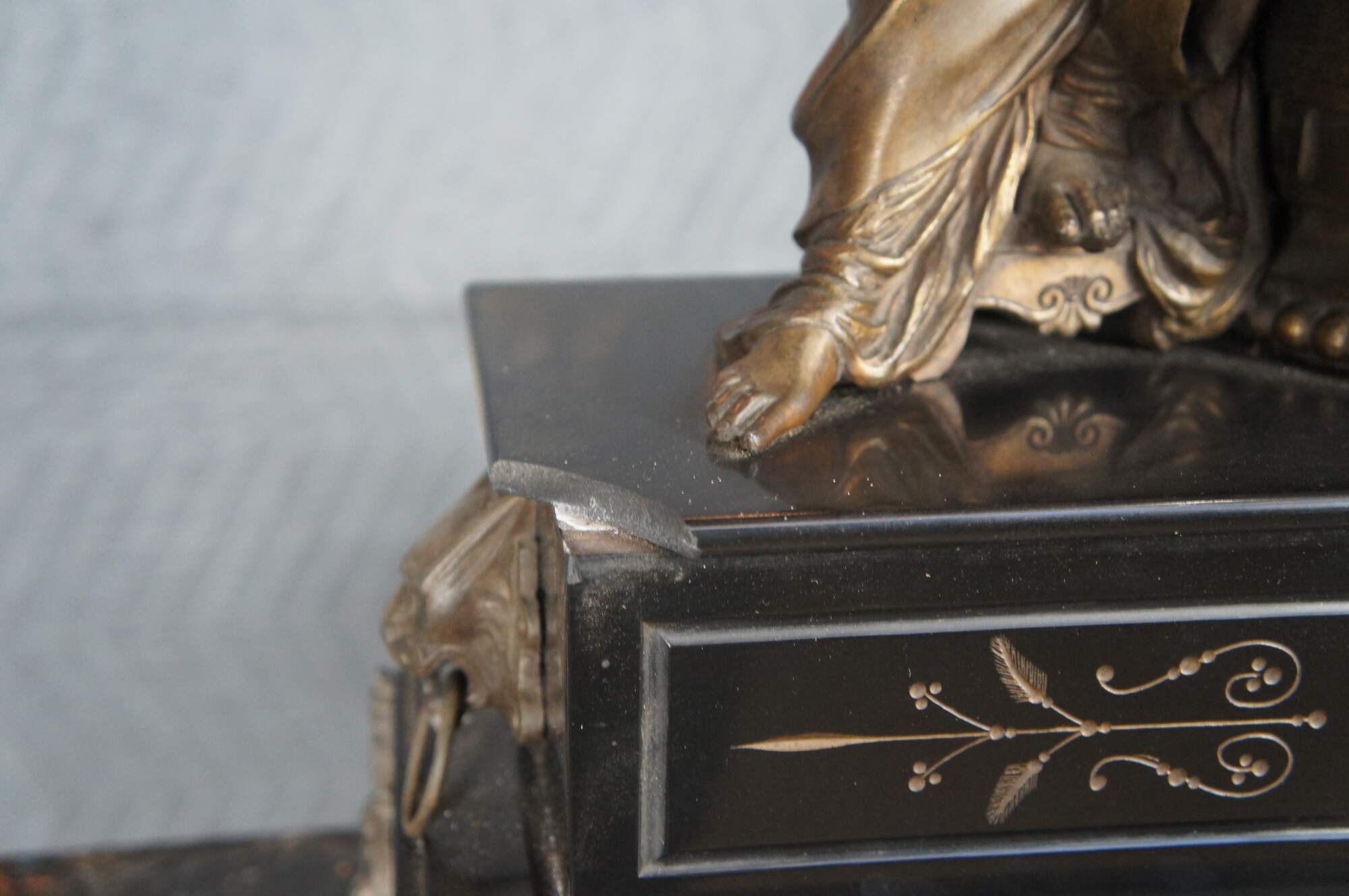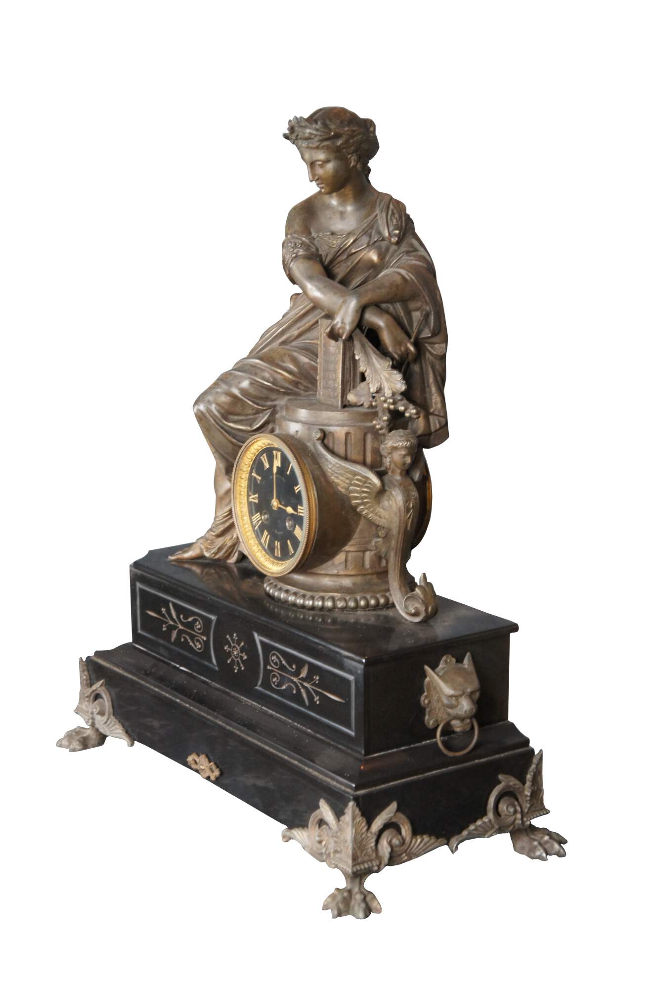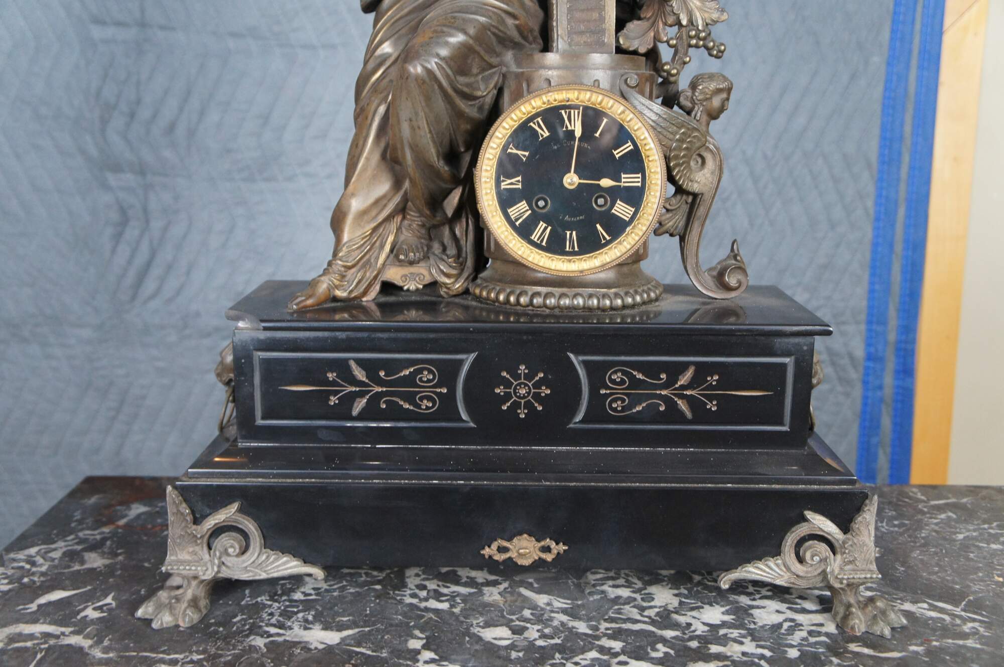 A spectacular French Mantel Clock with dated works marked 1858. The works Are Marked V & E with a Figured Bee between the two letters. The bell is inscribed Moreau, so the Clio figure may have been done By Auguste Moreau. The figure is Clio, the Muse of History. She rests at the center on top of a column, arms over a book with foliate in her hands. Features a winged and scrolled caryatid support on the right side of the column. The clock and works are housed within the column. The slate face with Roman numerals is marked Le Curieux & Aucerre. The works and sculptural portion of the clock are mounted to a tiered plinth base, ornately engraved along the front and features gargoyle knockers along the sides. The base is raised over scrolled paw feet. A highly artisan stylized clock that will make a nice addition to any space.