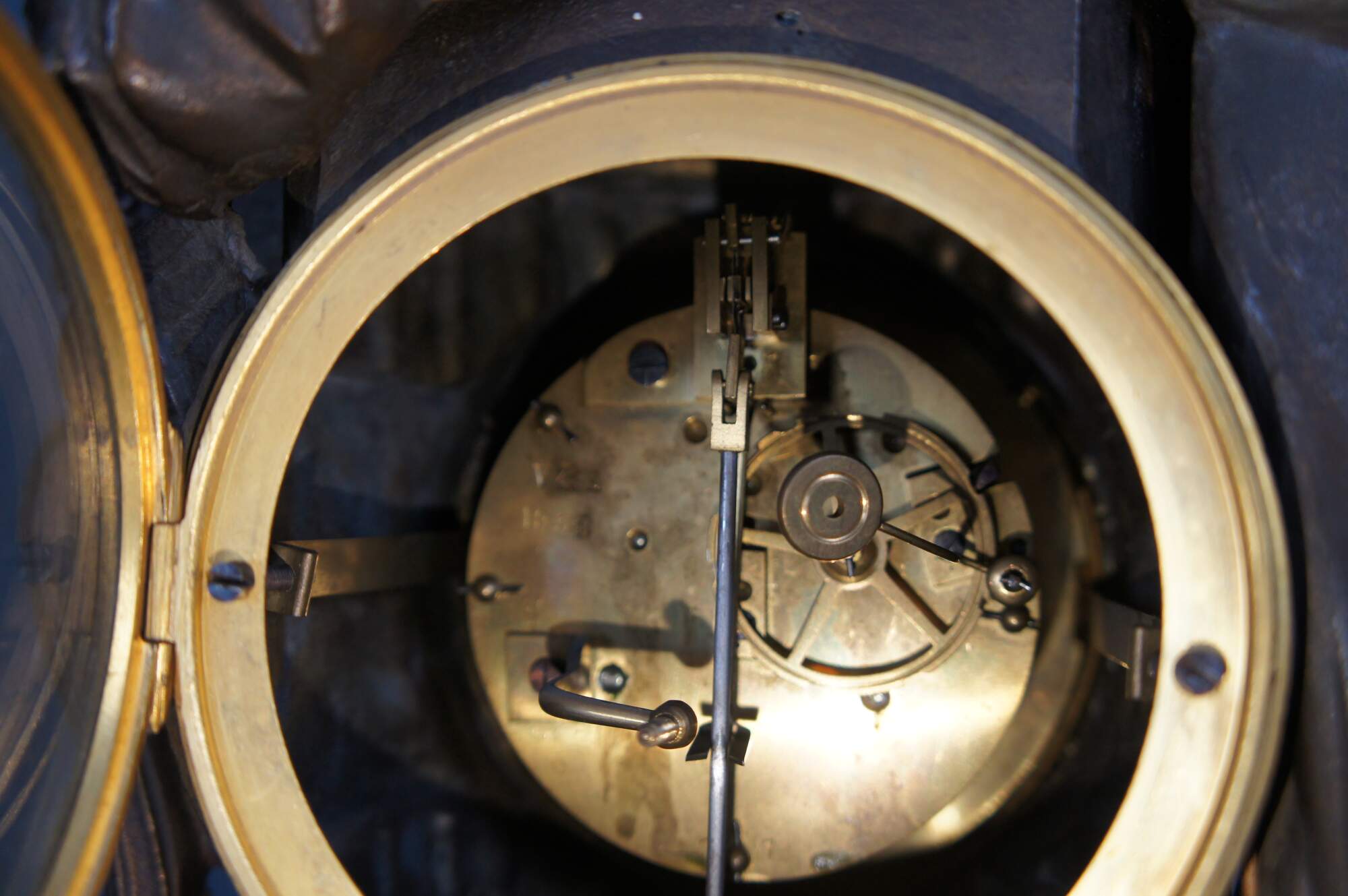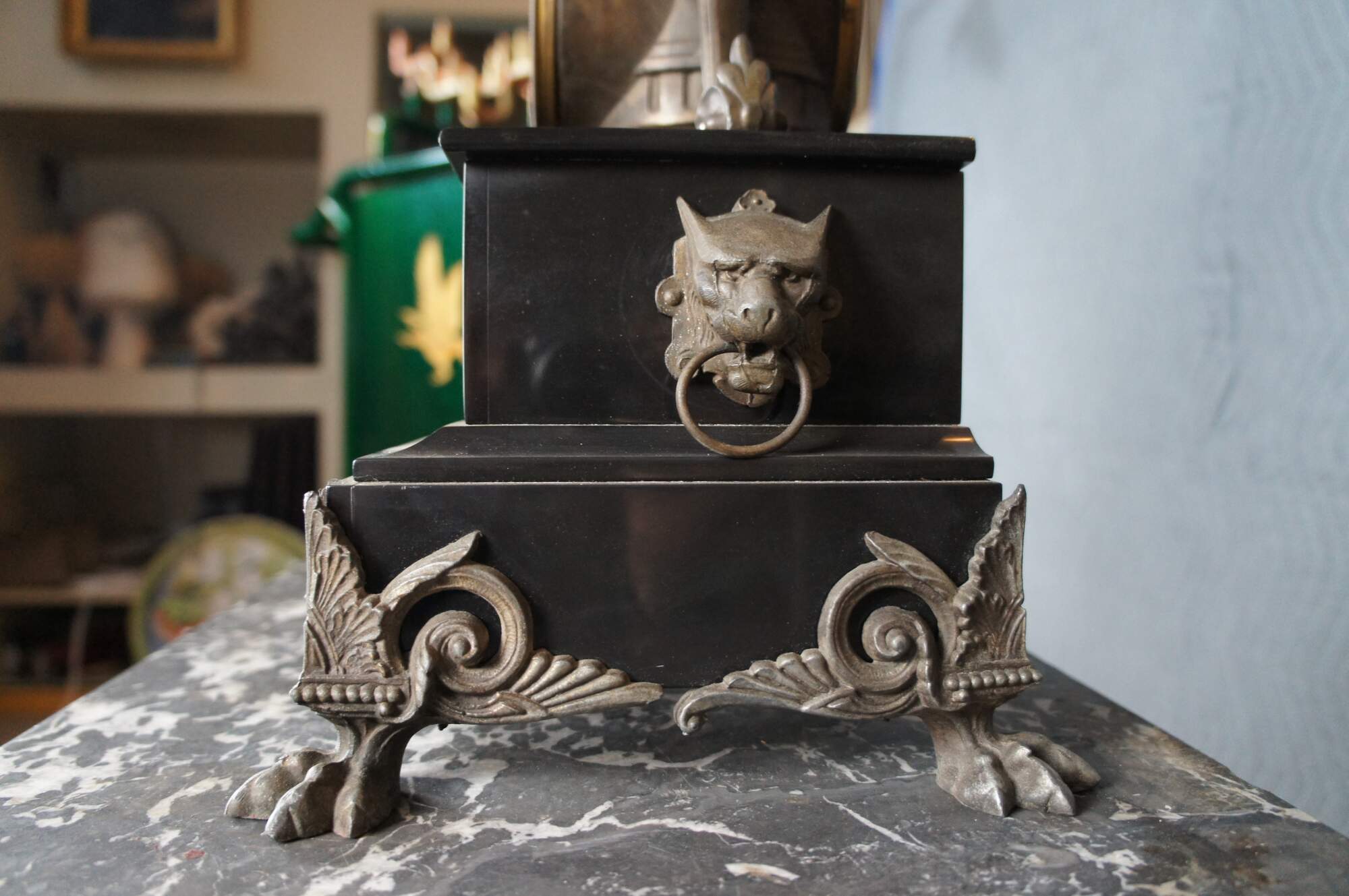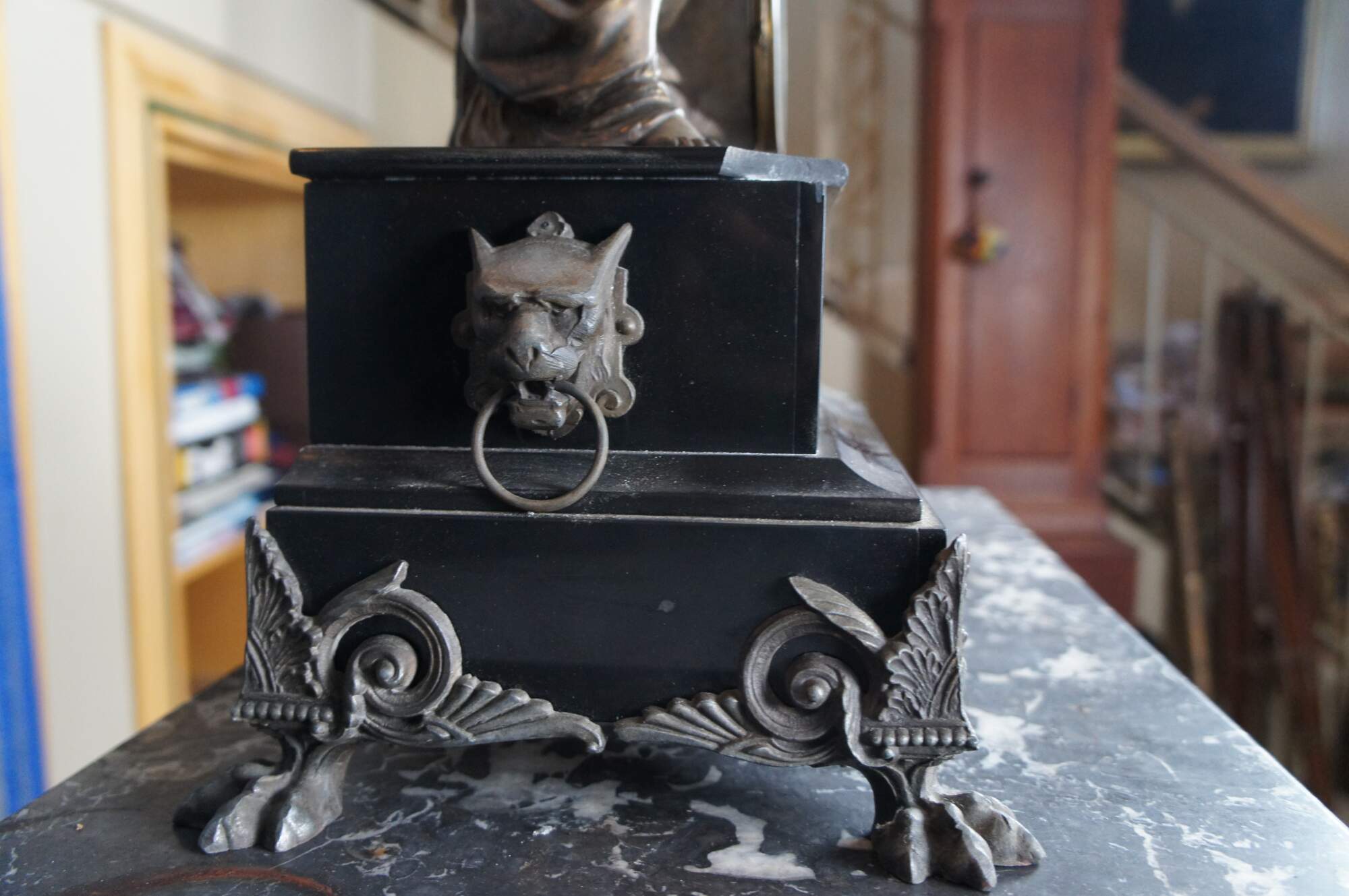 A spectacular French Mantel Clock with dated works marked 1858. The works Are Marked V & E with a Figured Bee between the two letters. The bell is inscribed Moreau, so the Clio figure may have been done By Auguste Moreau. The figure is Clio, the Muse of History. She rests at the center on top of a column, arms over a book with foliate in her hands. Features a winged and scrolled caryatid support on the right side of the column. The clock and works are housed within the column. The slate face with Roman numerals is marked Le Curieux & Aucerre. The works and sculptural portion of the clock are mounted to a tiered plinth base, ornately engraved along the front and features gargoyle knockers along the sides. The base is raised over scrolled paw feet. A highly artisan stylized clock that will make a nice addition to any space.