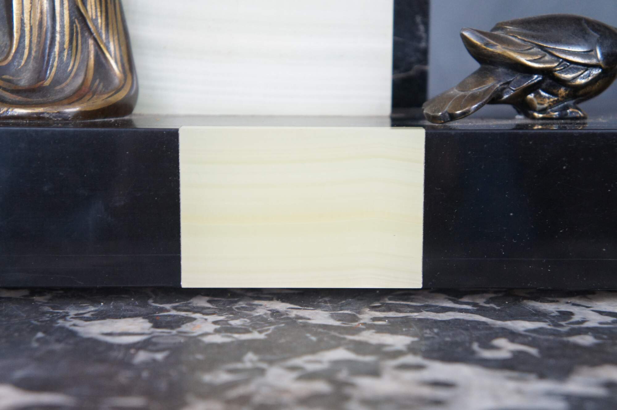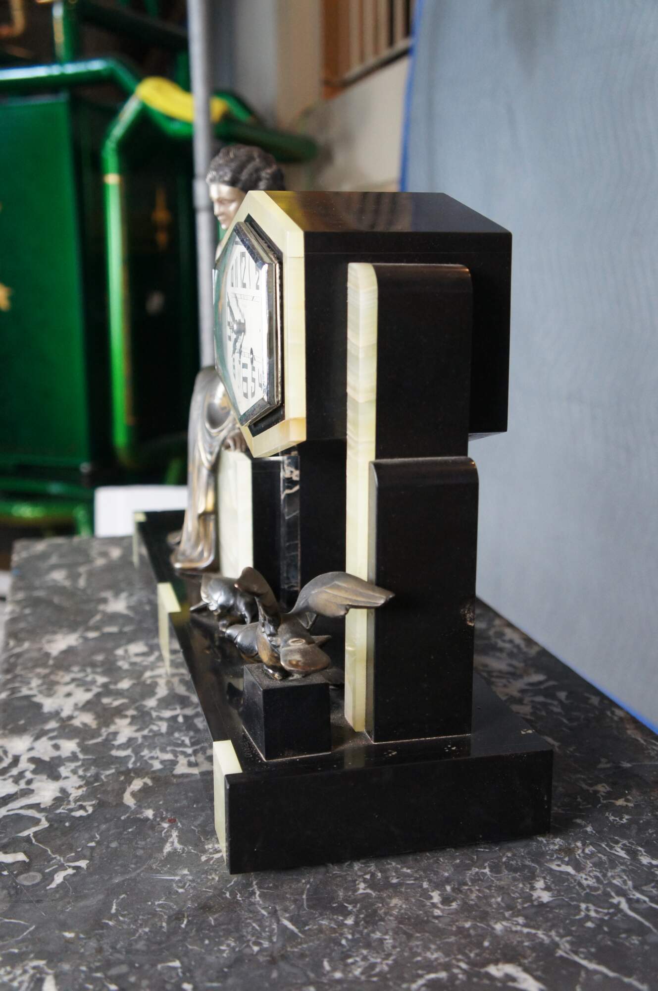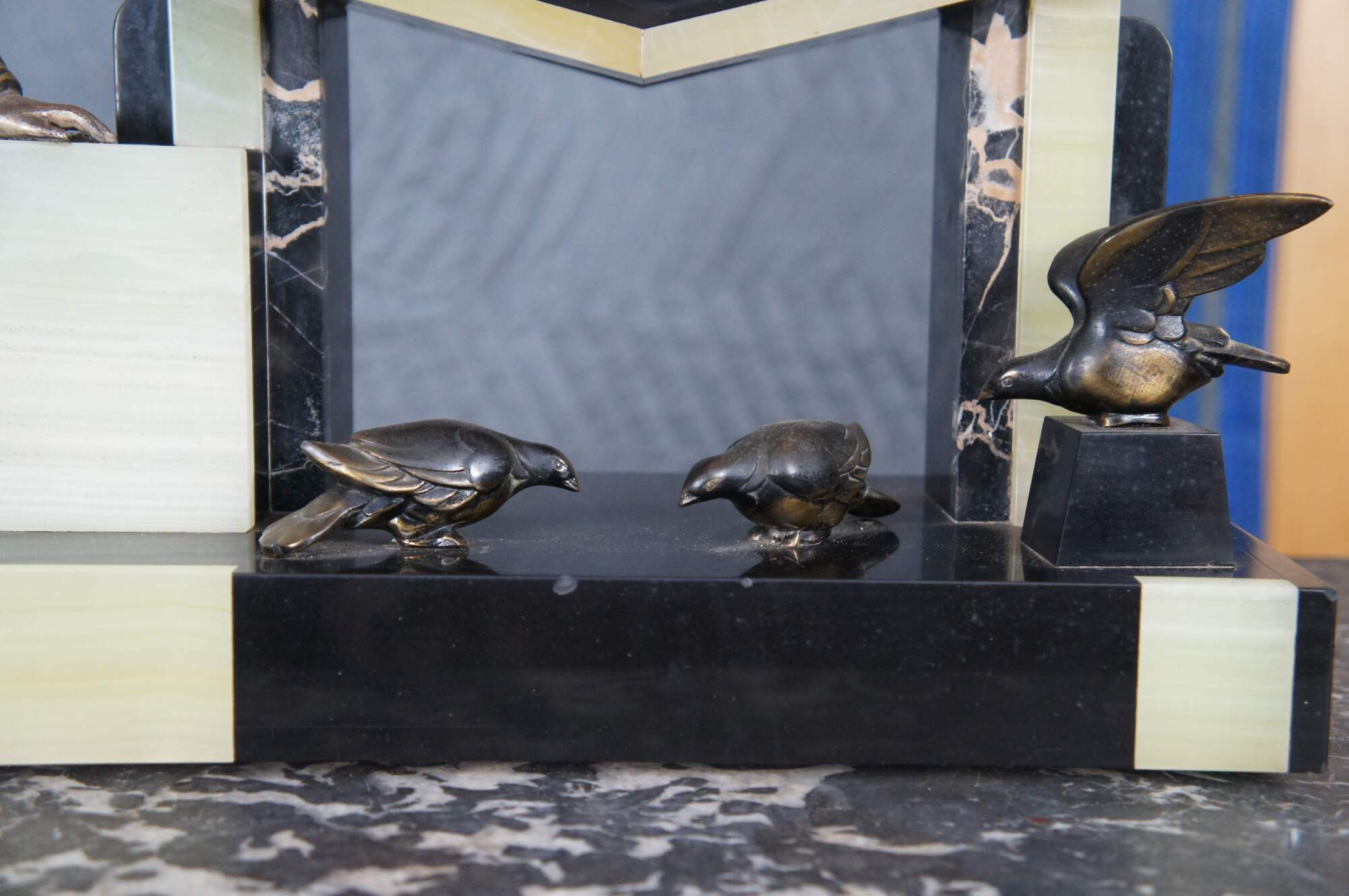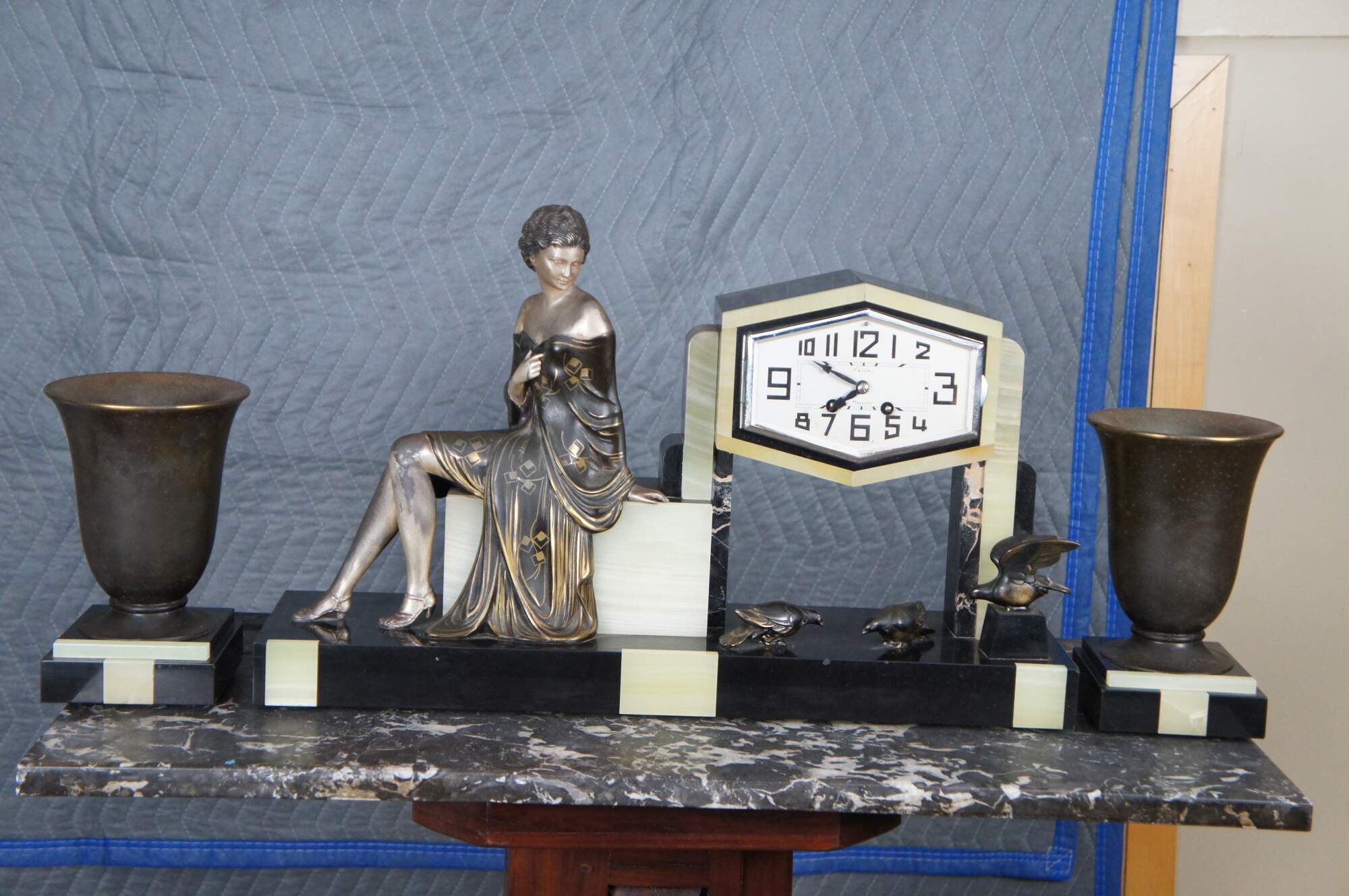 An exceptional and difficult to find Art Deco Garniture Clock Set depicting a young lady looking down at birds below. Set between lovely Garnitures of cups or vases with tapered shapes on matching bases. A beautifully detailed piece of the finest quality attribiuted to Famous Artist of Art Deco period- Uriano. Sculptures of the lady and birds are cast in spelter, mounted on a high end design marble and onyx clock case. Works Marked Fini Paris, J.S. 28952