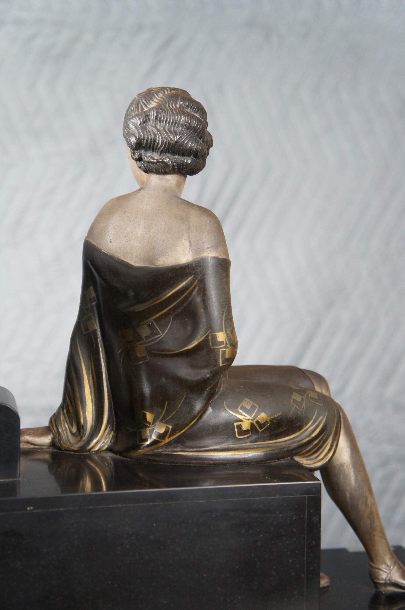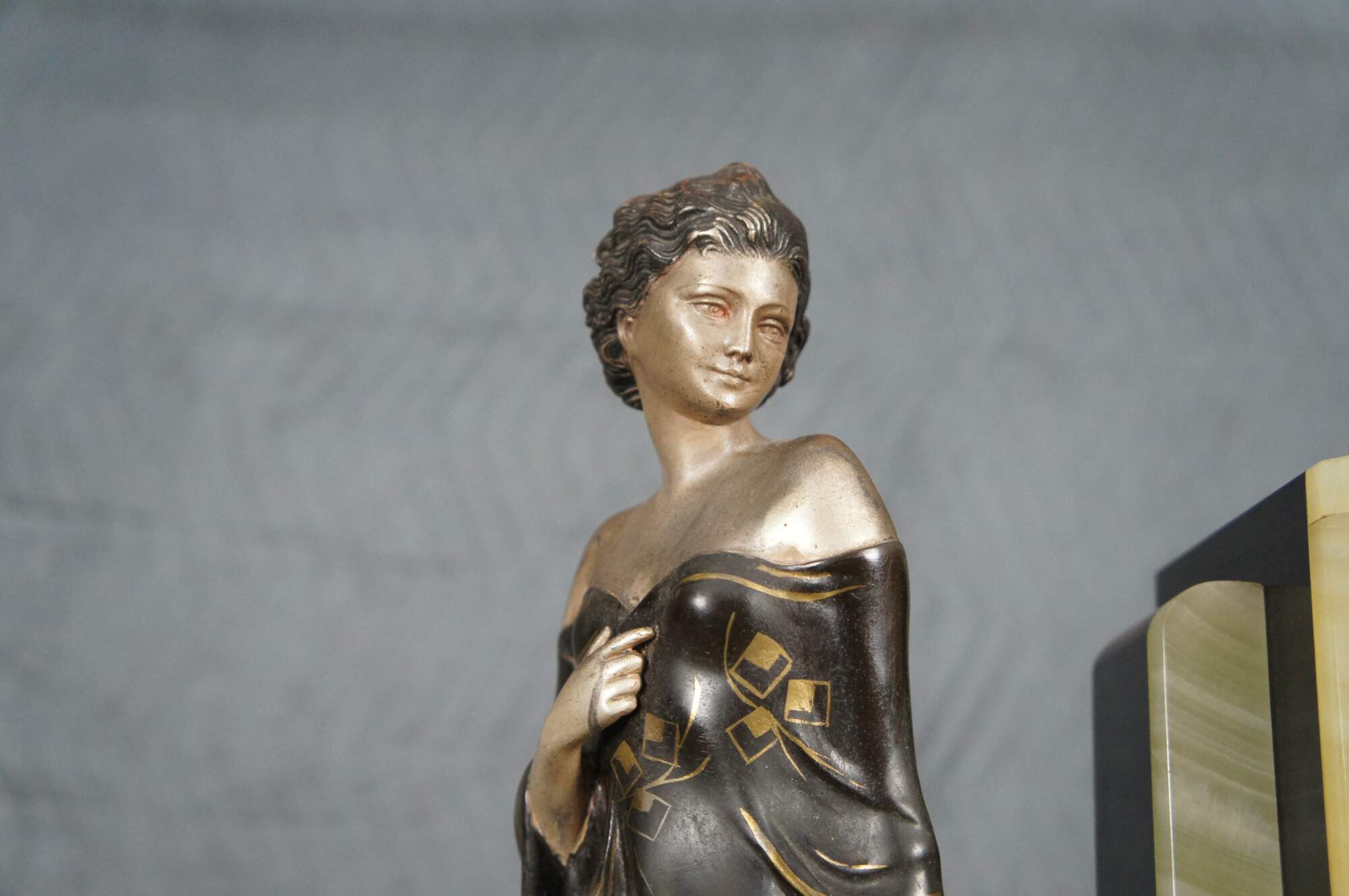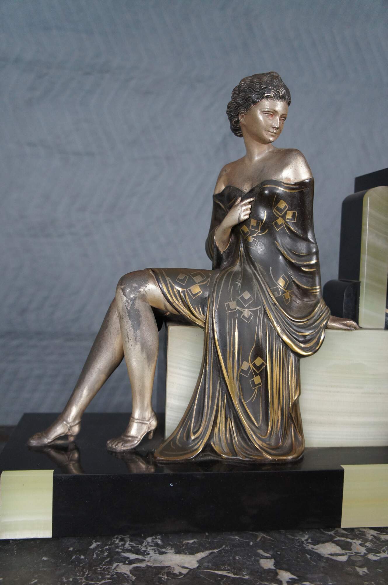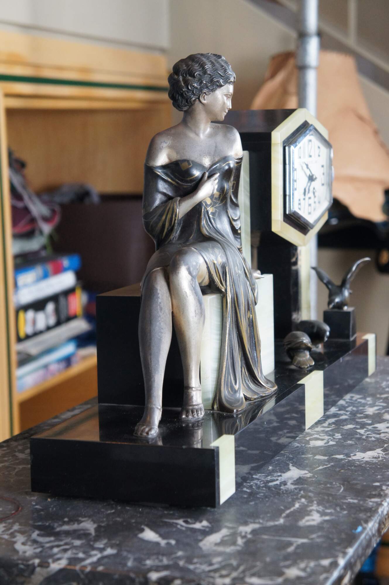 An exceptional and difficult to find Art Deco Garniture Clock Set depicting a young lady looking down at birds below. Set between lovely Garnitures of cups or vases with tapered shapes on matching bases. A beautifully detailed piece of the finest quality attribiuted to Famous Artist of Art Deco period- Uriano. Sculptures of the lady and birds are cast in spelter, mounted on a high end design marble and onyx clock case. Works Marked Fini Paris, J.S. 28952