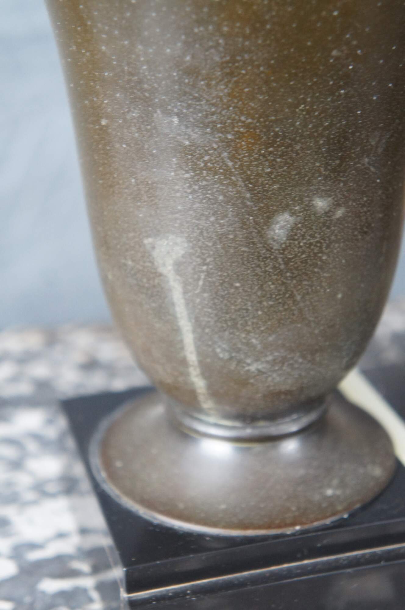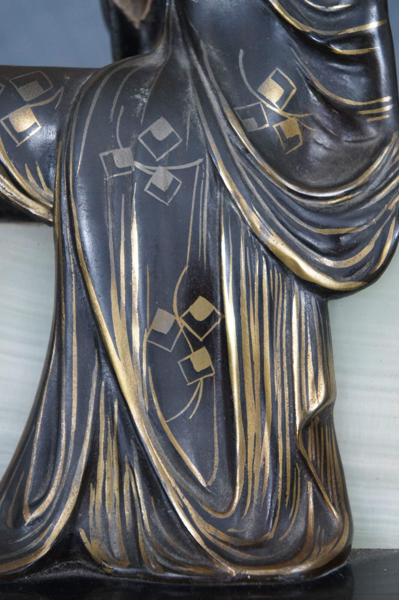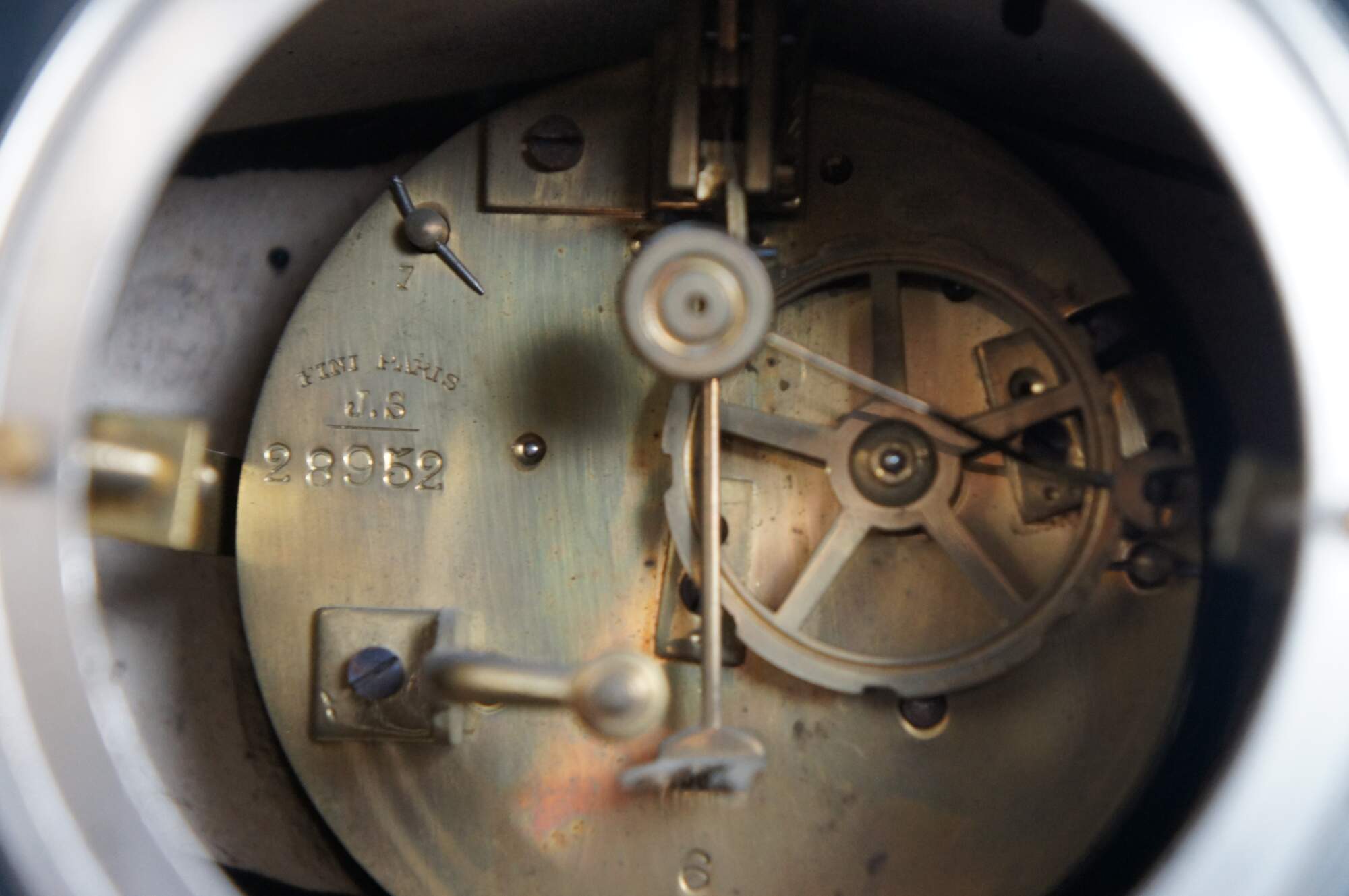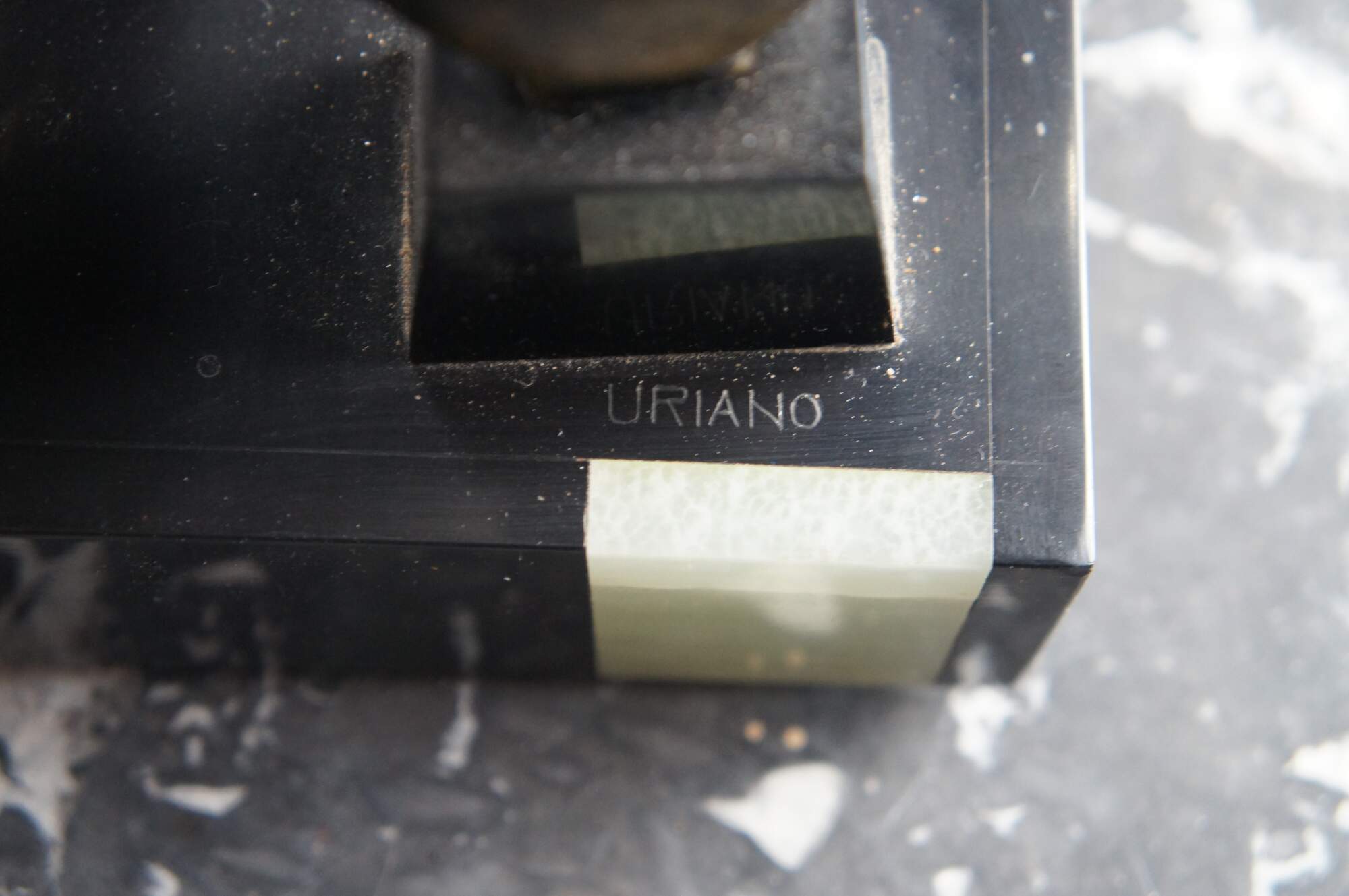 An exceptional and difficult to find Art Deco Garniture Clock Set depicting a young lady looking down at birds below. Set between lovely Garnitures of cups or vases with tapered shapes on matching bases. A beautifully detailed piece of the finest quality attribiuted to Famous Artist of Art Deco period- Uriano. Sculptures of the lady and birds are cast in spelter, mounted on a high end design marble and onyx clock case. Works Marked Fini Paris, J.S. 28952