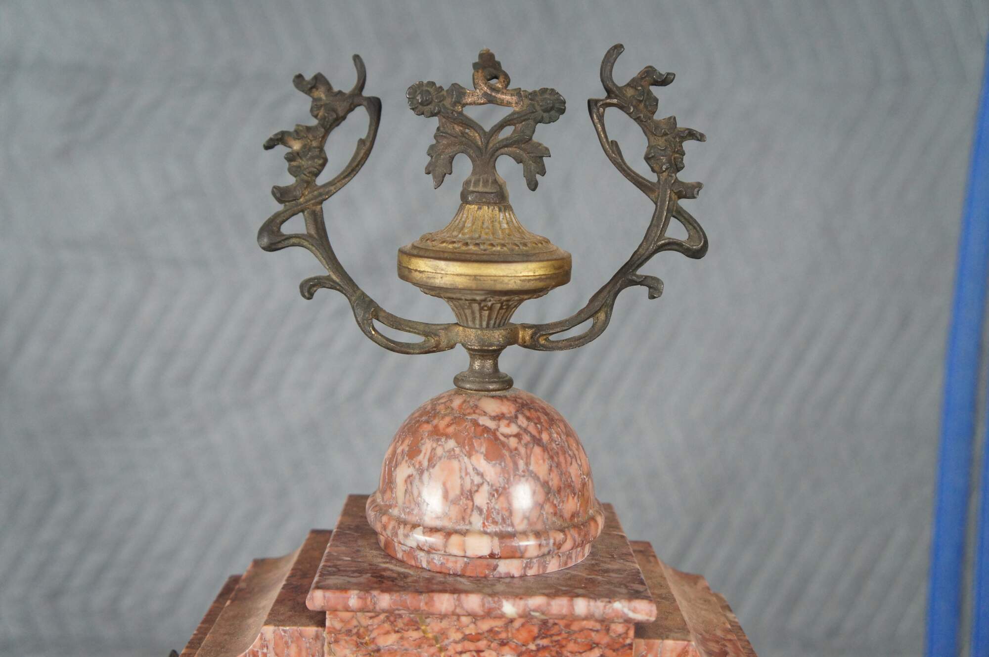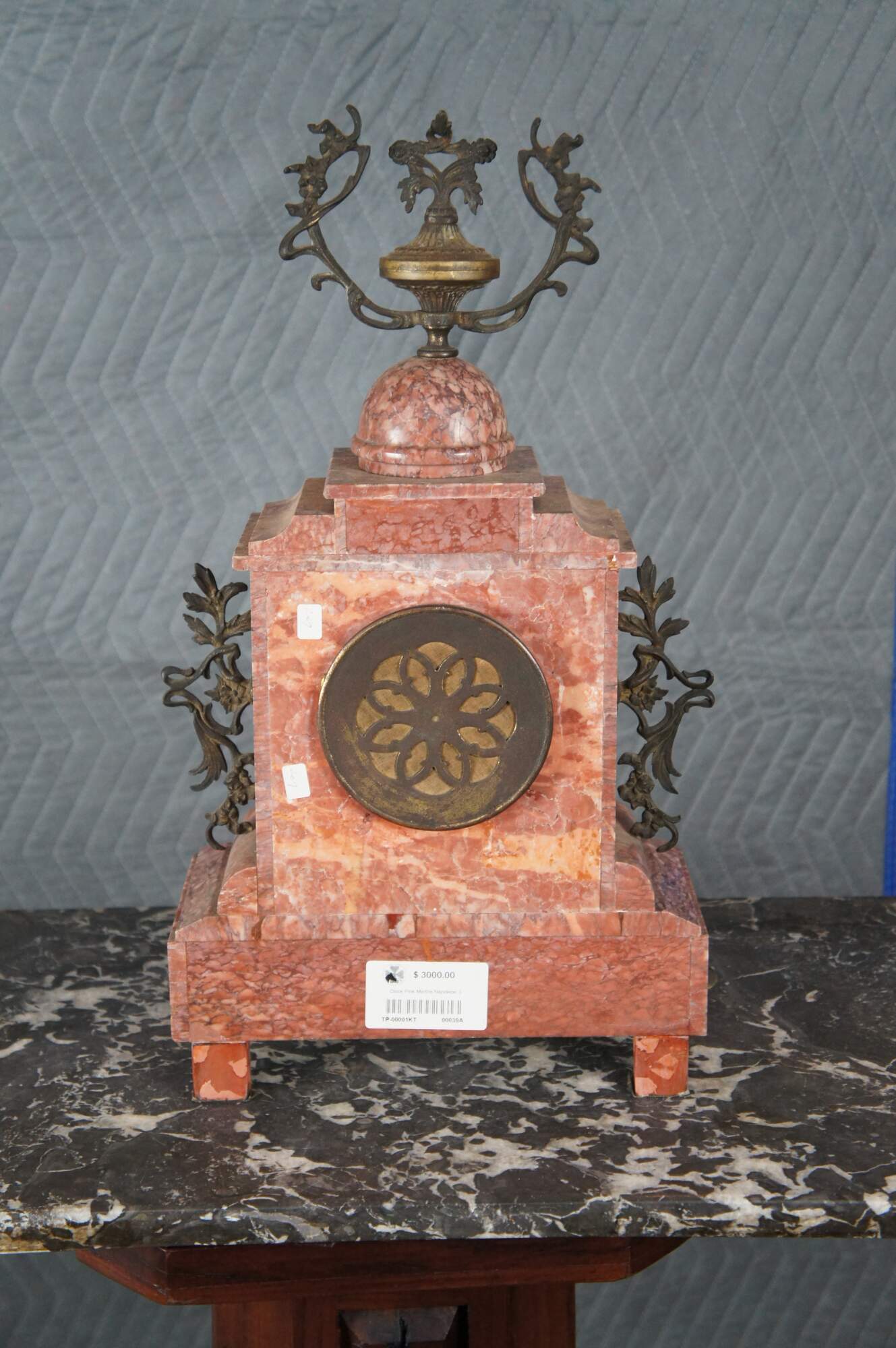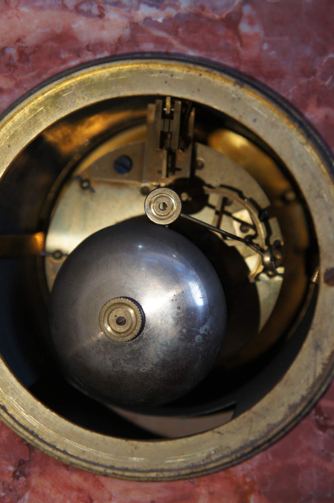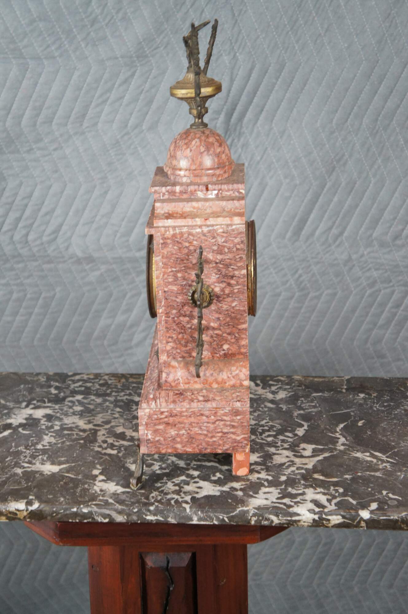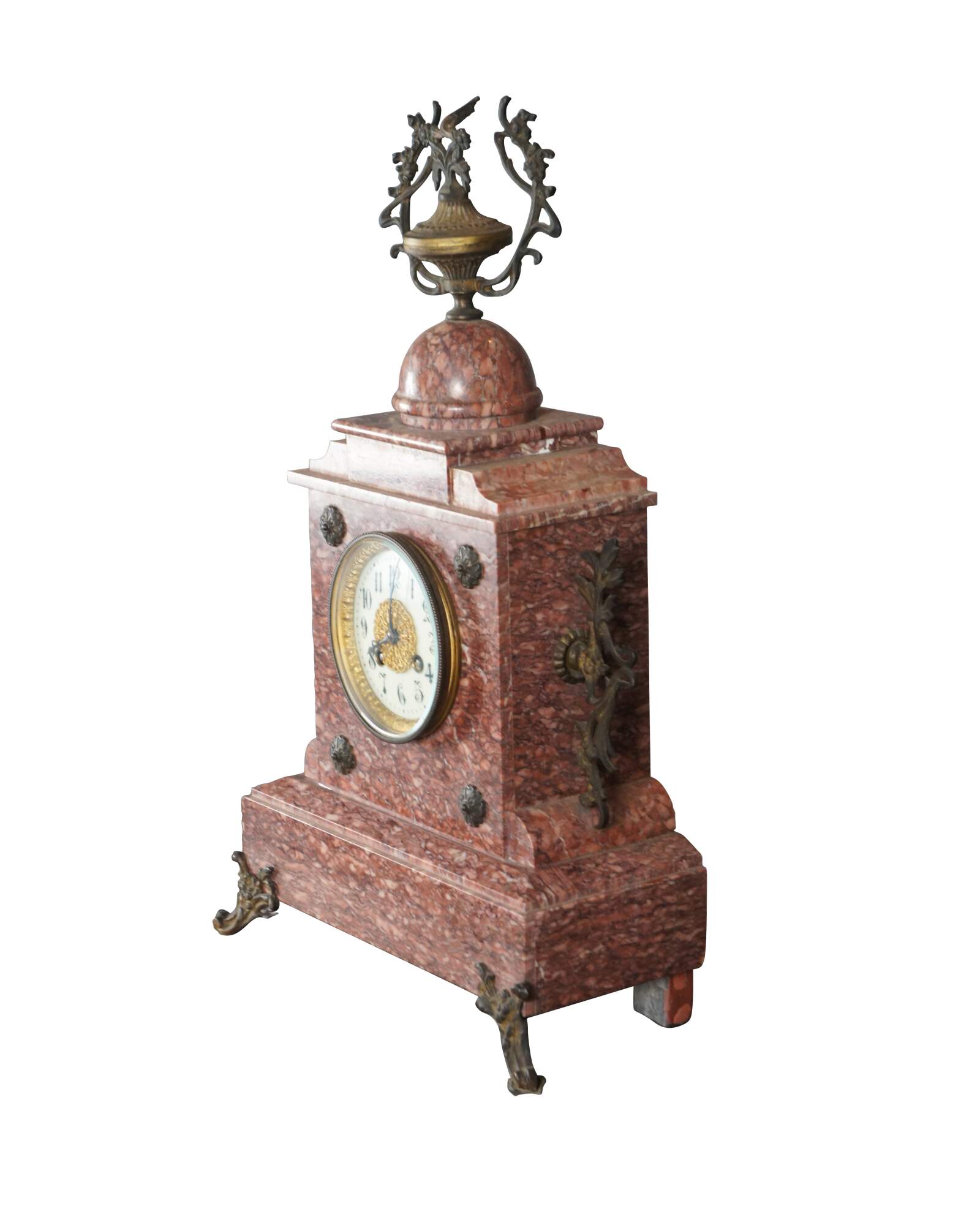 An antique 19th Century mantel Clock. Made from Rouge marble with bronze ormolu. Ornately designed with gold filigree face, a stepped base, footed over downswept legs. Features ornate medallions along the front and bronze motifs.