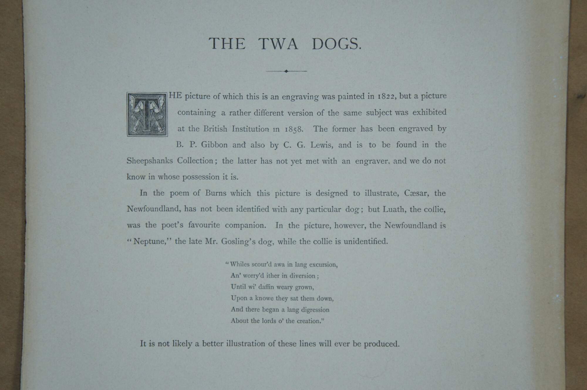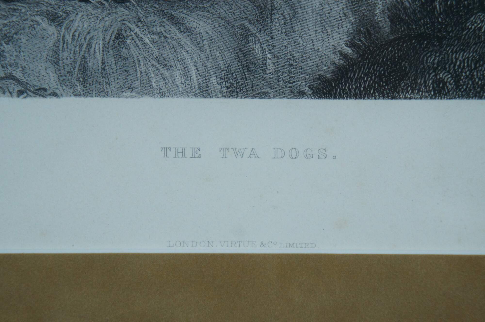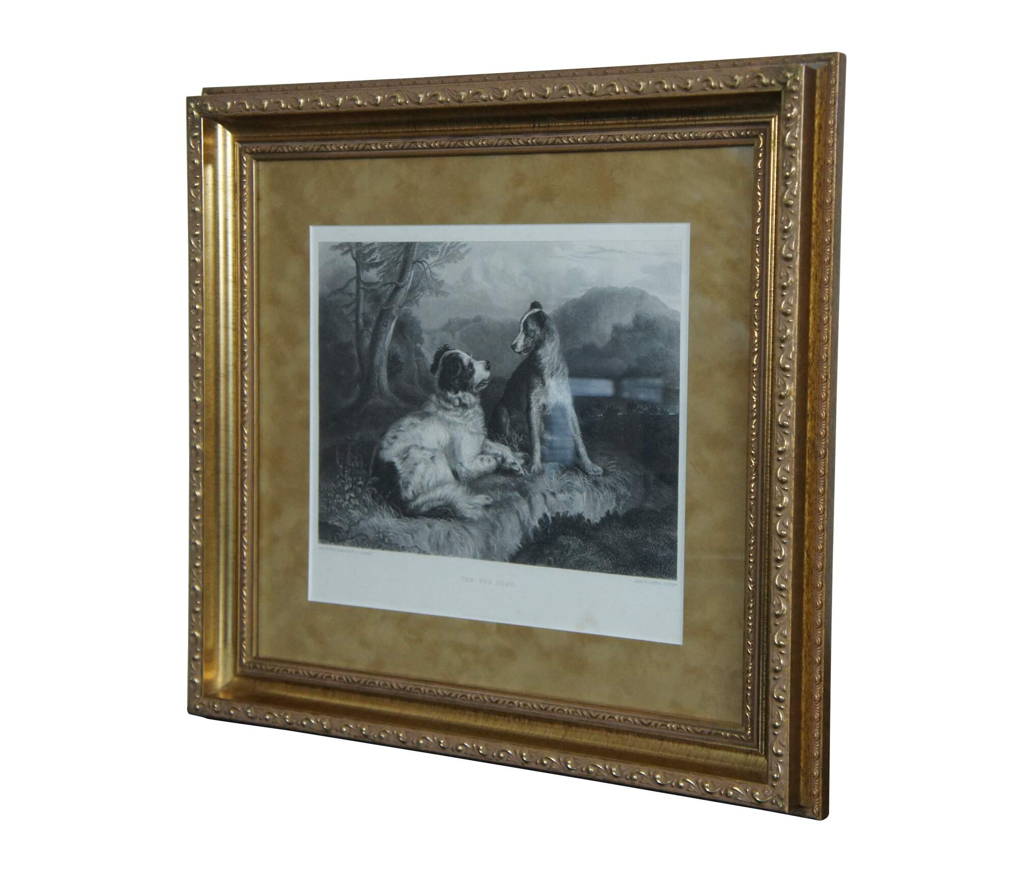 Late 19th century engraving of "The Twa Dogs" (Scottish for The Two Dogs) by Sir Edwin Landseer, inspired by a poem of the same name by Robert Burns, engraved by Charles G. Lewis. Shows a collie and a Newfoundland seated together in a picturesque landscape. Published by Virtue & Company, London. Beveled giltwood frame with scrolling/scalloped carved details; brown mat.