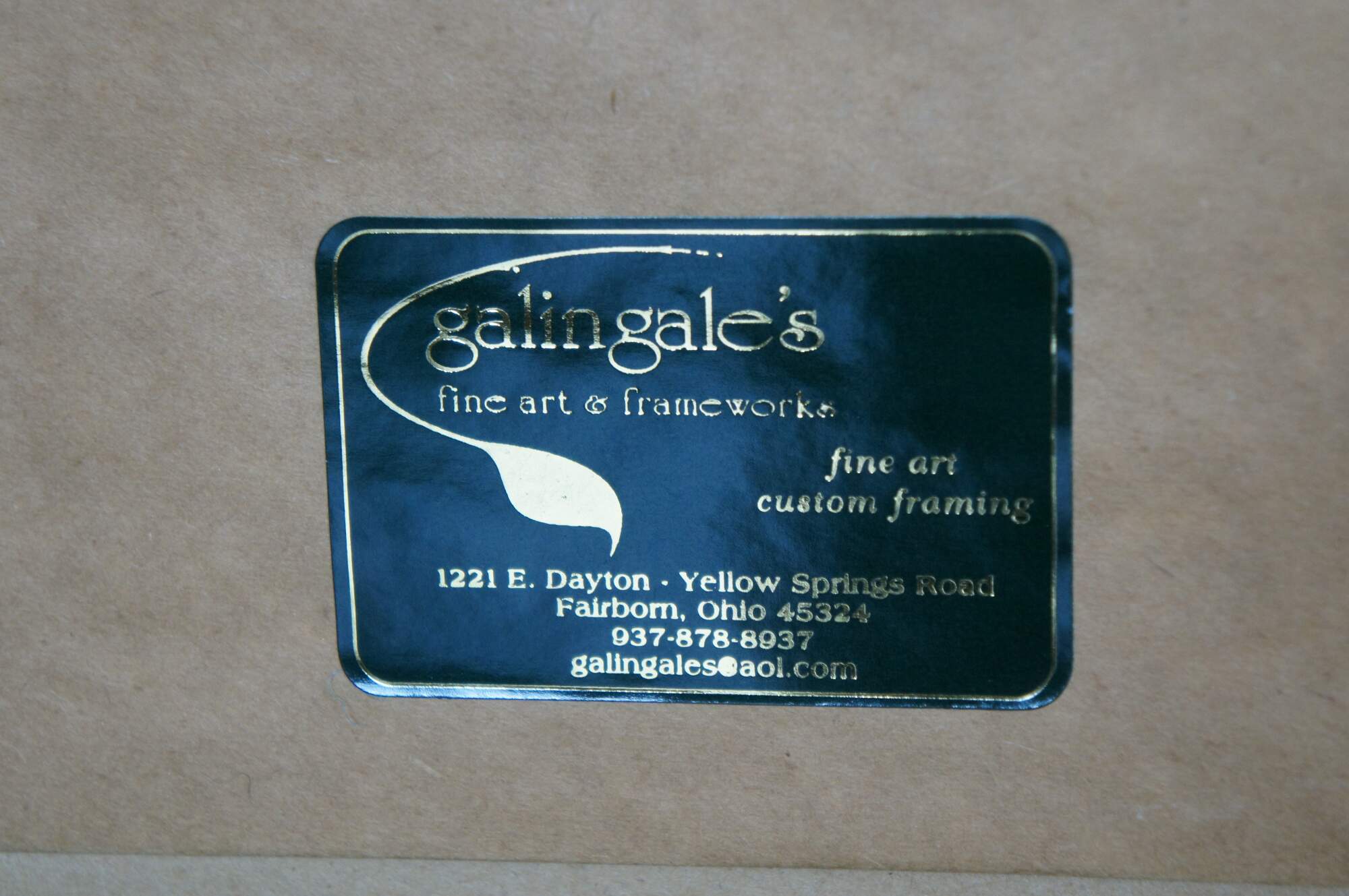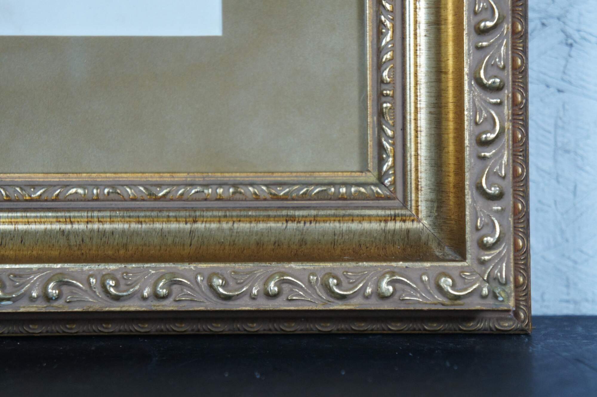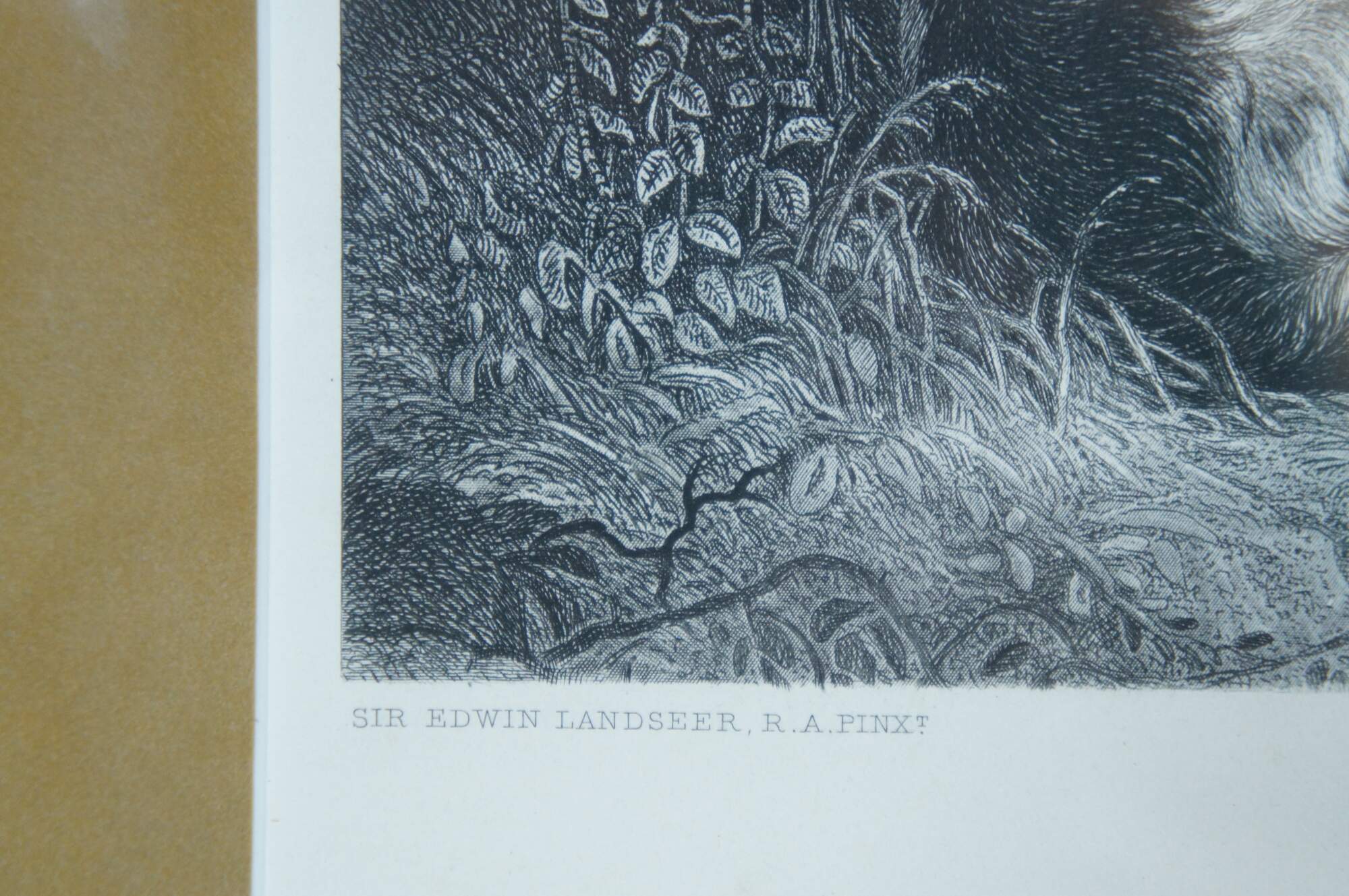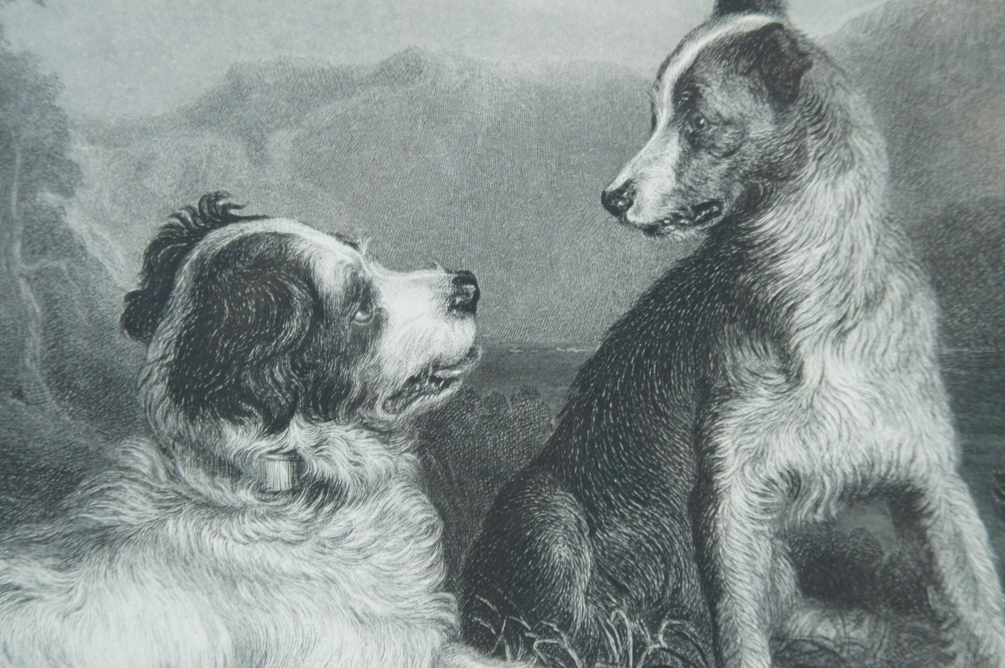 Late 19th century engraving of "The Twa Dogs" (Scottish for The Two Dogs) by Sir Edwin Landseer, inspired by a poem of the same name by Robert Burns, engraved by Charles G. Lewis. Shows a collie and a Newfoundland seated together in a picturesque landscape. Published by Virtue & Company, London. Beveled giltwood frame with scrolling/scalloped carved details; brown mat.
