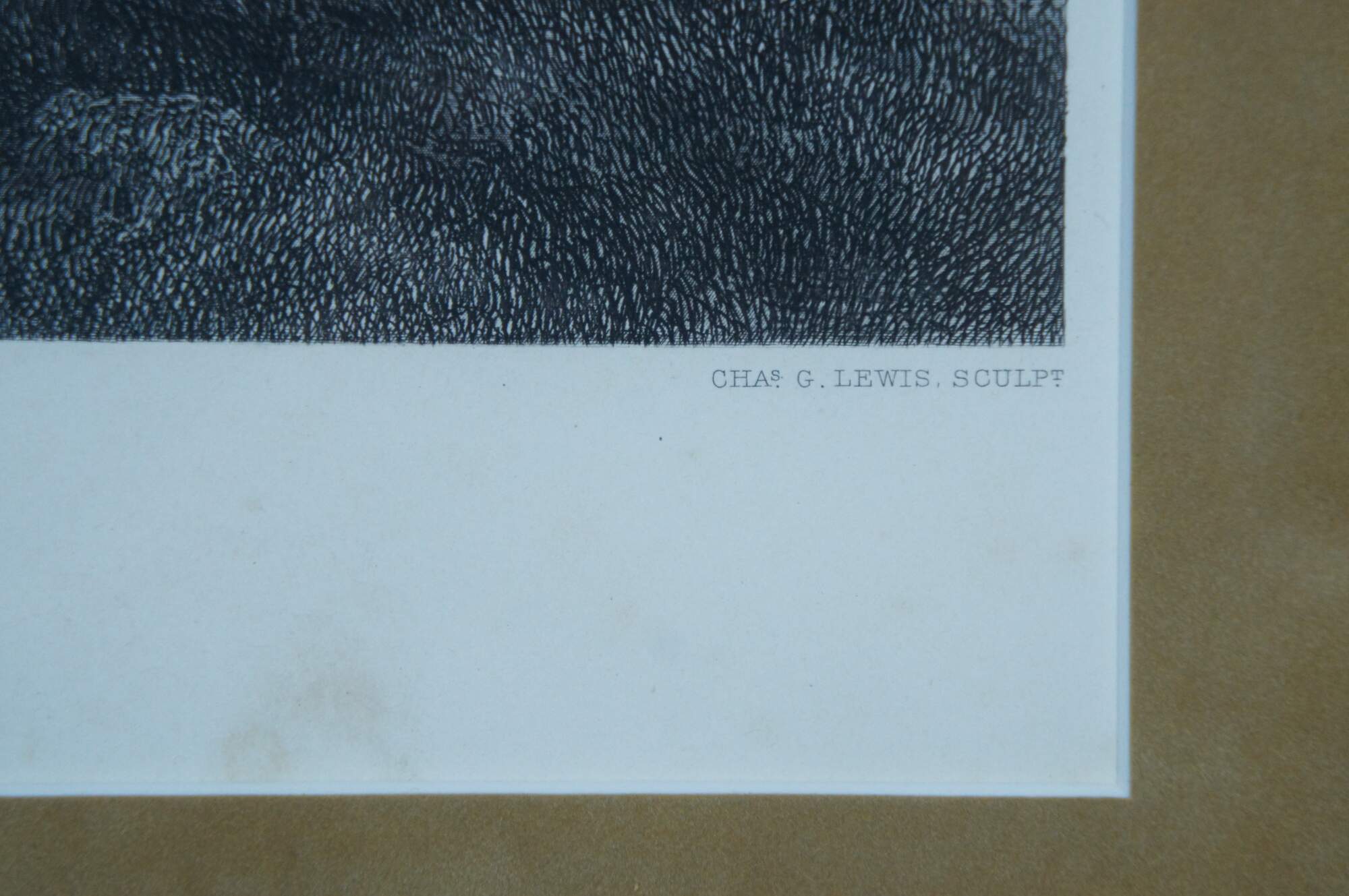 "Charles George Lewis (13 June 1808 – 16 June 1880) was a British printmaker. The second son of Frederick Christian Lewis, and brother of John Frederick Lewis, he was born in Enfield, Middlesex. He was instructed in drawing and engraving by his father. Many of his best-known plates were after the works of Sir Edwin Landseer. Lewis retired in about 1877, and died suddenly from apoplexy at his residence at Felpham, near Bognor, on 16 June 1880. He was buried in Felpham churchyard." (Source: Wikipedia)