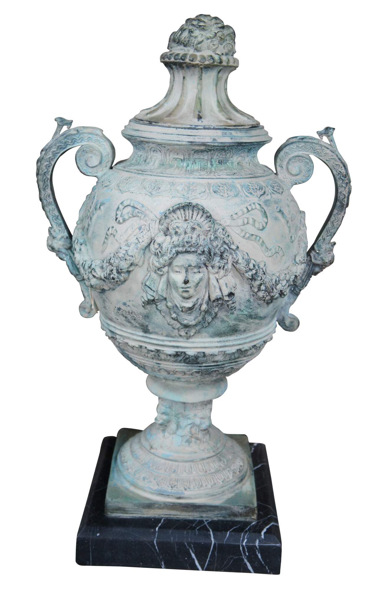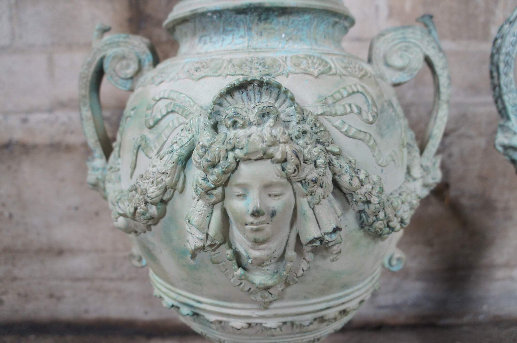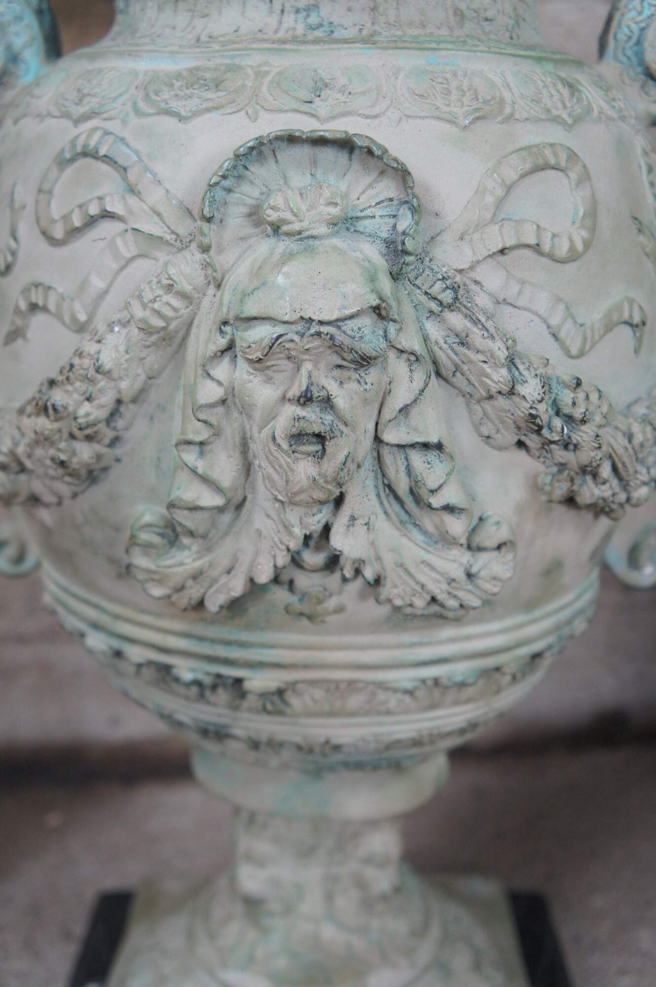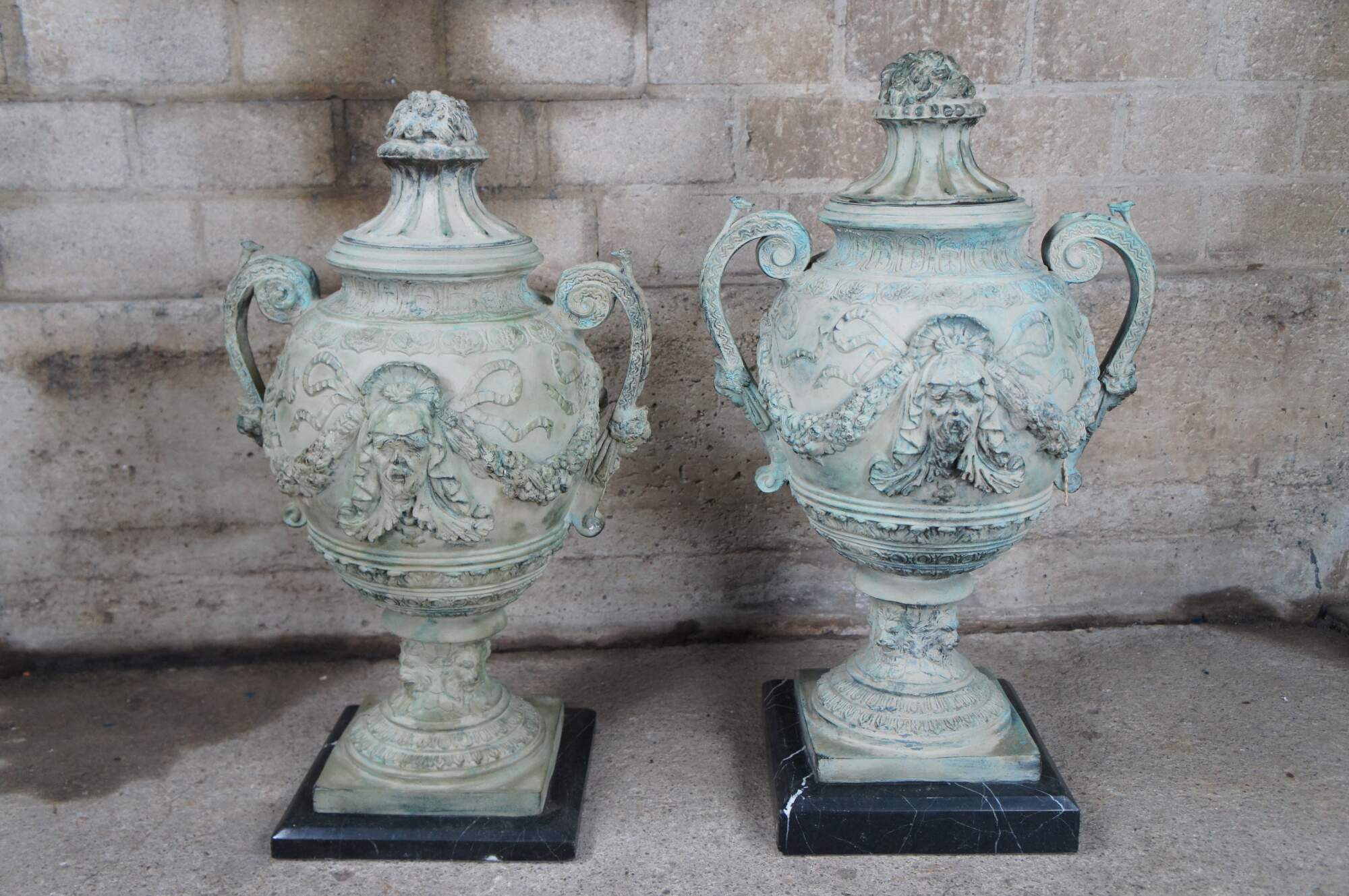 Pair of Neoclassical style patinated verdigris bronze corvered urns on stands. Beautifully designed with figures, floral sqags, and lions heads around the base. Marked A. Moreau. Each urn is mounted to a black and white veined marble plinth. Circa last quarter 20th Century