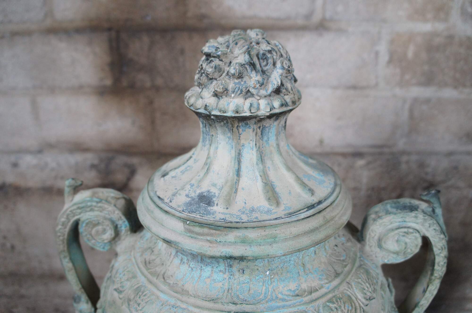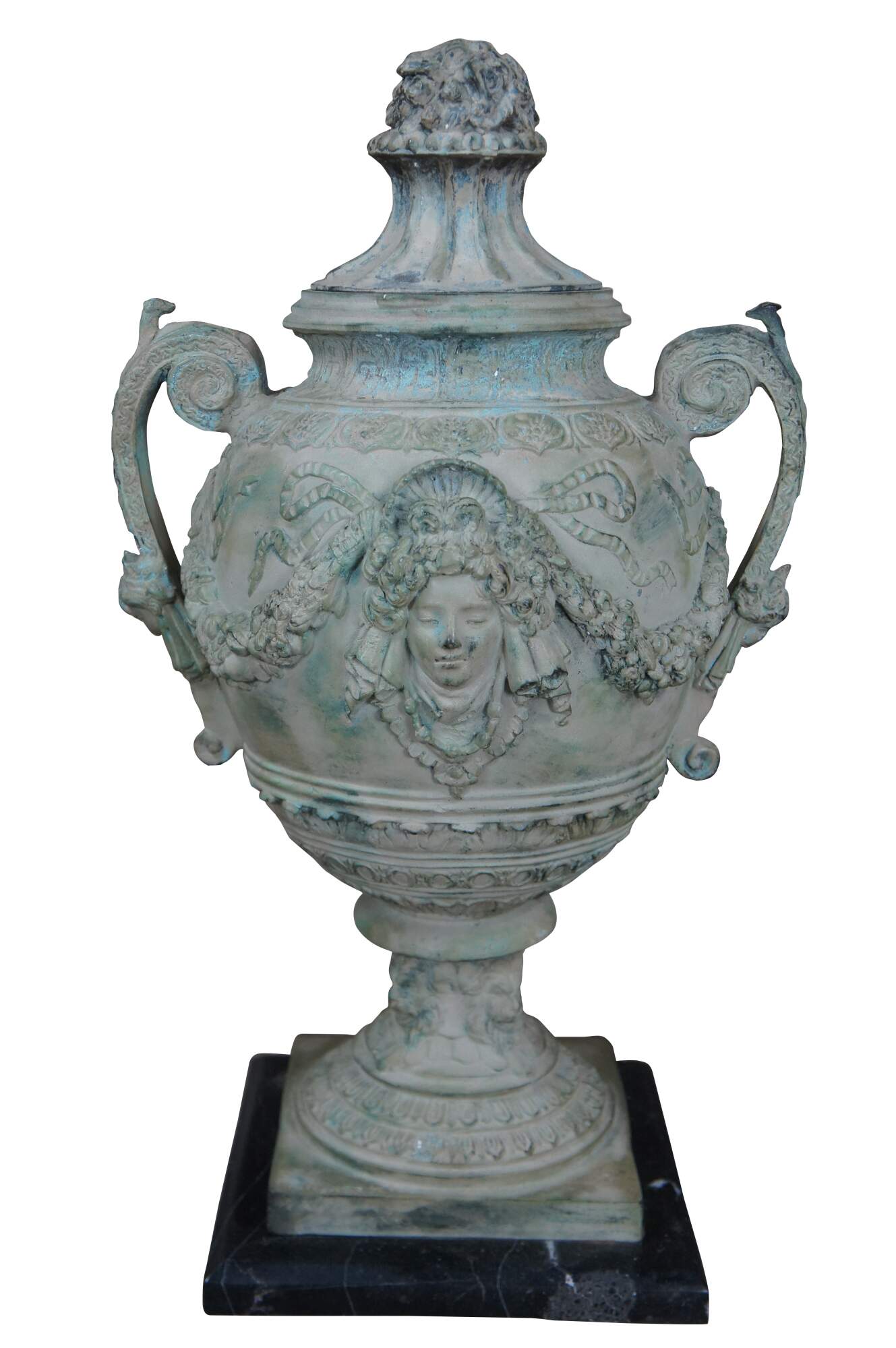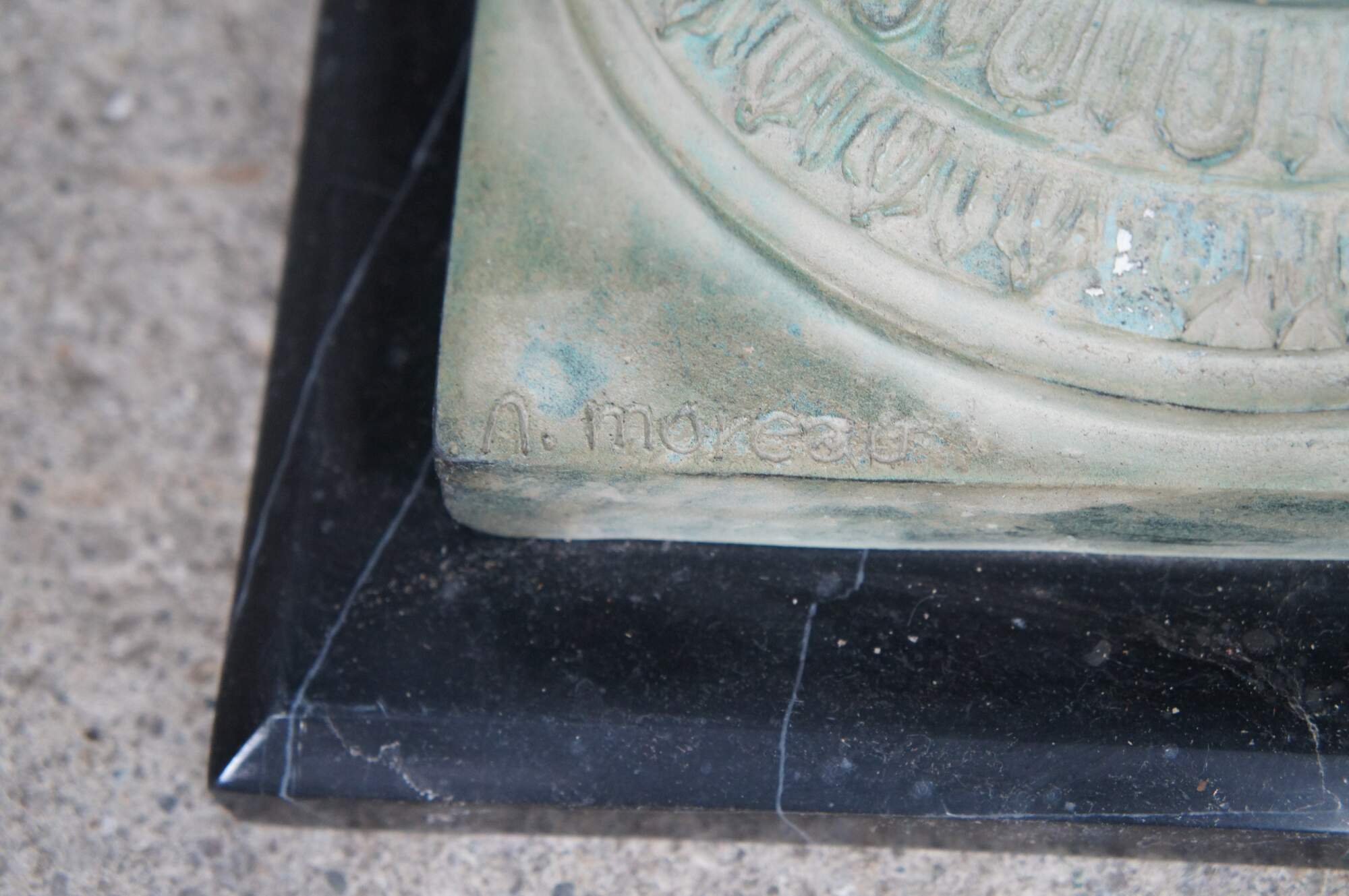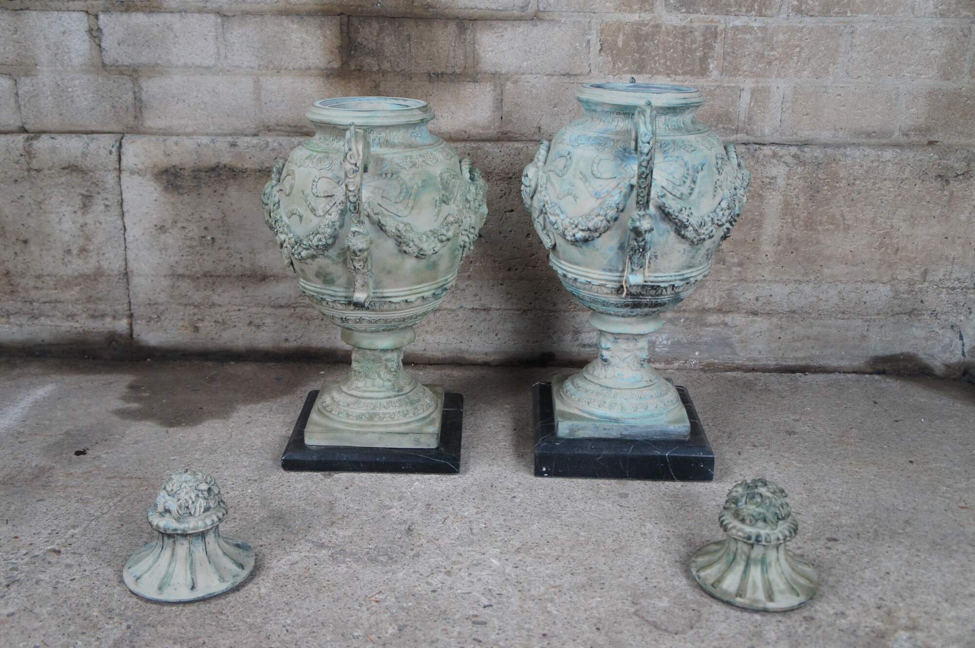 Pair of Neoclassical style patinated verdigris bronze corvered urns on stands. Beautifully designed with figures, floral sqags, and lions heads around the base. Marked A. Moreau. Each urn is mounted to a black and white veined marble plinth. Circa last quarter 20th Century