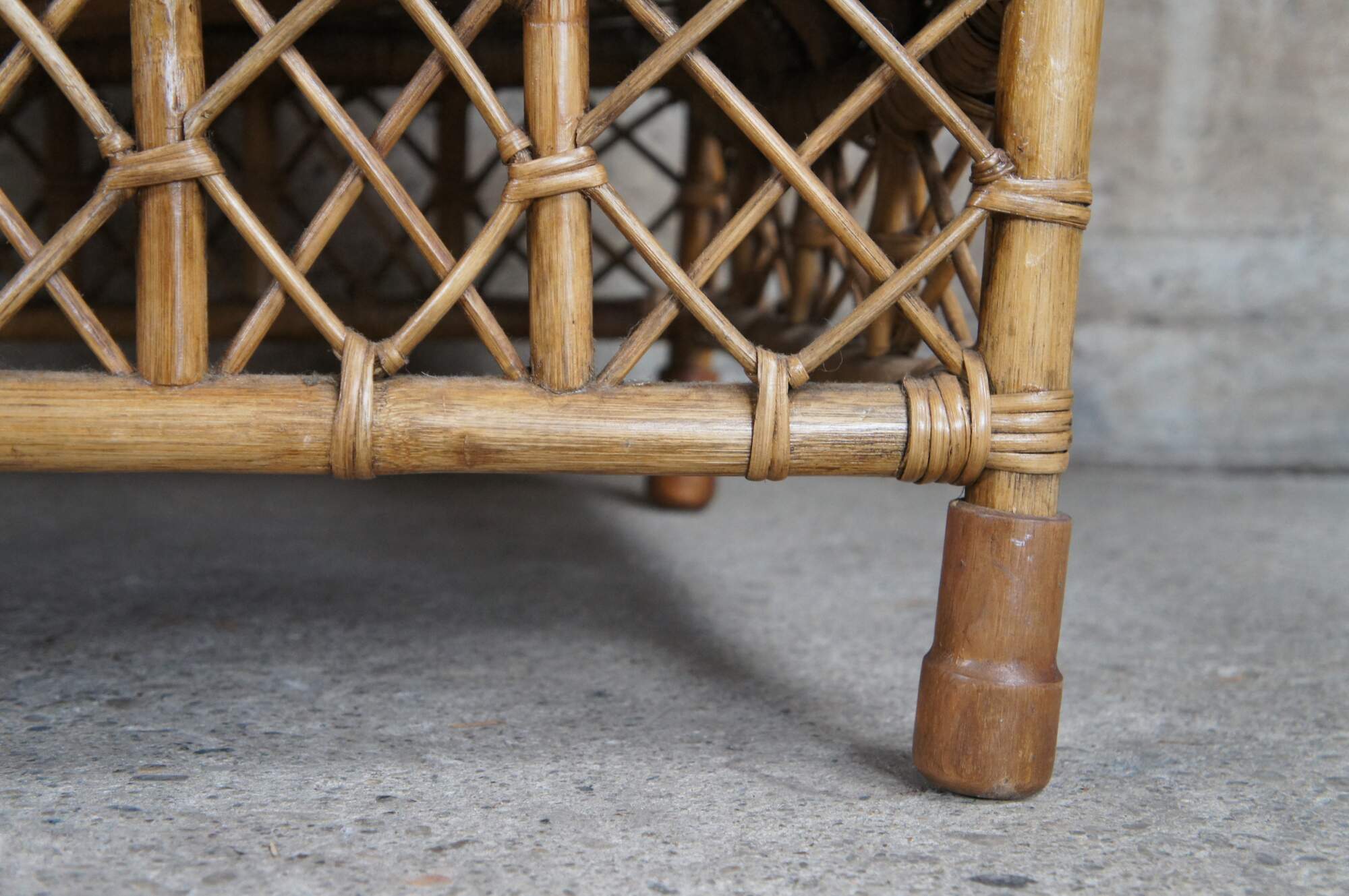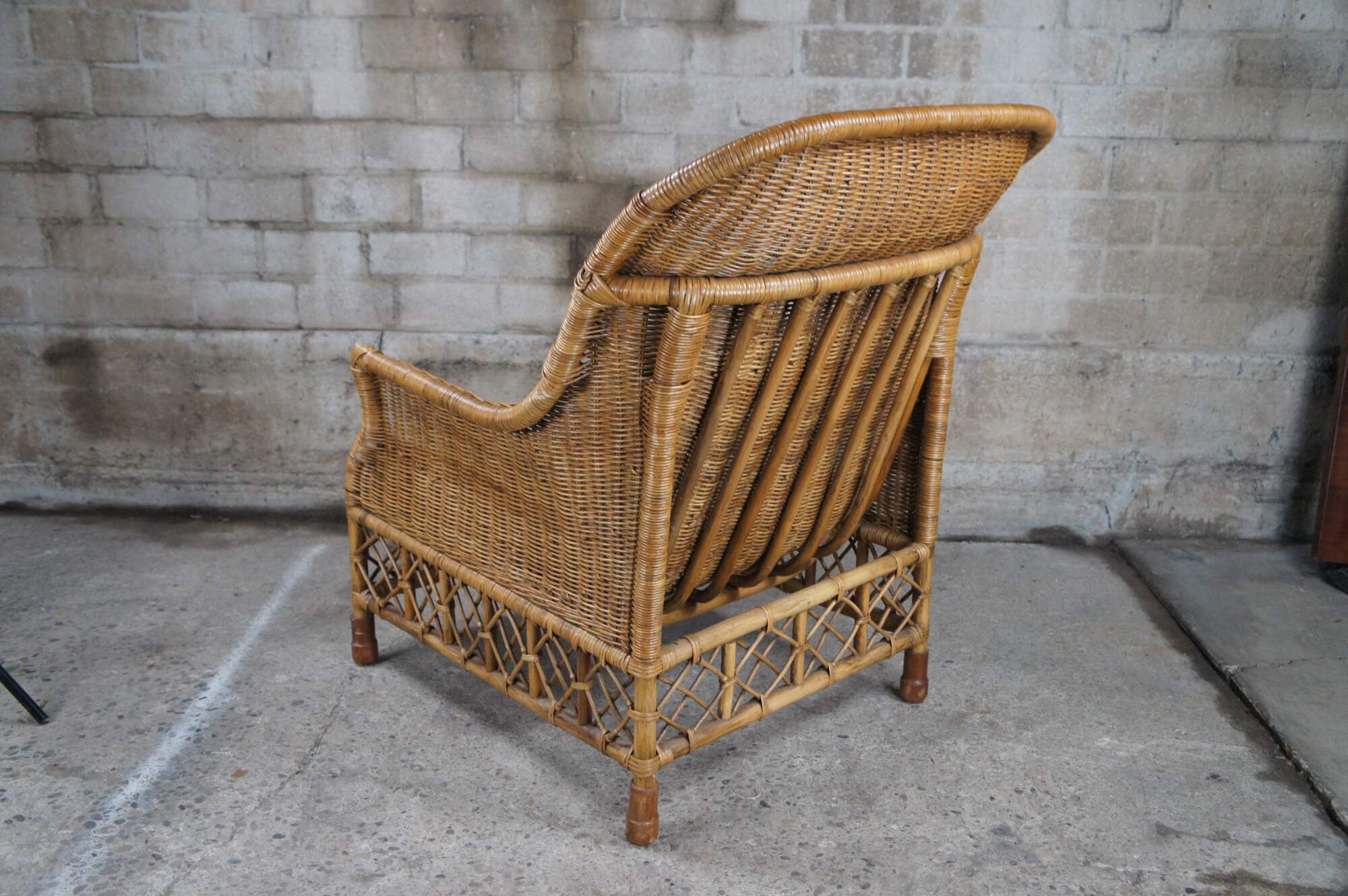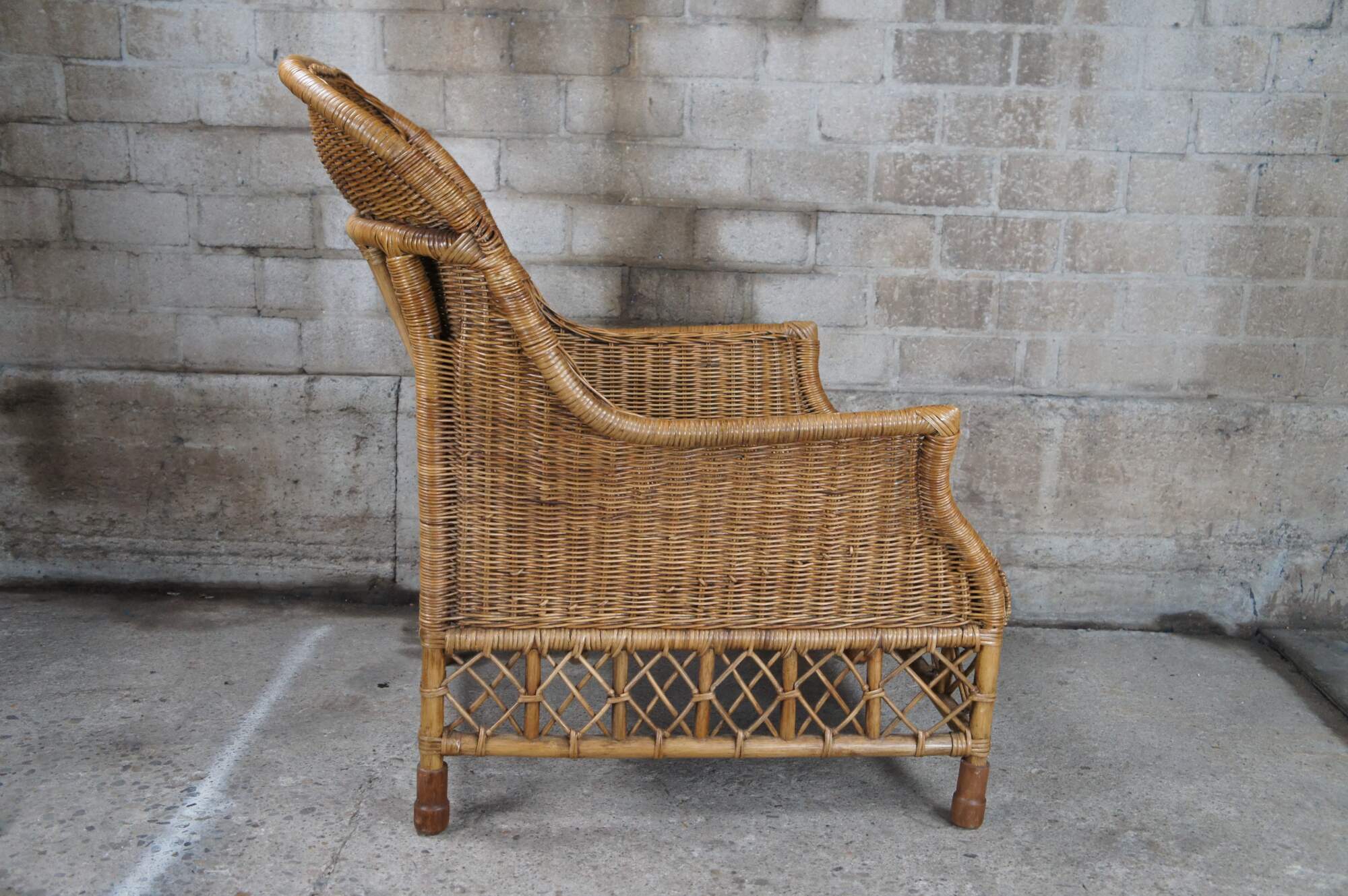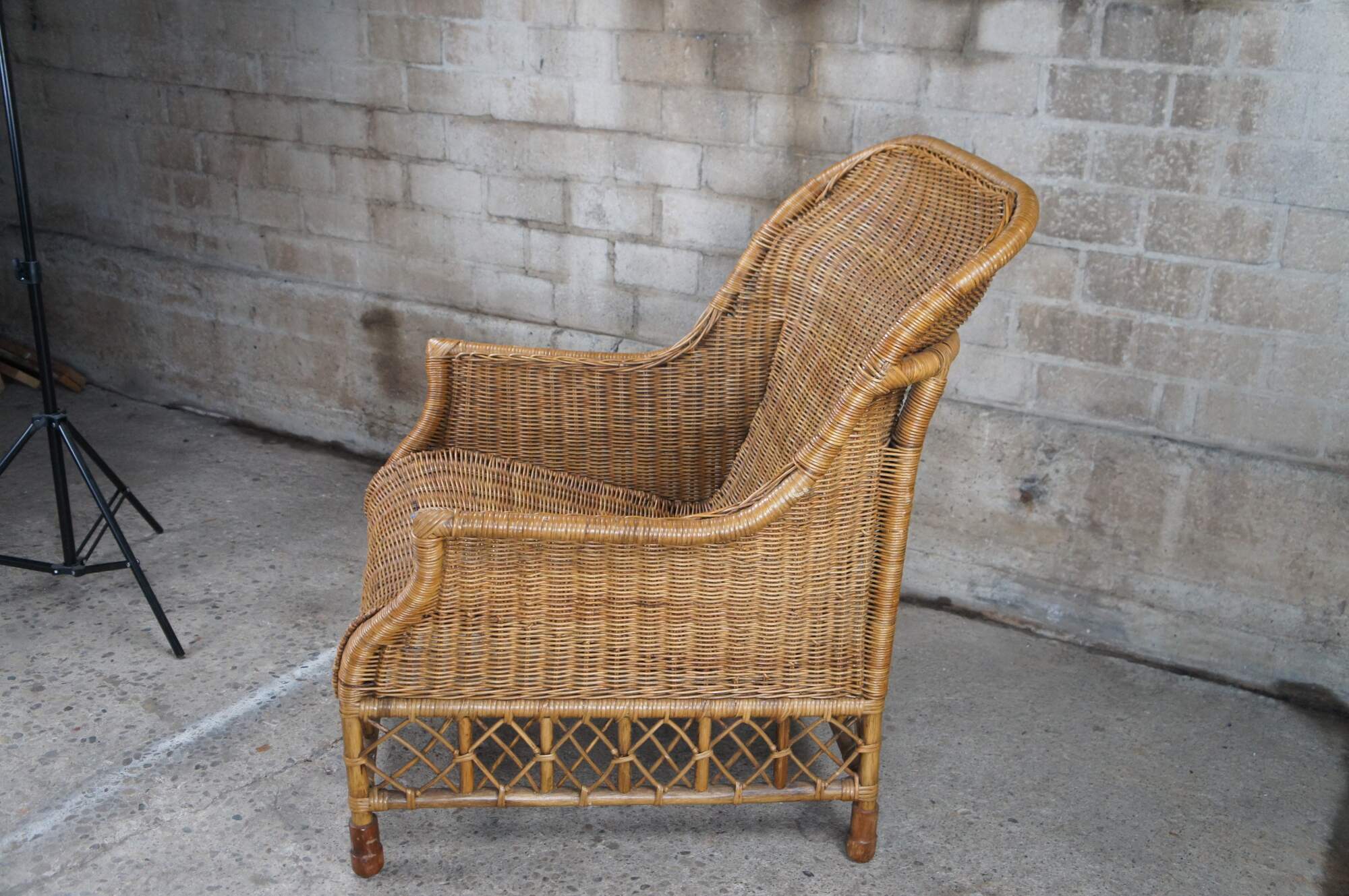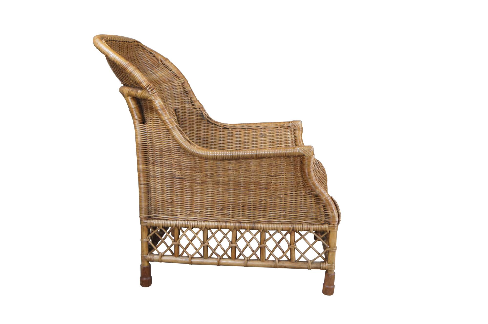 Late 20th Century bohemian modern wicker lounge chair. Features a sloped frame with deep contoured back and lattice apron along the base.
