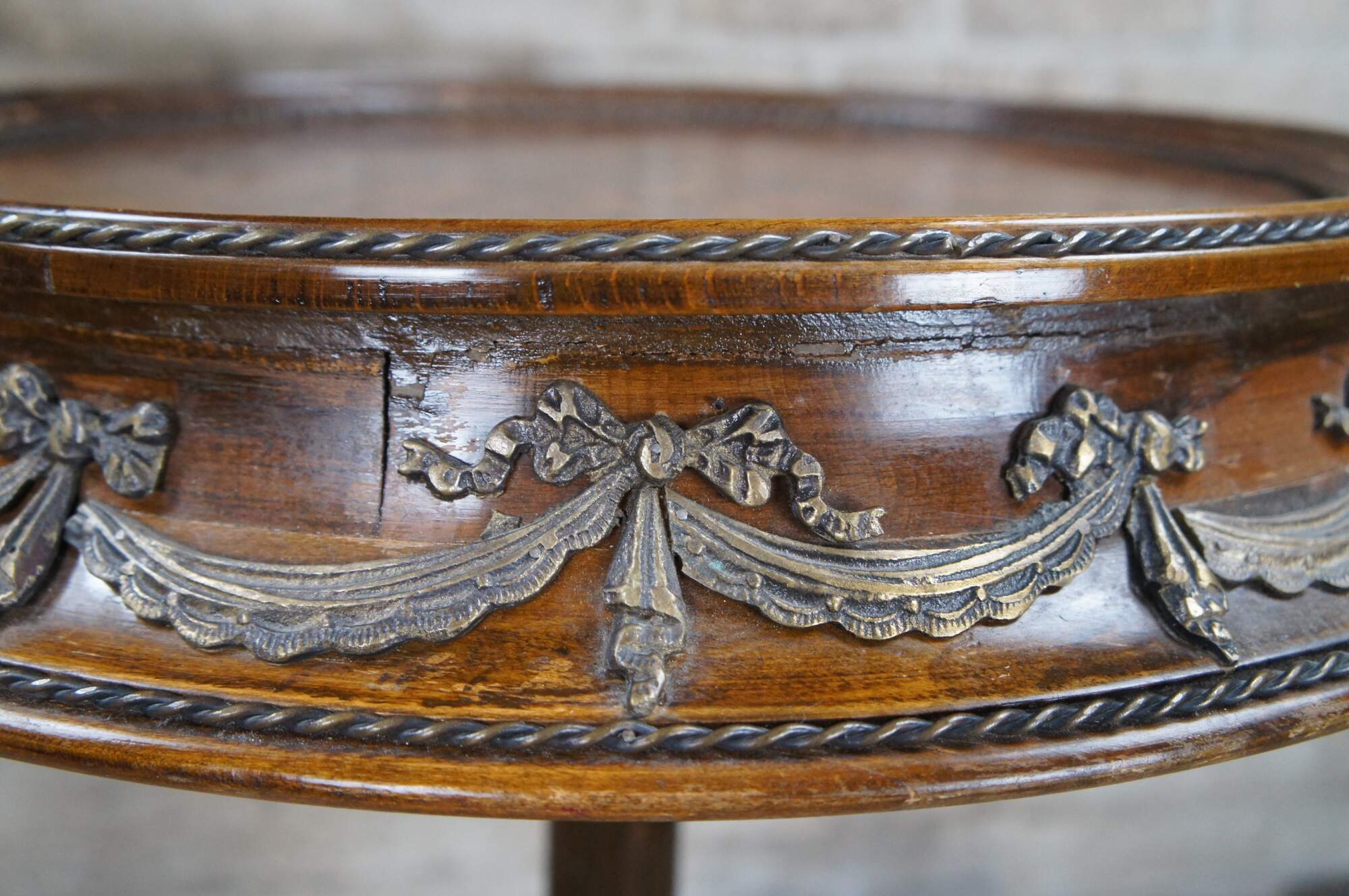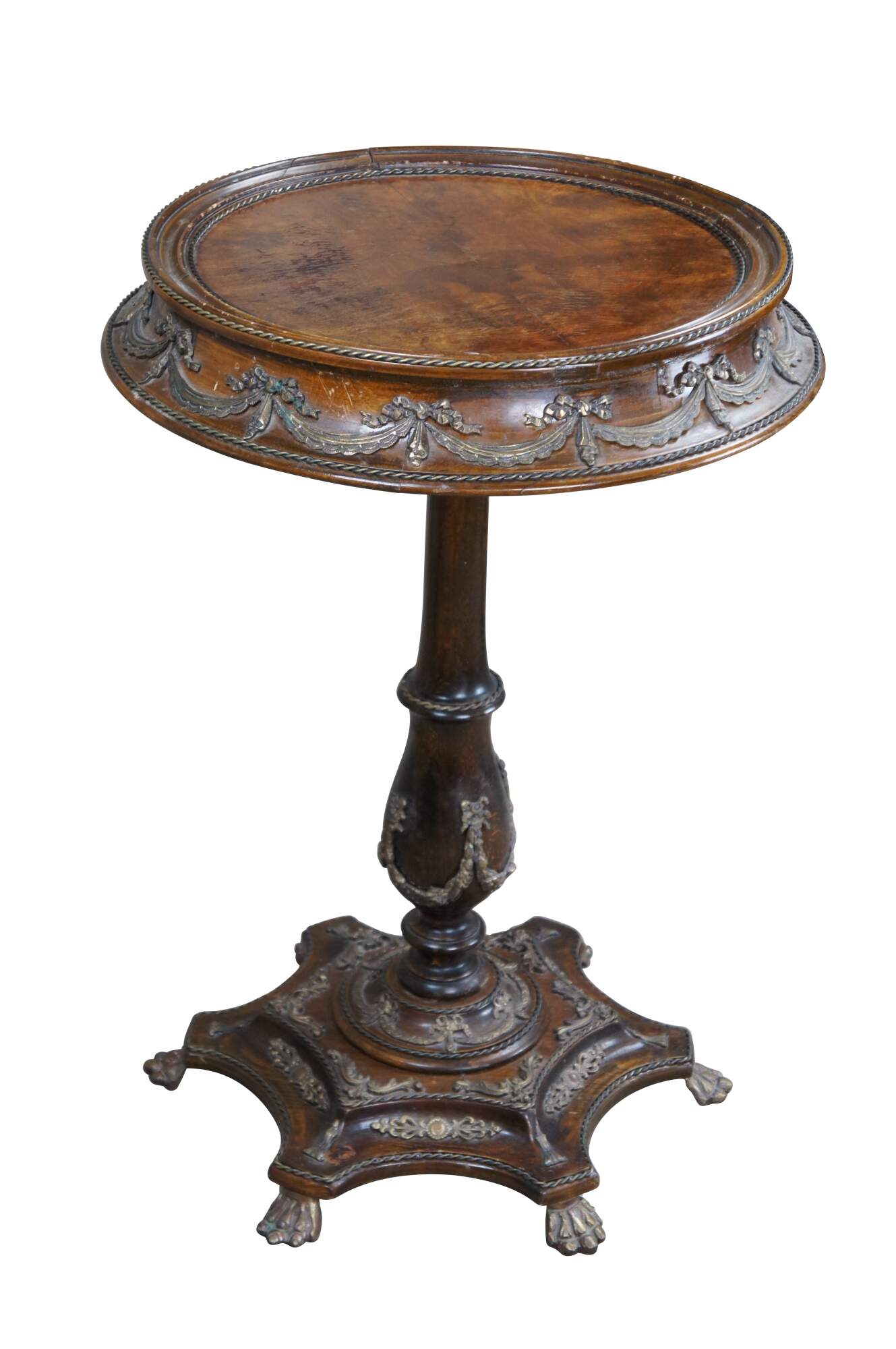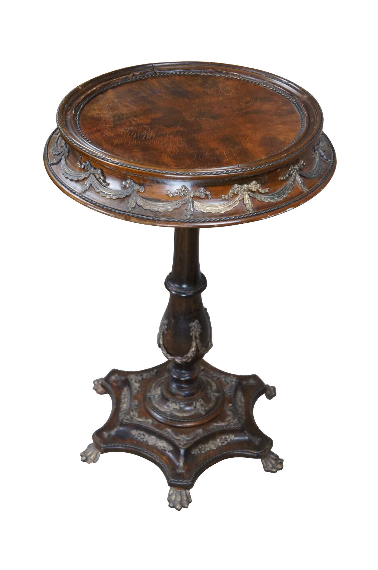 An impressive French Louis XIV style table, circa 1970s. Features a round form with inset matchbook veneered mahogany top, braised brass and bronze ormolu swags. The table is supported by a turned baluster leading to a hexagram base ornate ormolu mounts and paw feet.