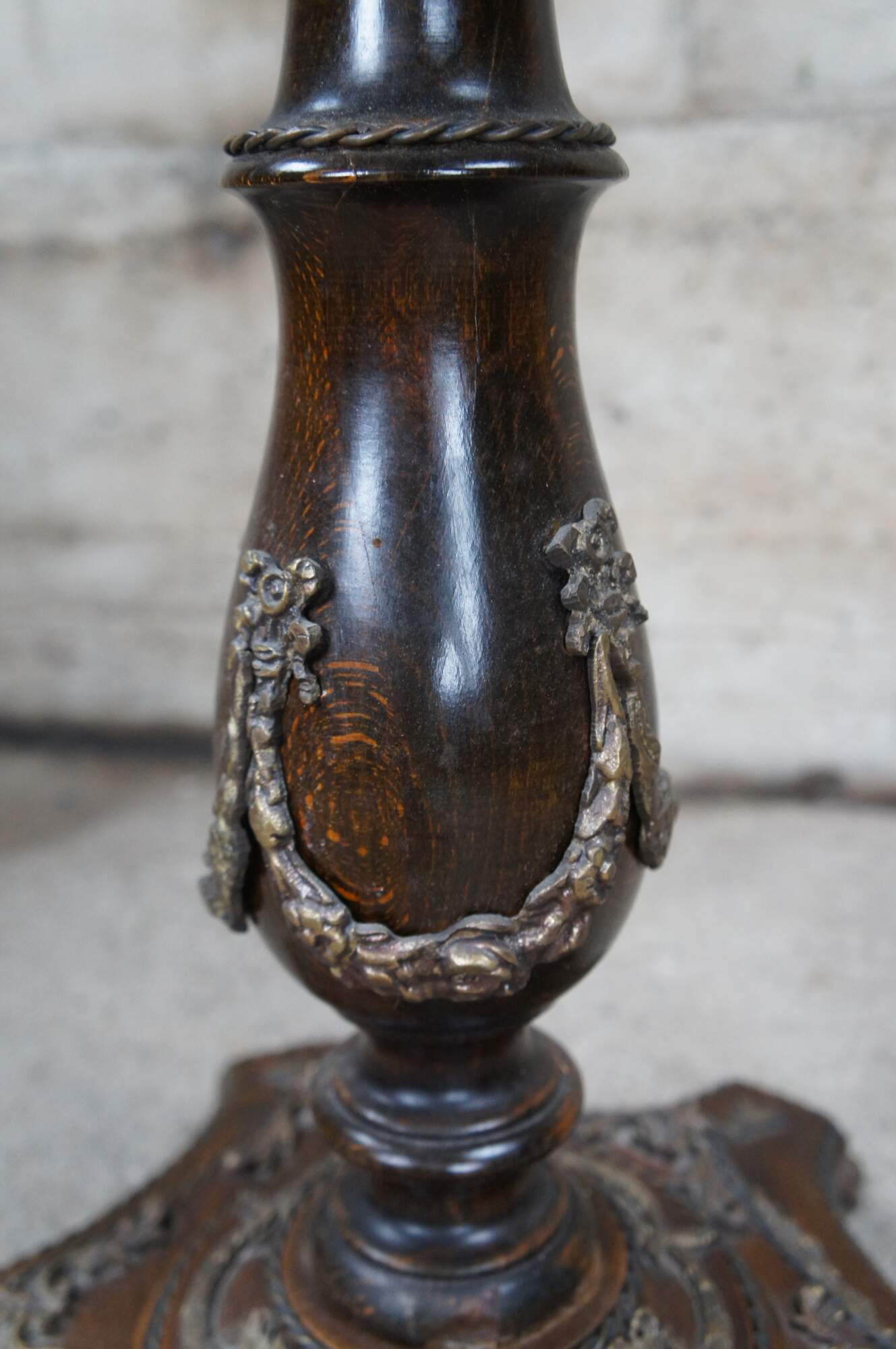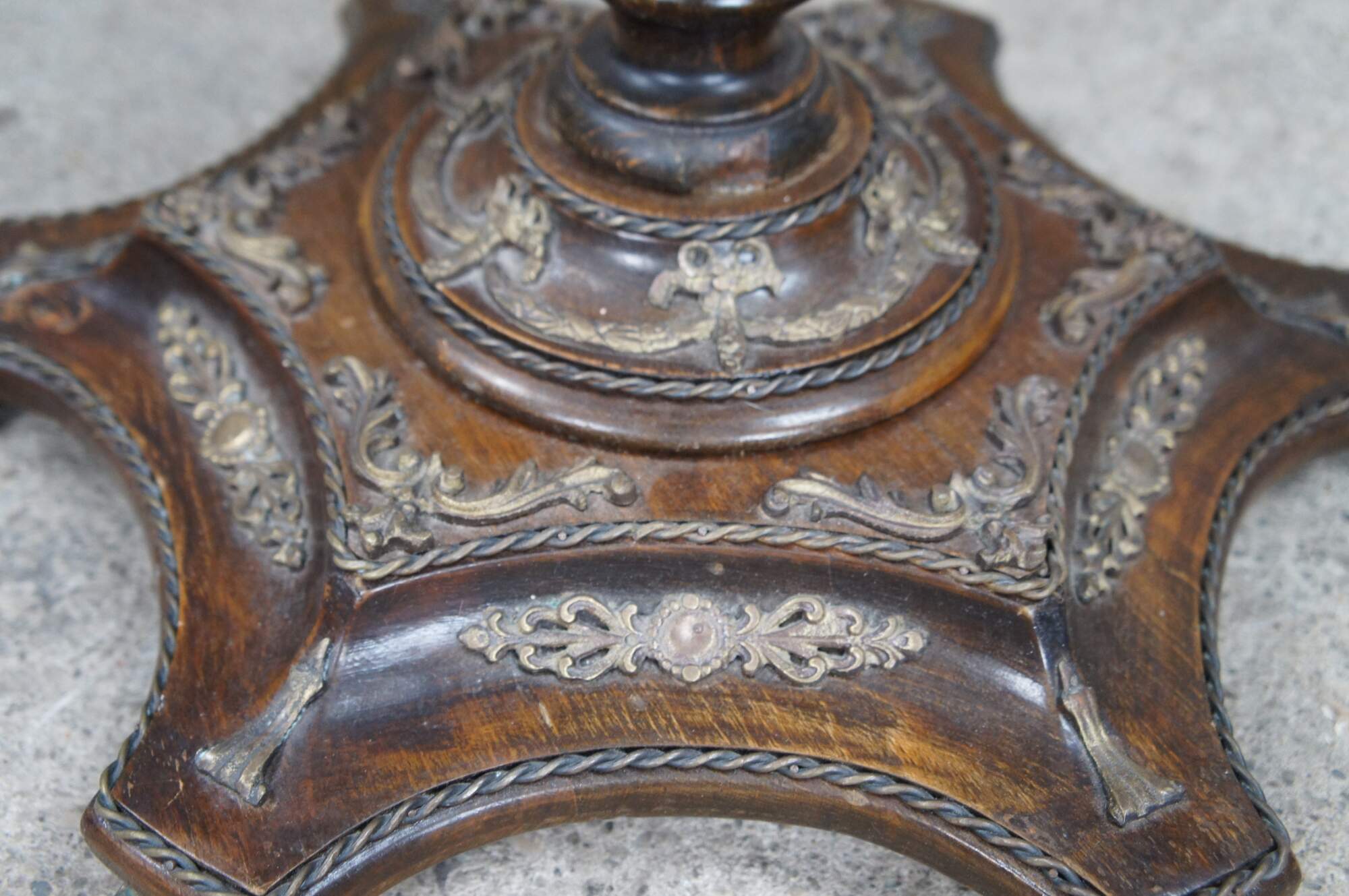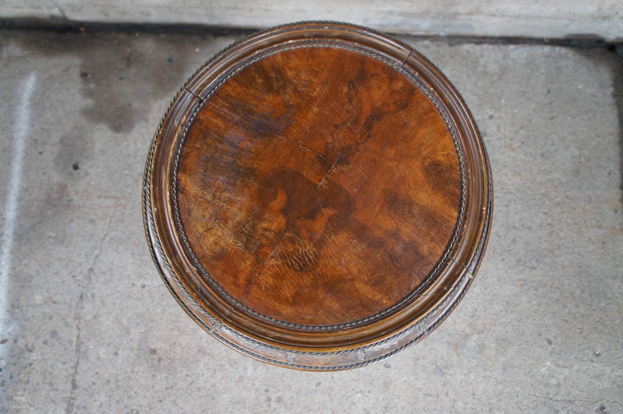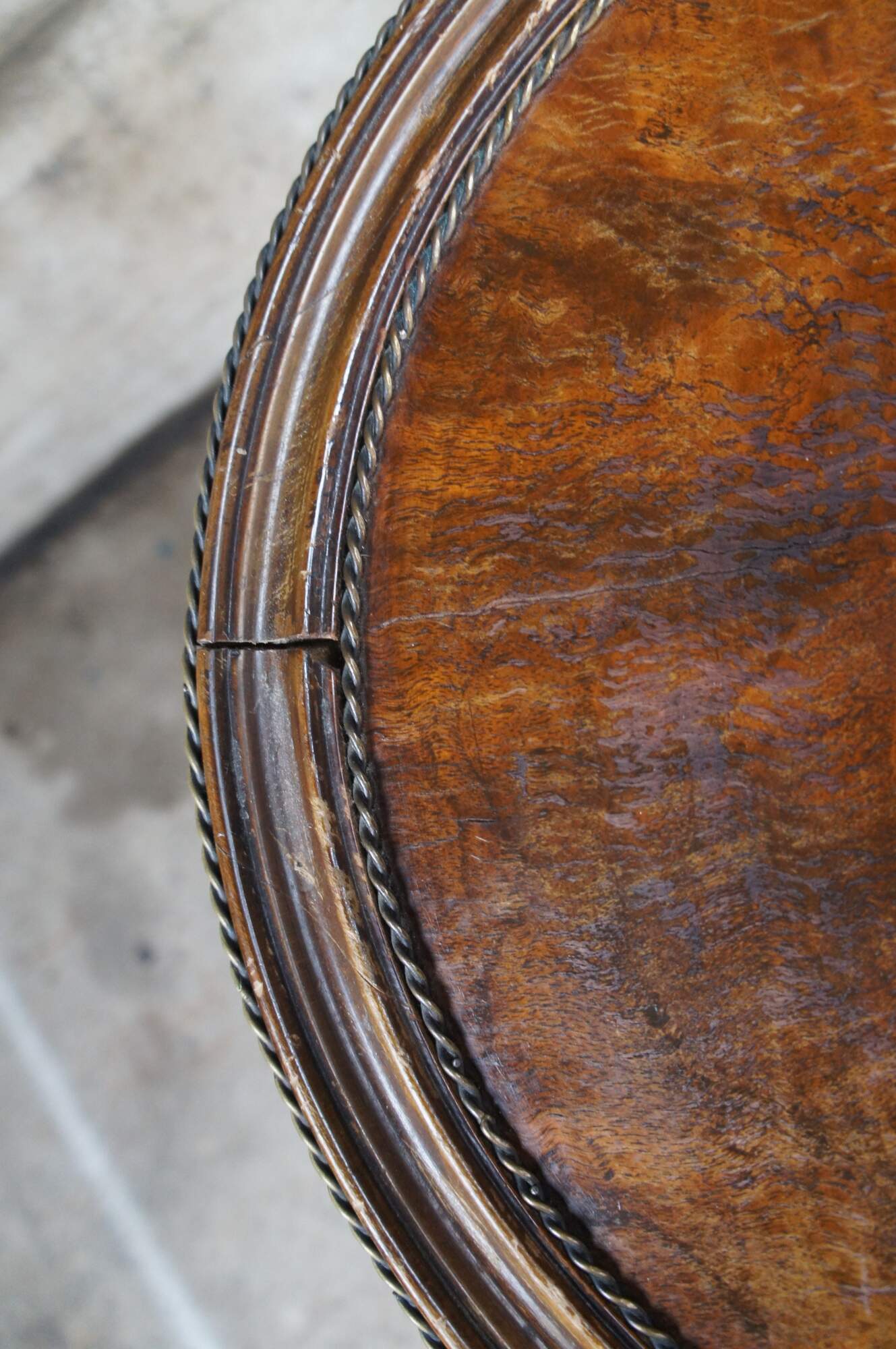 An impressive French Louis XIV style table, circa 1970s. Features a round form with inset matchbook veneered mahogany top, braised brass and bronze ormolu swags. The table is supported by a turned baluster leading to a hexagram base ornate ormolu mounts and paw feet.