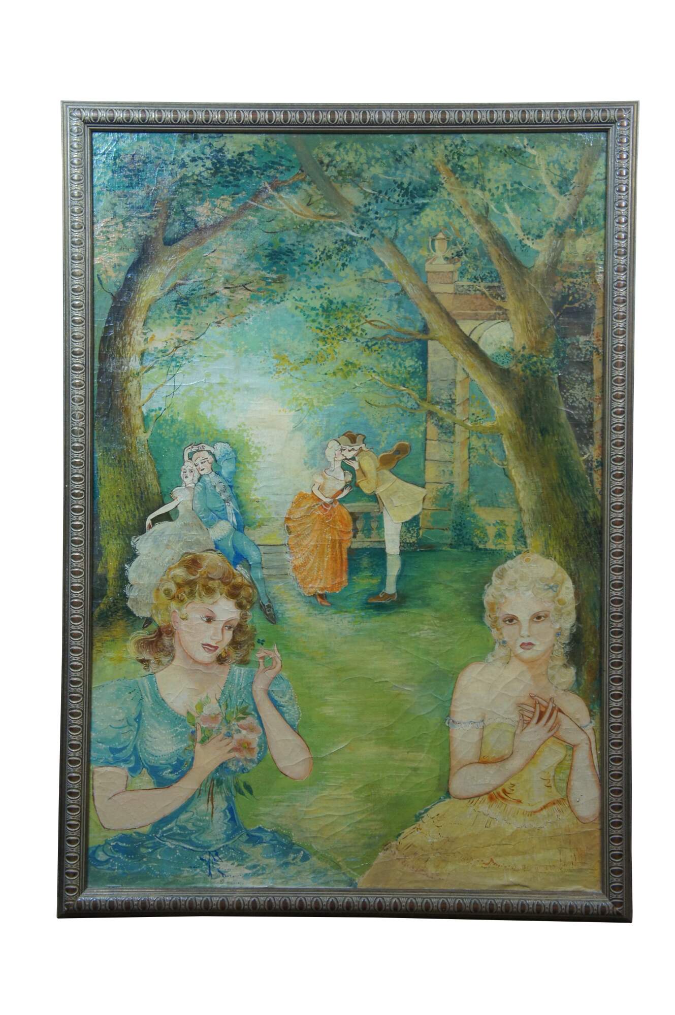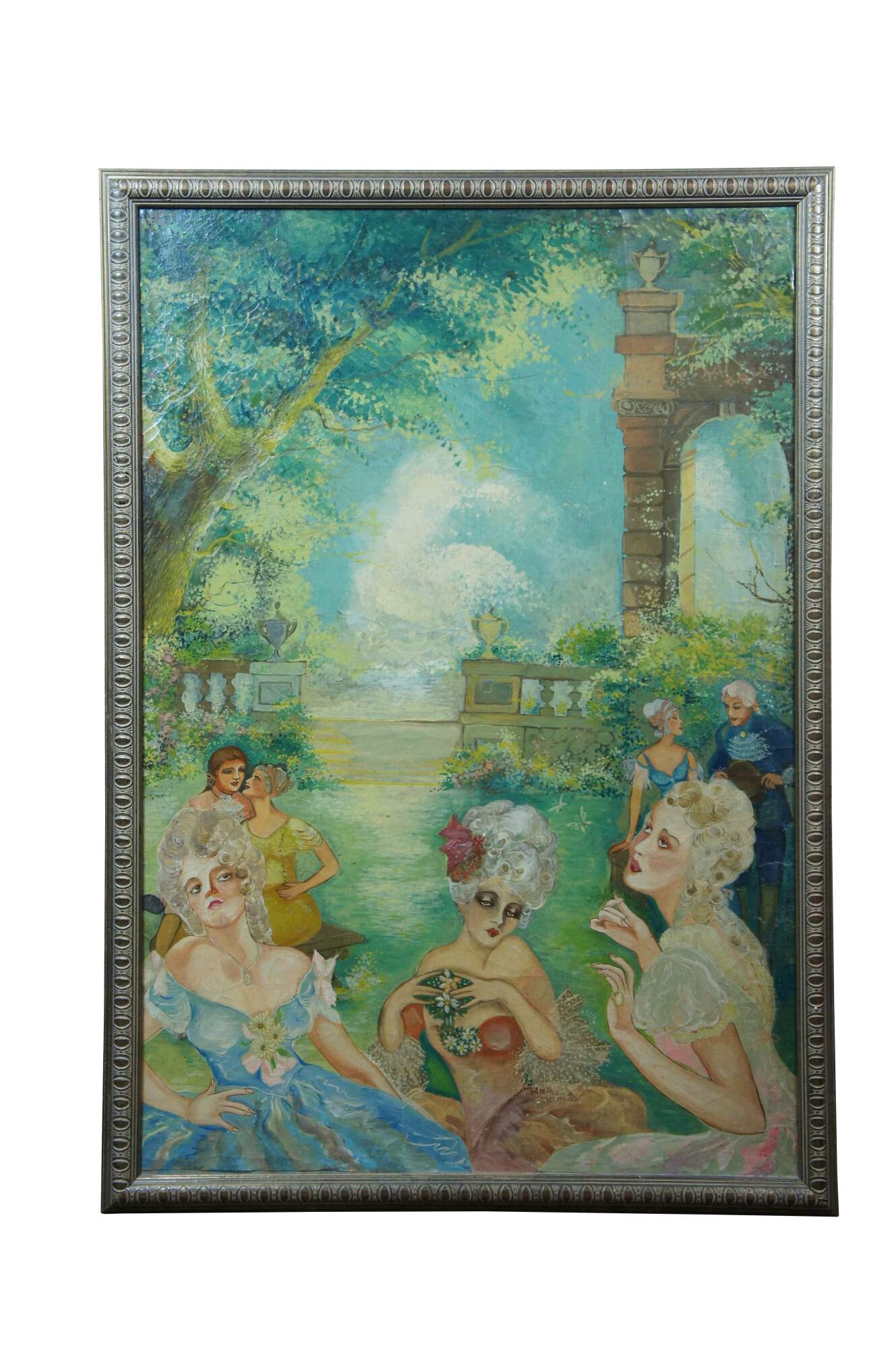 Set of three mid to late 20th century French Colonial oil paintings on board depicting an array of figures dressed for a modern imagining of a French Provincial, court of Versailles type garden party, full of seduction and debauchery. Champagne giltwood carved frames.