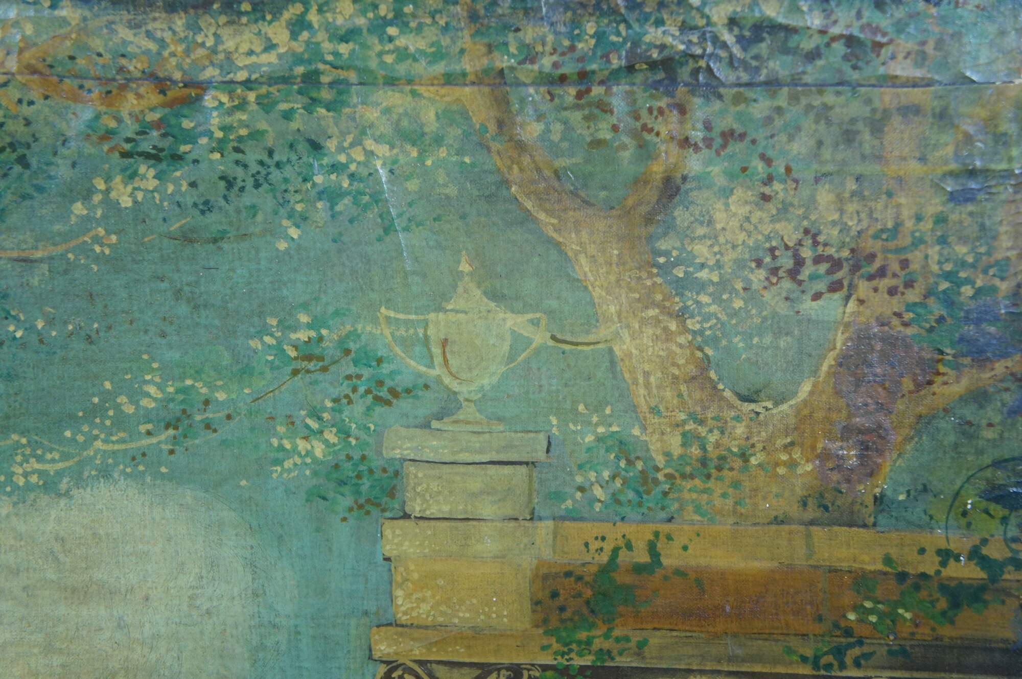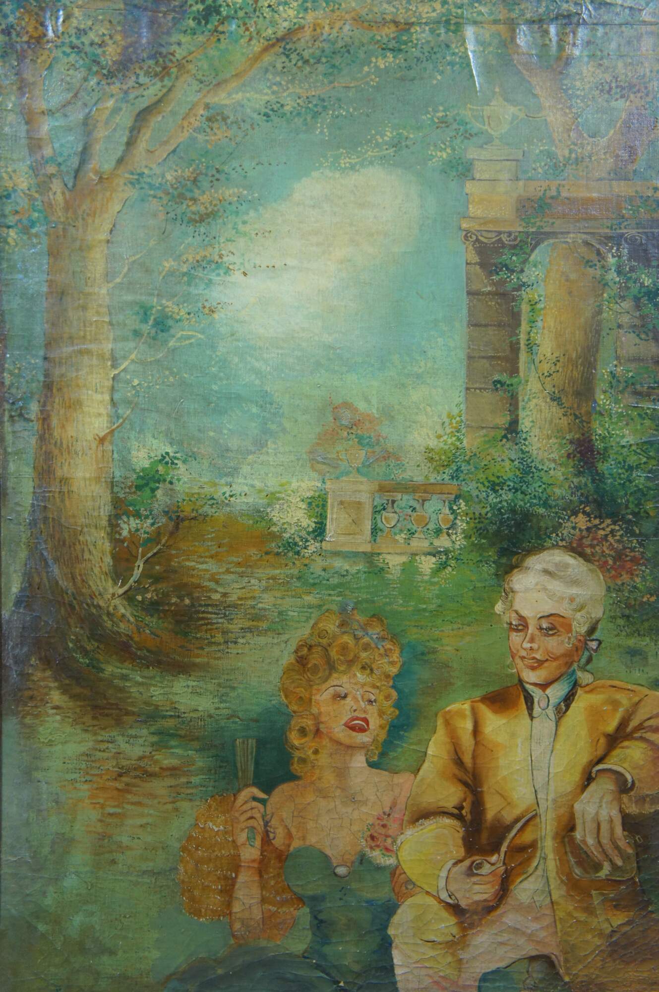 Fair condition, wear and distressing from age and use, some crazing / cracking / discoloration to paint, one seam.