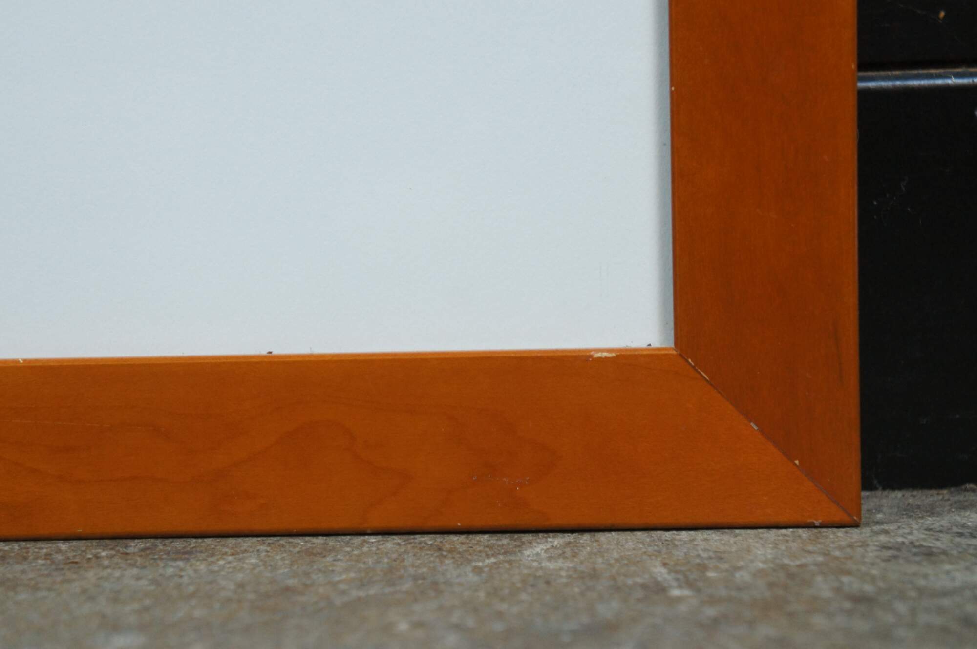 Mid century lithograph print by Hoi Ledabang. Shows a semi-abstract scene in red, yellow, and teal of water lilies and lily pads. Pencil signed Hoi (lower right) and numbered 230/325 (lower left). Embossed CG and with a flower and butterfly design along the lower edge. Plain wood frame; white and teal layered mat.