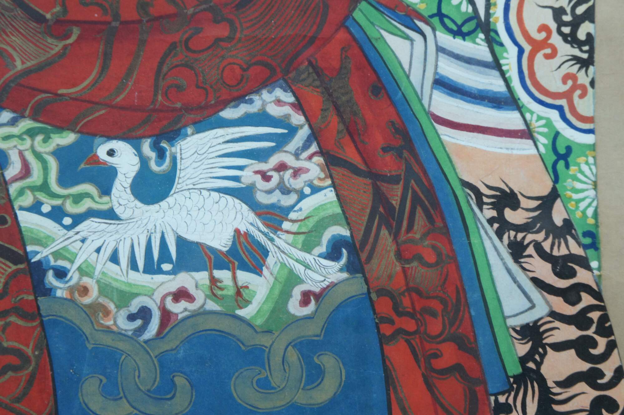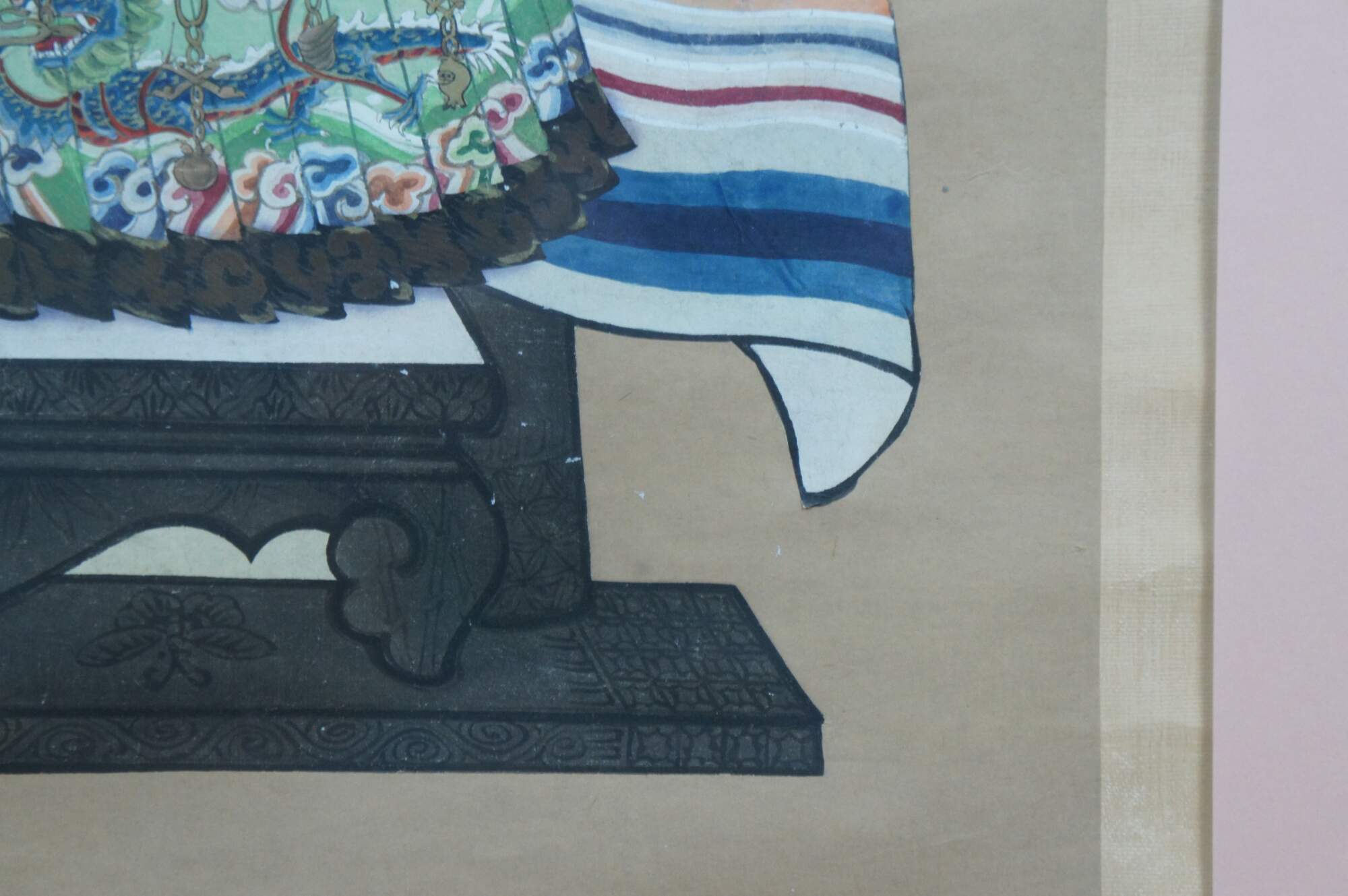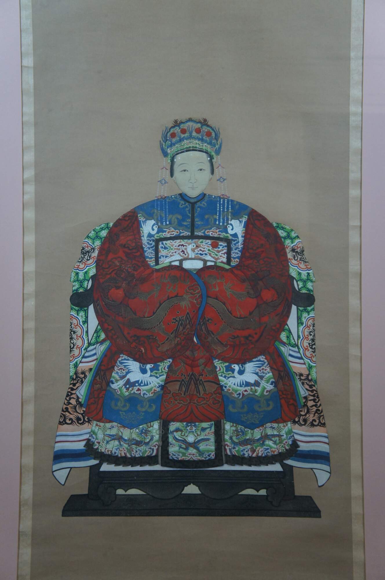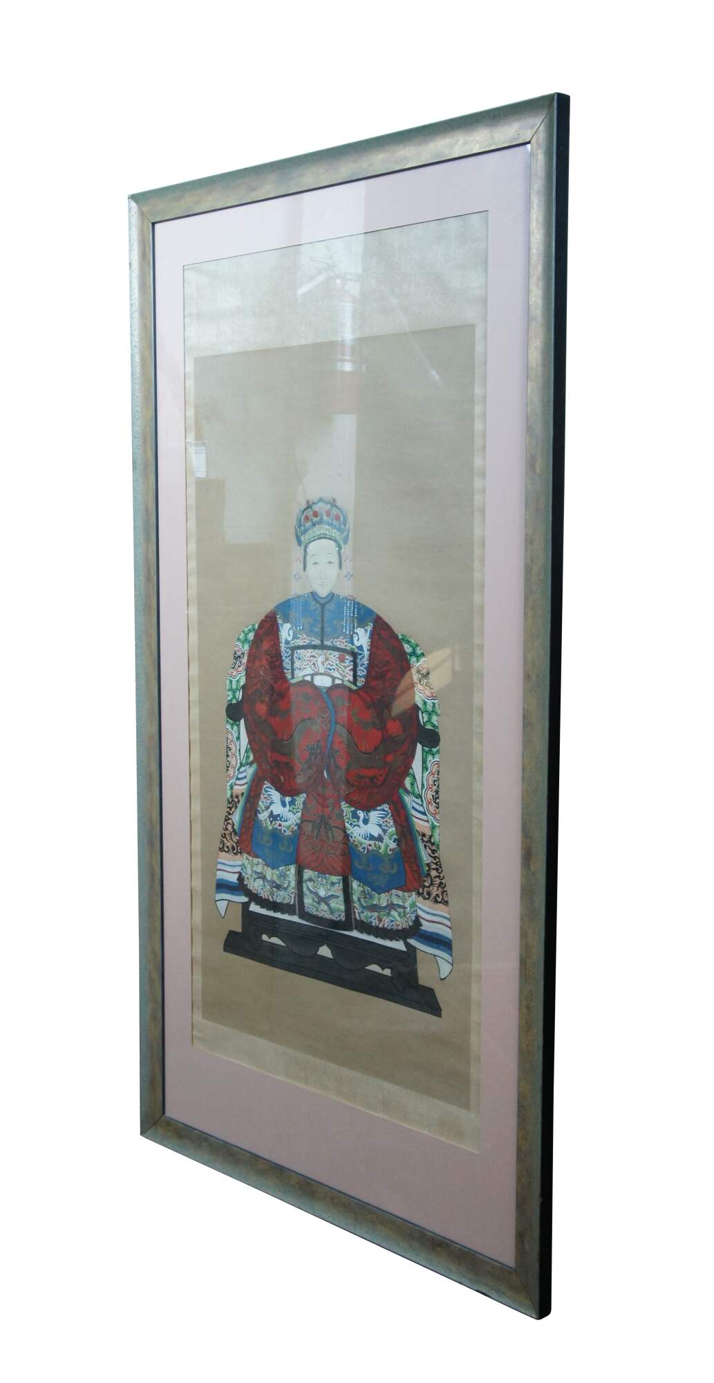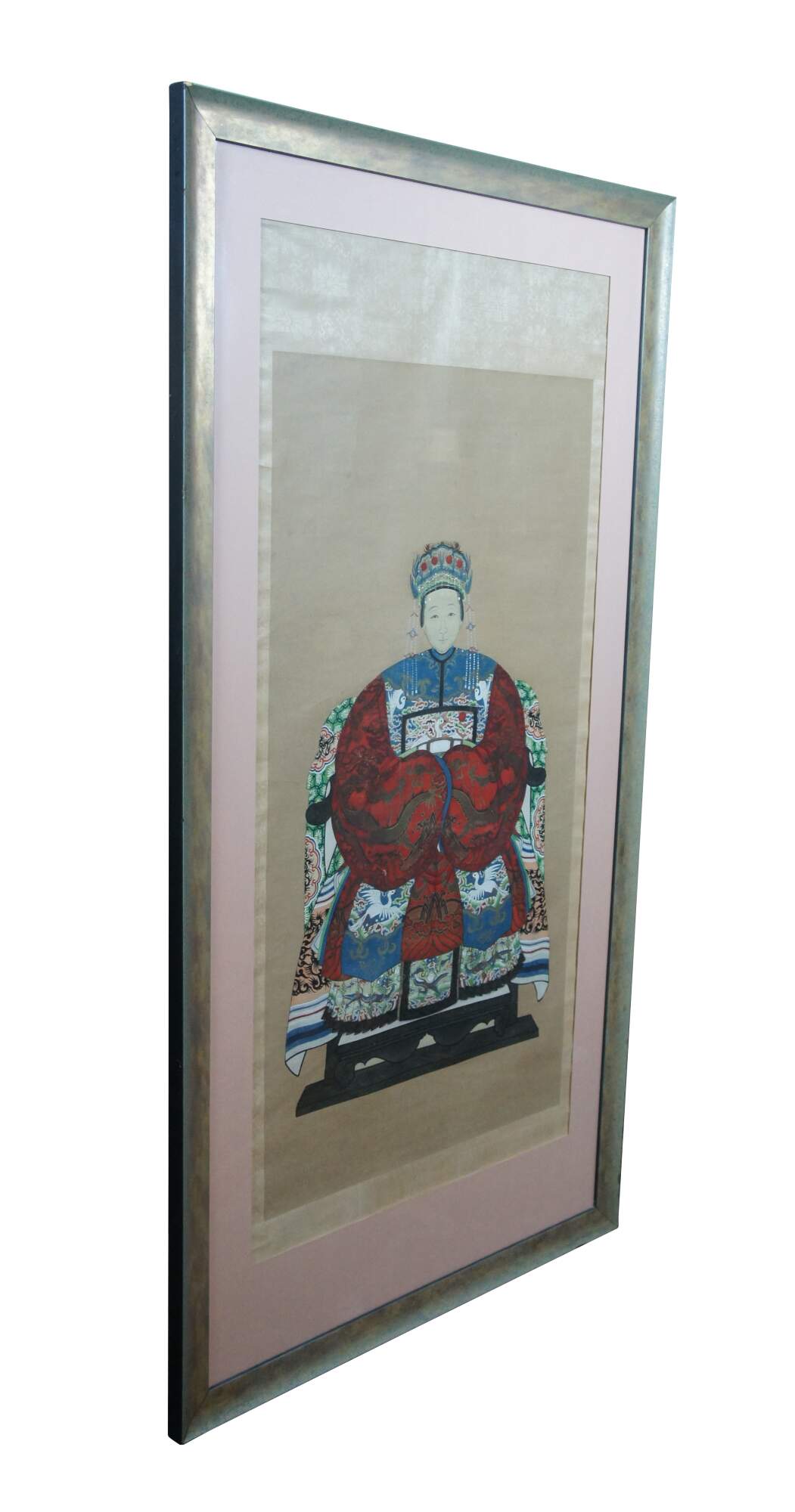 Antique watercolor on paper Chinese ancestor portrait, depicting a woman on a throne chair wearing intricate robes with cranes and dragons, and jeweled crown of an Empress. Distressed giltwood frame; light pink mat with gold floral silk trim.