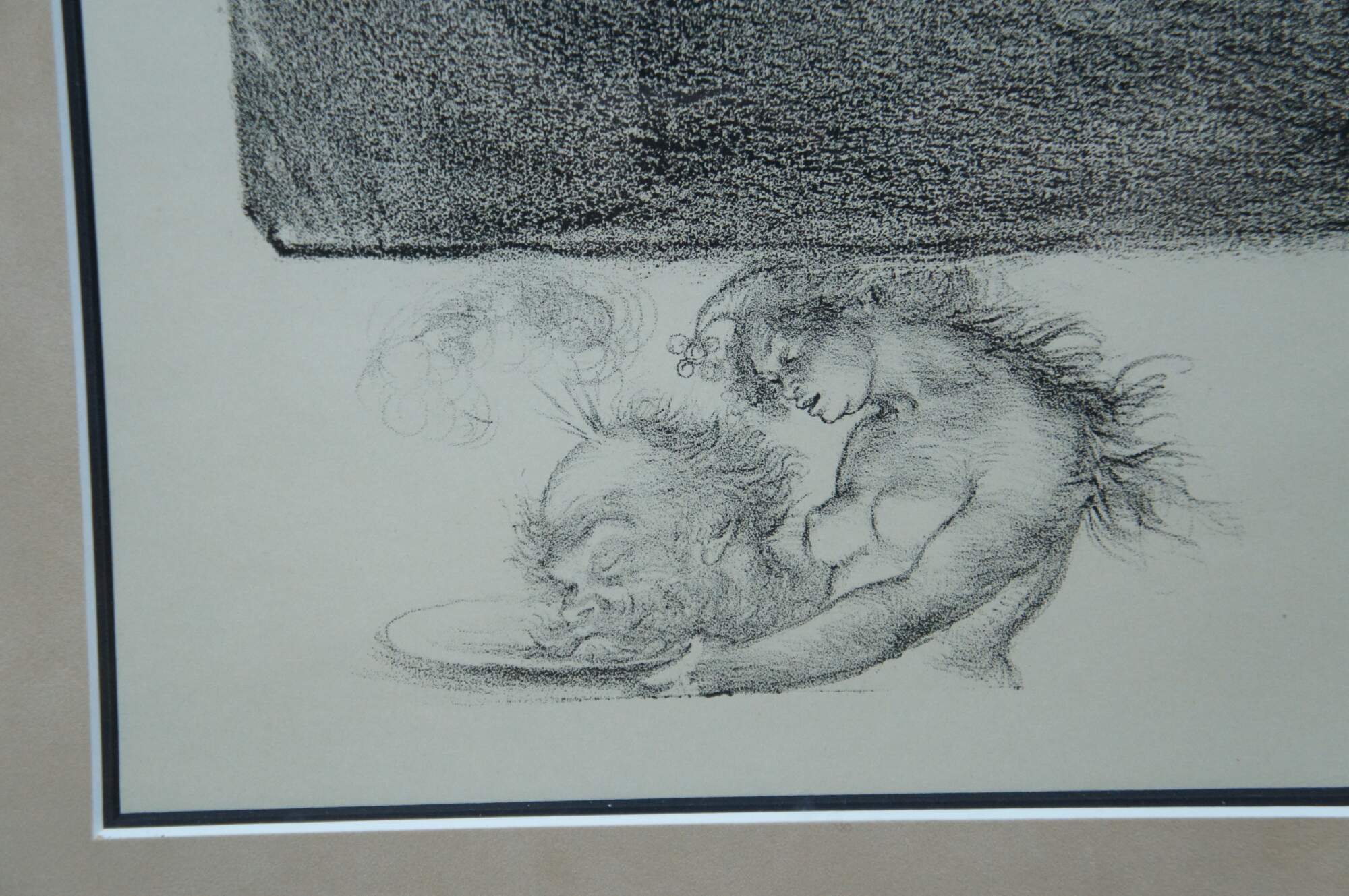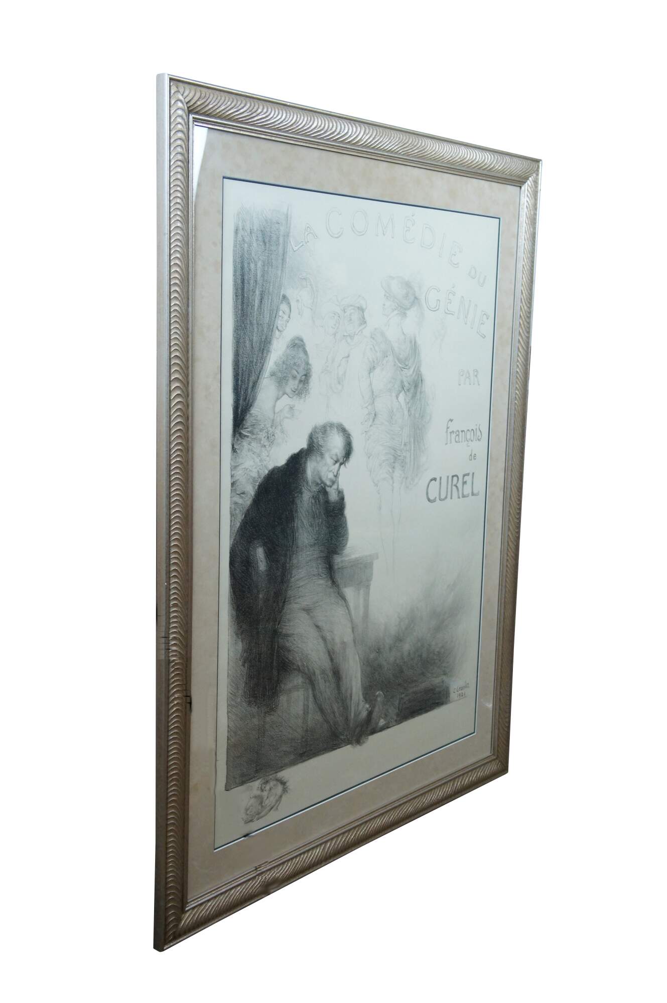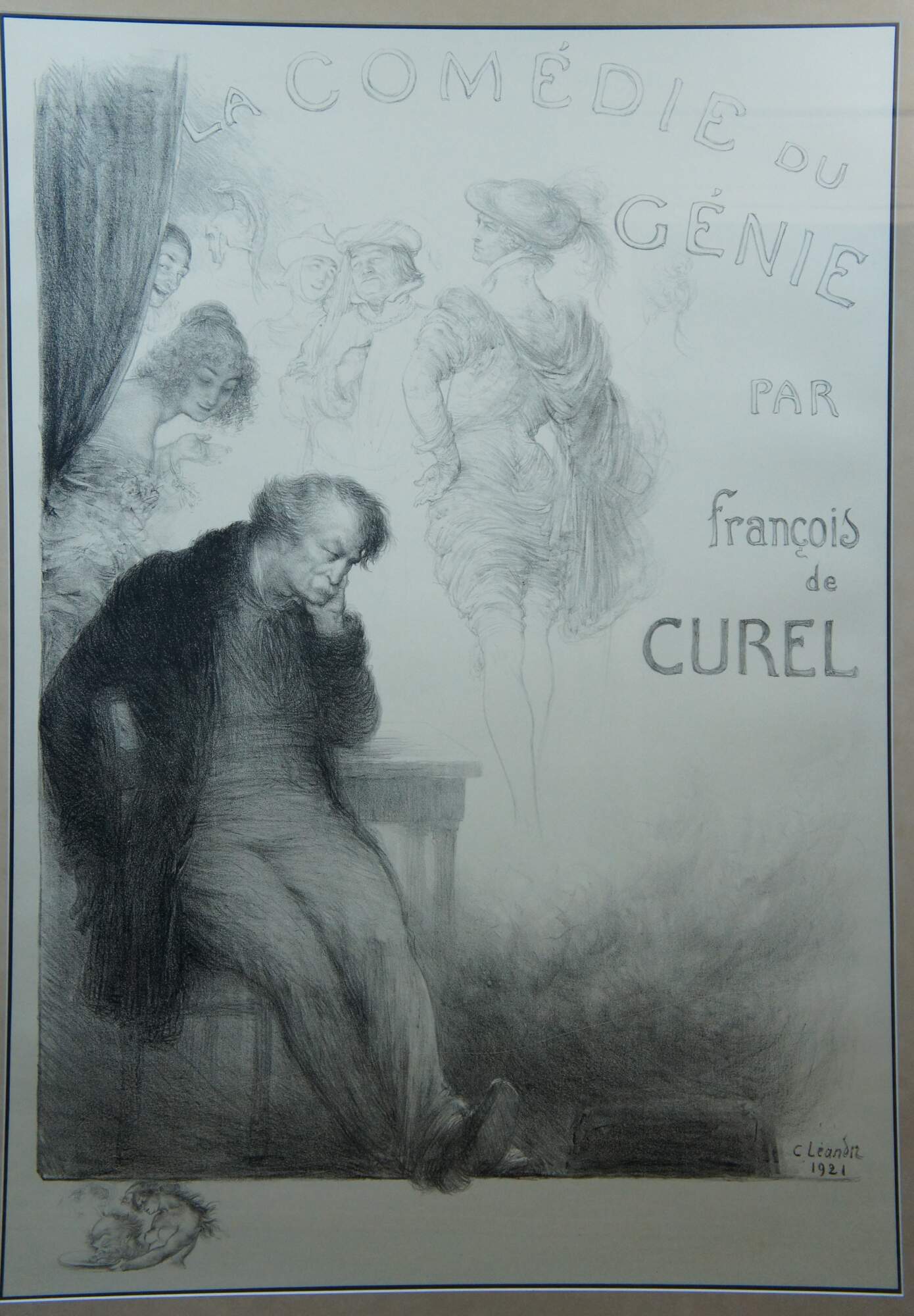 La Comédie du Génie (Comedy Genius) was a French comedy in three acts by Francois de Curel. This poster, designed in 1921 by Charles Leandre, shows and old man dozing behind a curtain while young, costumed performers laugh in the background. In the lower left corner also appears the image of a sprite / fey like being holing a mustachioed man's head on a tray. Champagne gilt frame with carved ripples; beige mat.