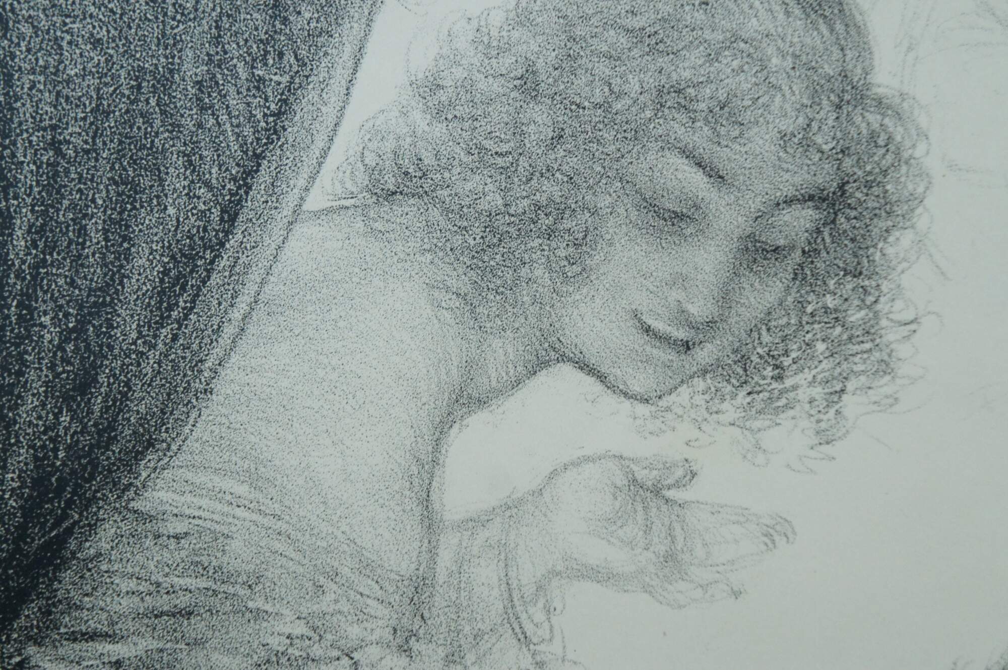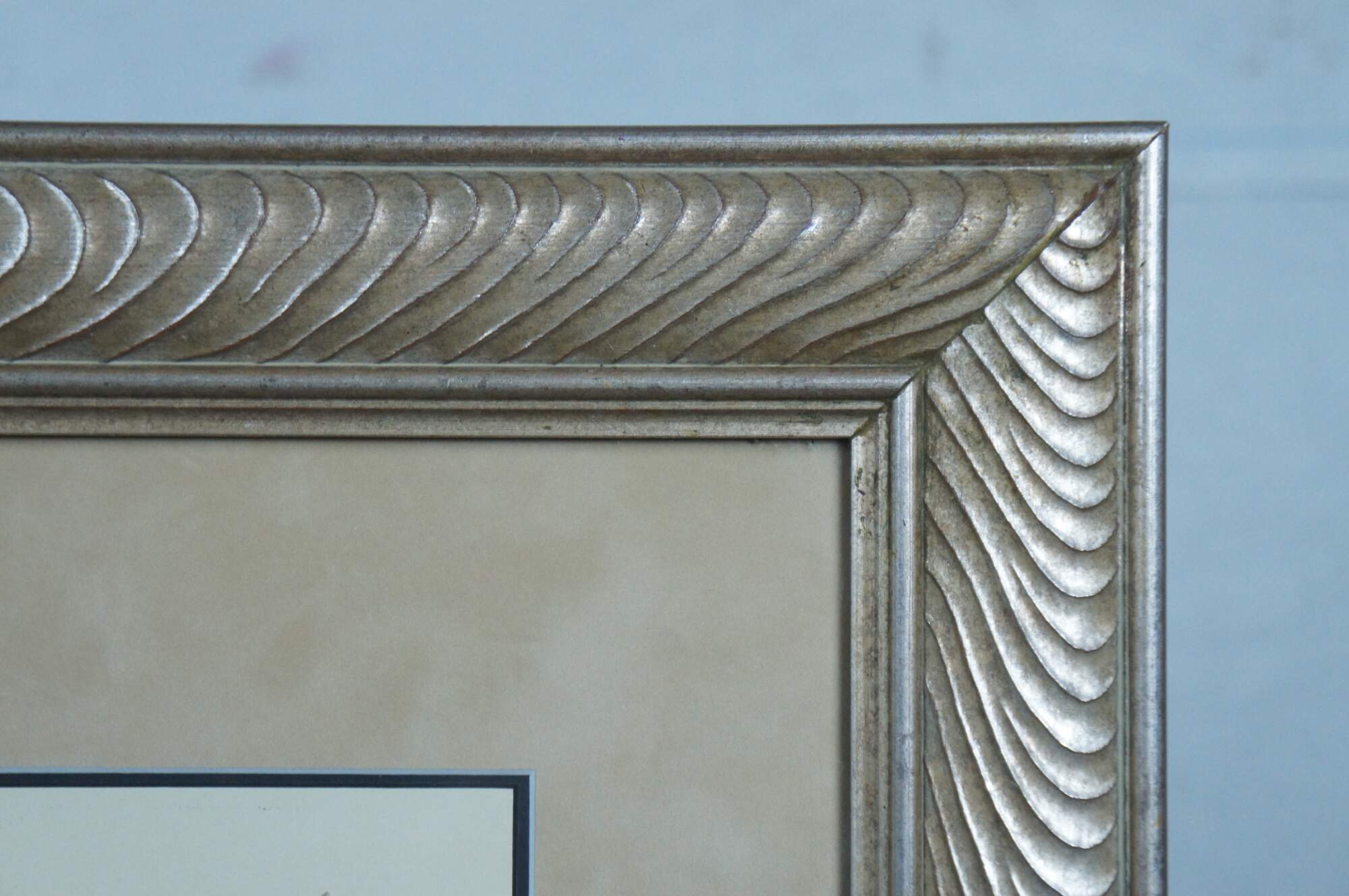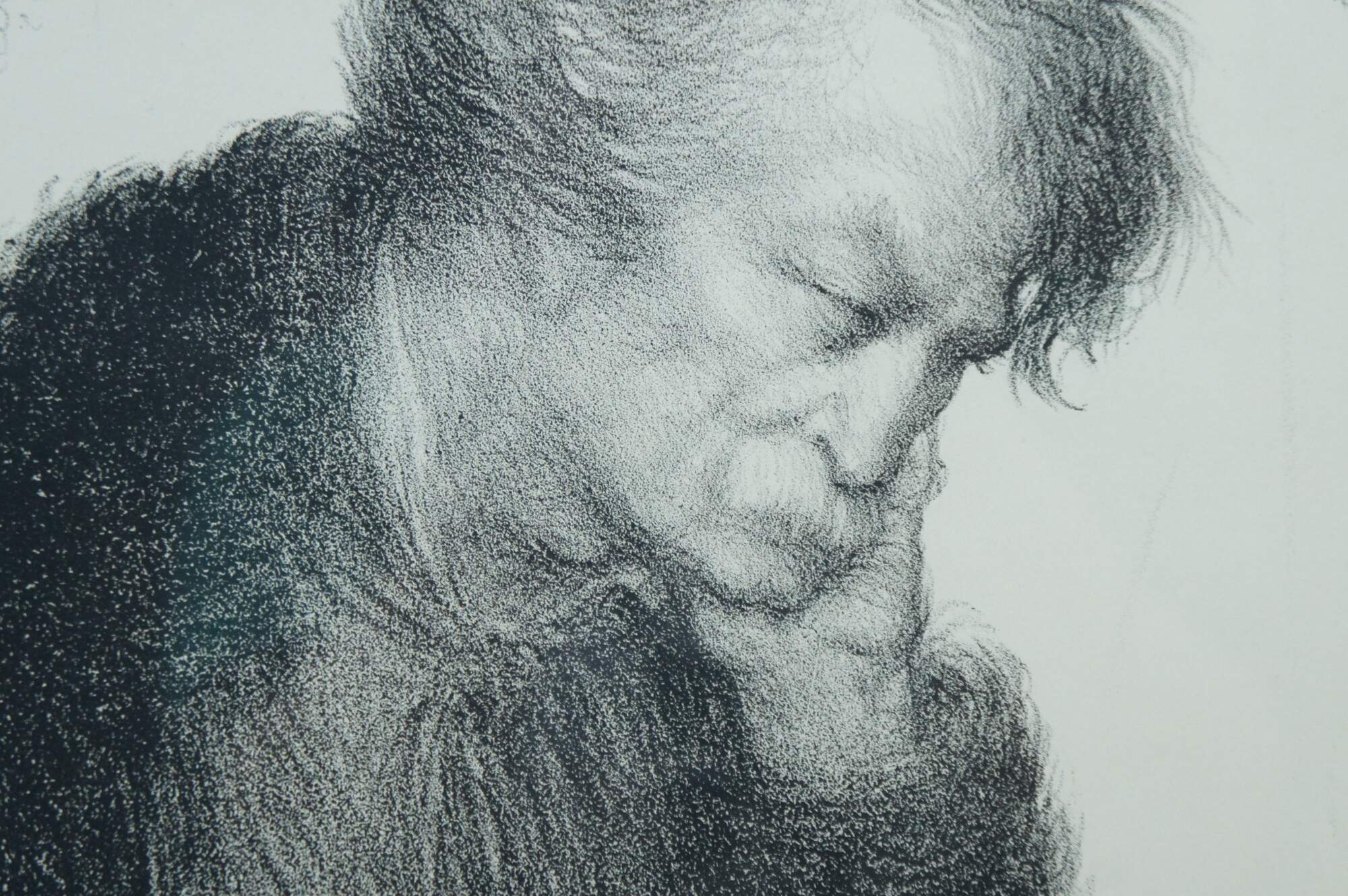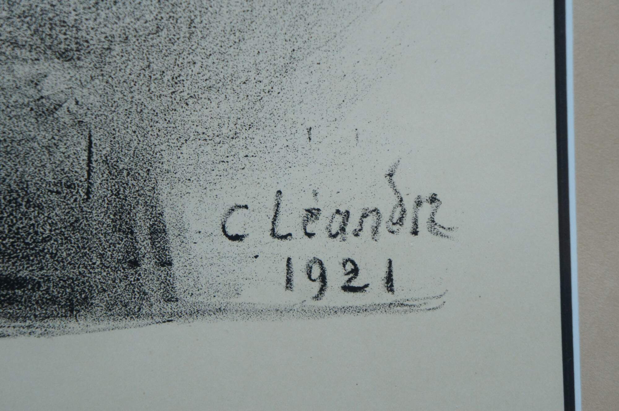 La Comédie du Génie (Comedy Genius) was a French comedy in three acts by Francois de Curel. This poster, designed in 1921 by Charles Leandre, shows and old man dozing behind a curtain while young, costumed performers laugh in the background. In the lower left corner also appears the image of a sprite / fey like being holing a mustachioed man's head on a tray. Champagne gilt frame with carved ripples; beige mat.