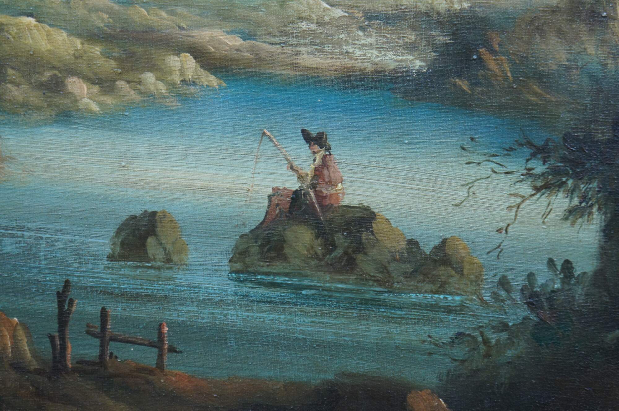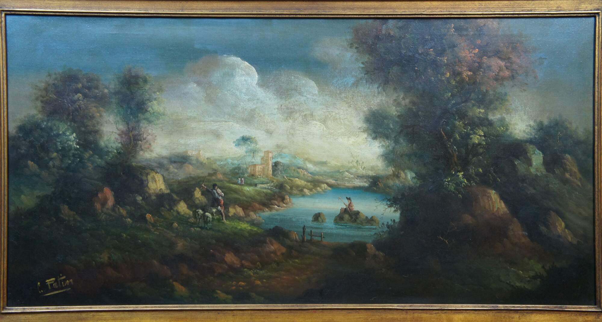 Vintage French Old World / Renaissance style oil painting on canvas showing a sweeping landscape, a shepherd, a man fishing on a lake, and a pair of figures by a distant stone castle. After Louis Joseph Alphonse Patin. Giltwood frame with carved scrollwork.