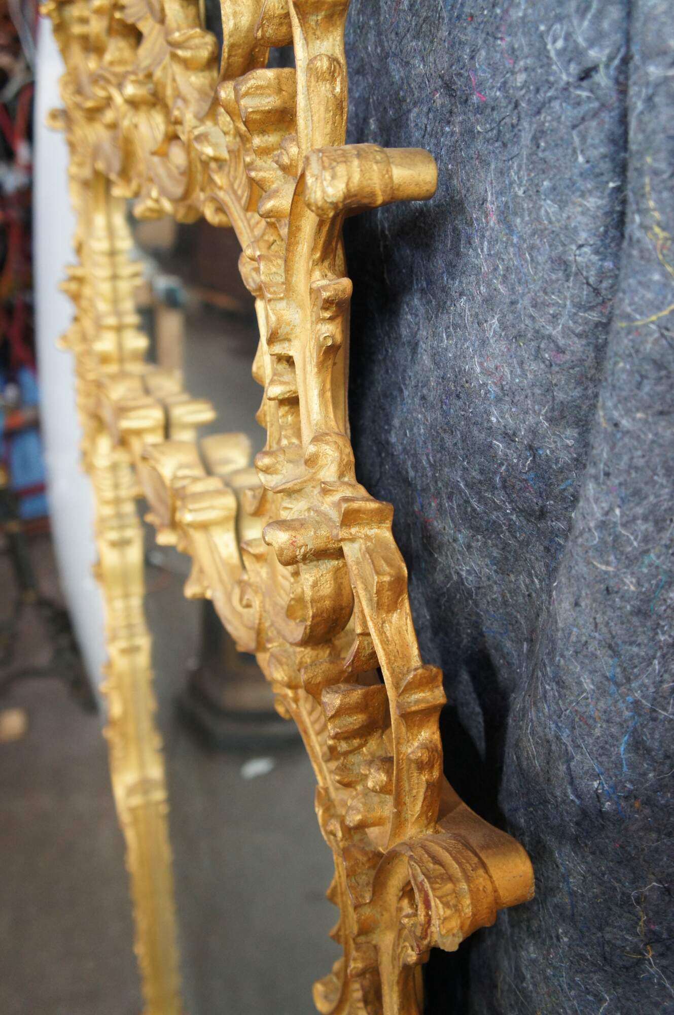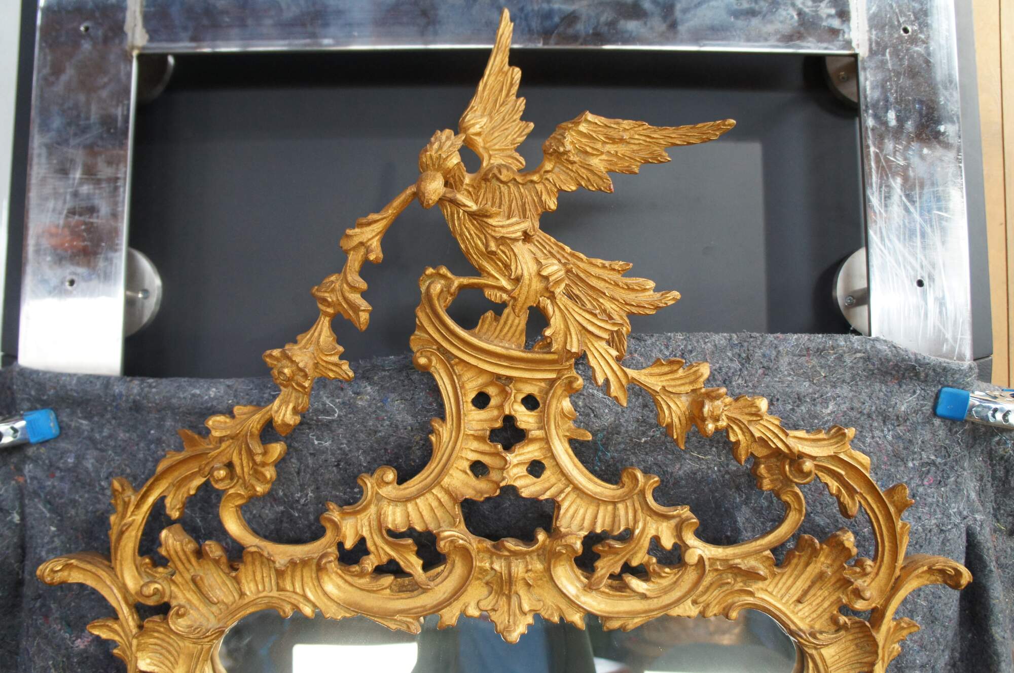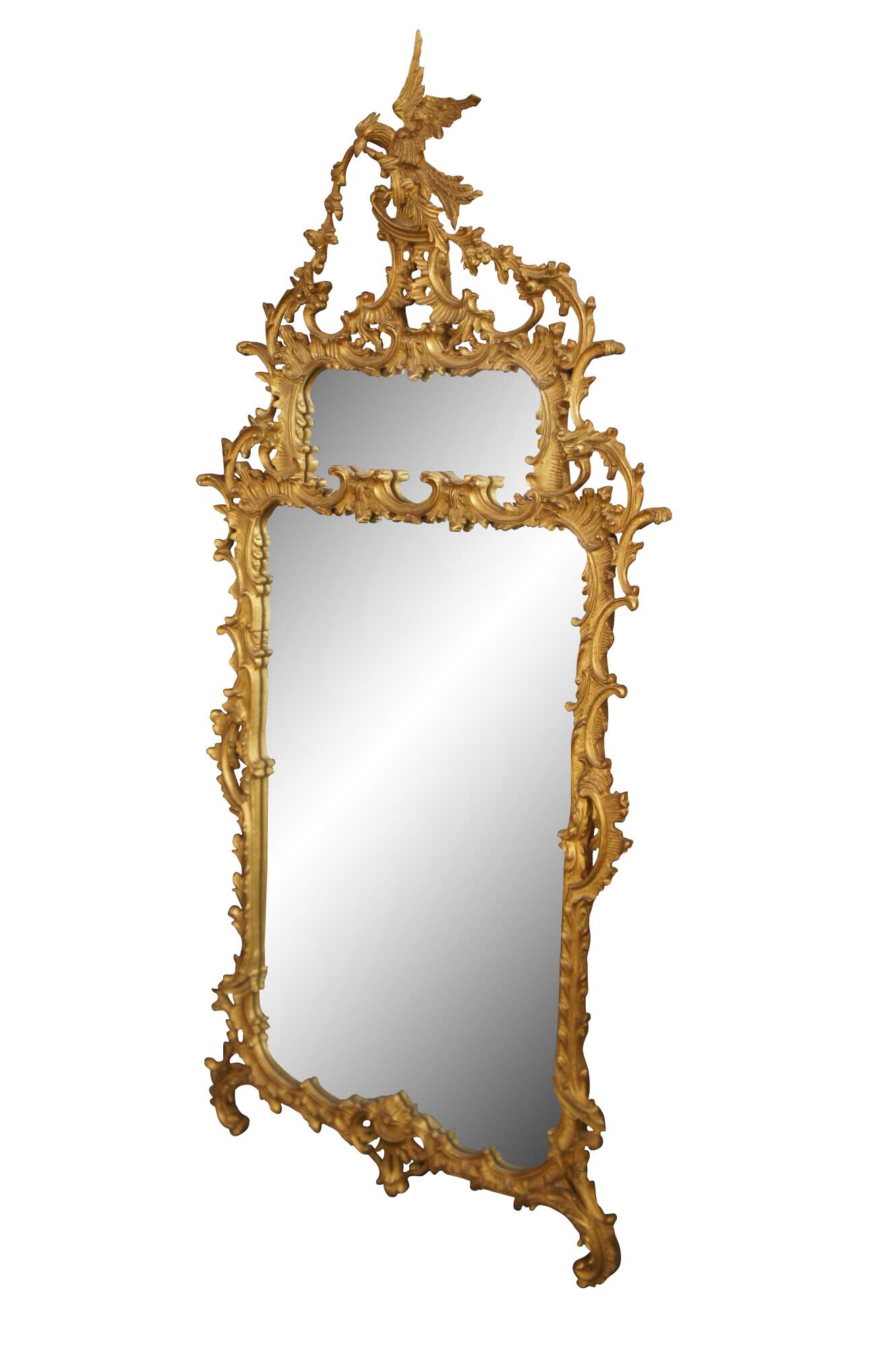 A Magnificent Chippendale Mirror in 18th century manner. the Grand Chippendale mirror is impressive in size at 80". Finished in patinated gold with a dramatic frame of pierced Rococo C scrolls, scalloping and foliate. The Phoenix, or Ho Ho Bird by the English reference, is cresting the top of the frame. A symbol taken from the Dynasties of ancient Egypt. The Bird is a mysterious creature with a long beak, curved neck, flowing tail and claws. A Phoenix was typical on Chippendale furniture and mirror frame design of the period symbolizing the prominence of 18th Century England. The Grand Chippendale Mirror dates to the second half of the 20th century.