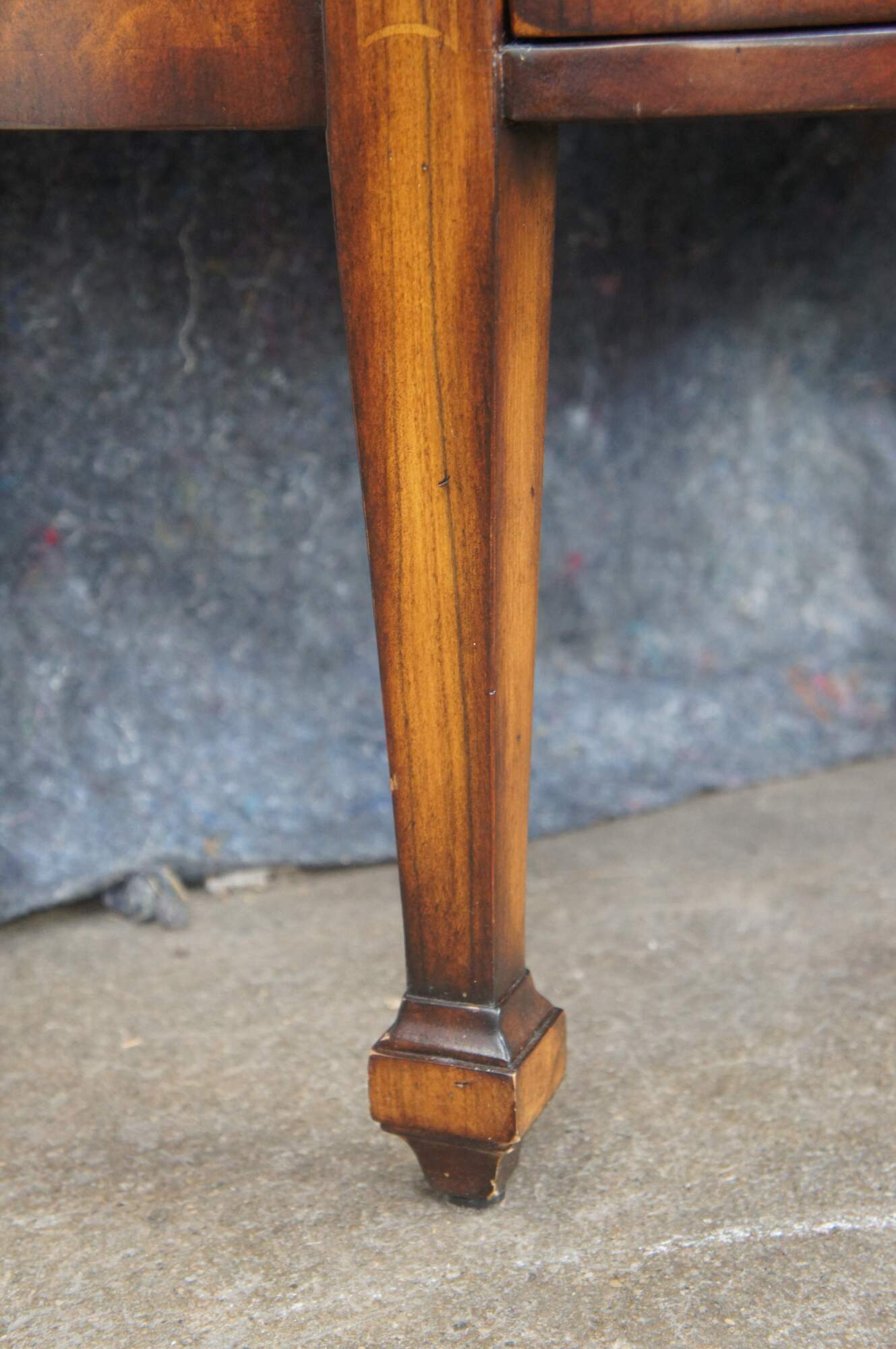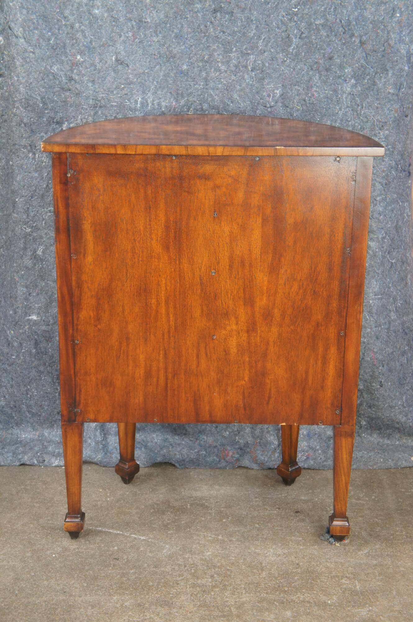 An exquisite Demilune / Crescent / Halfmoon hall table by Theodore Alexander, circa 2000s. Features a mahogany burl frame with four drawers and foliate and foliate inlaid stiles over square tapered legs leading to spade feet. Each drawer is accented by figural brass lion head knockers.