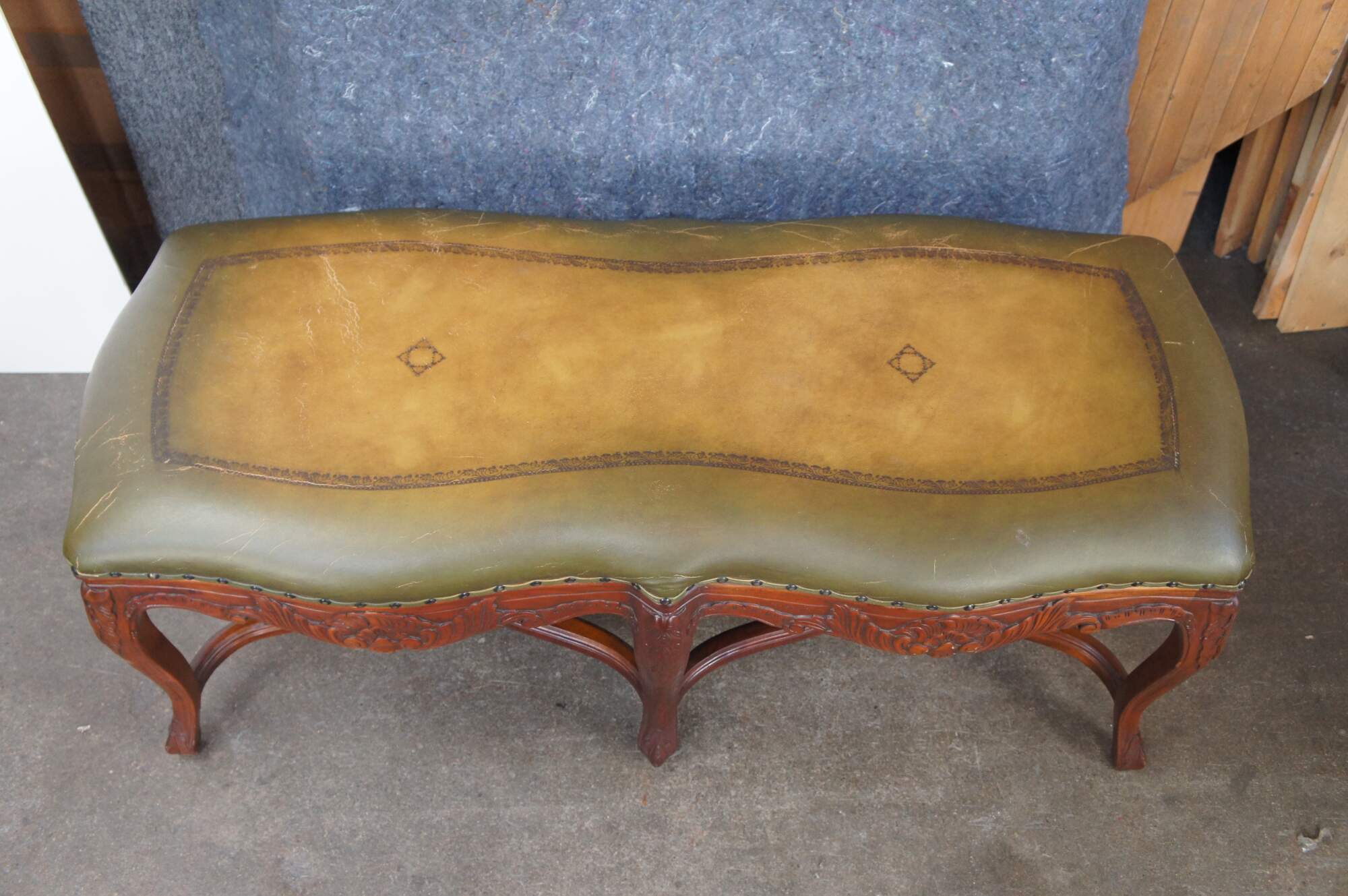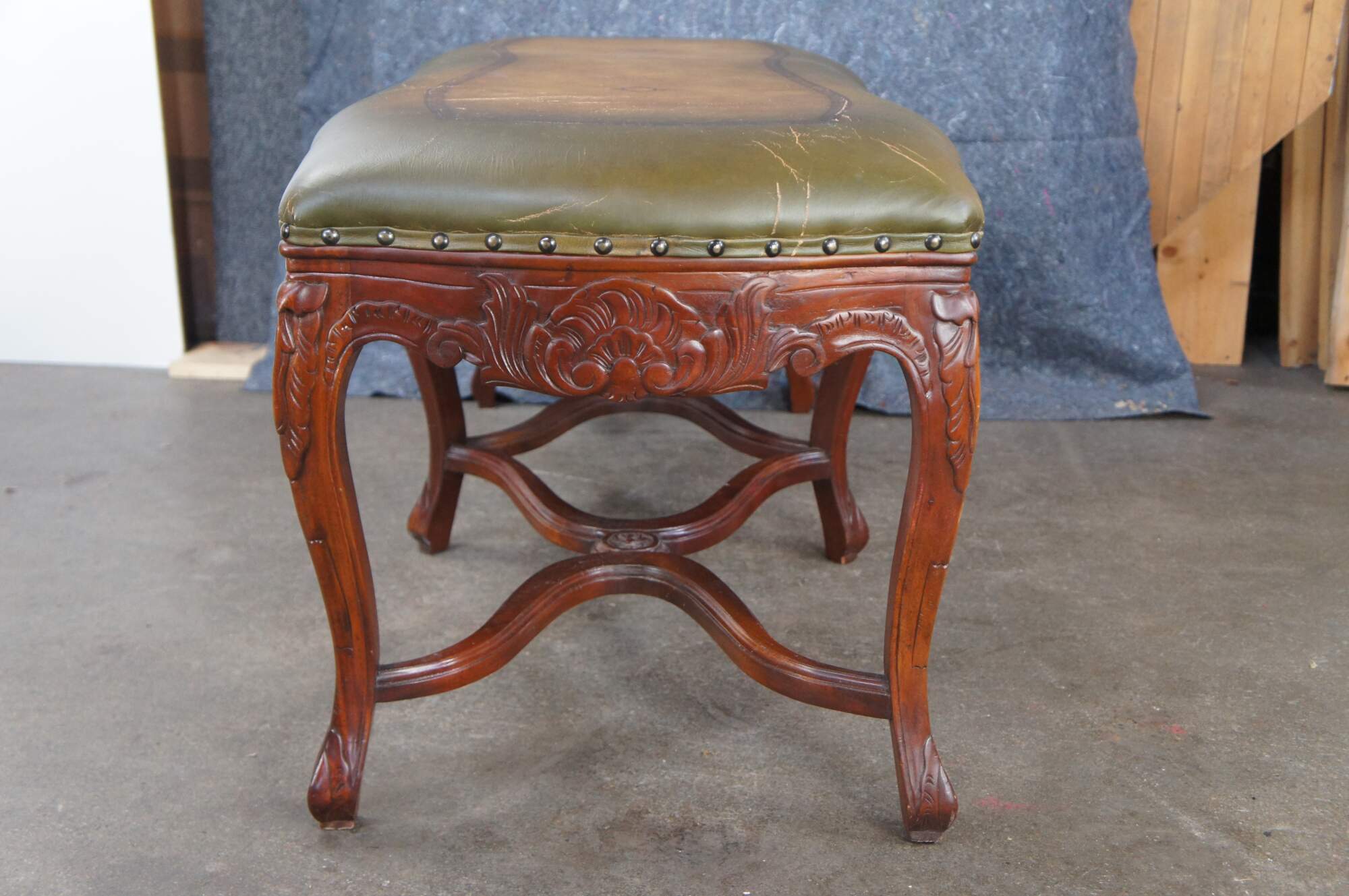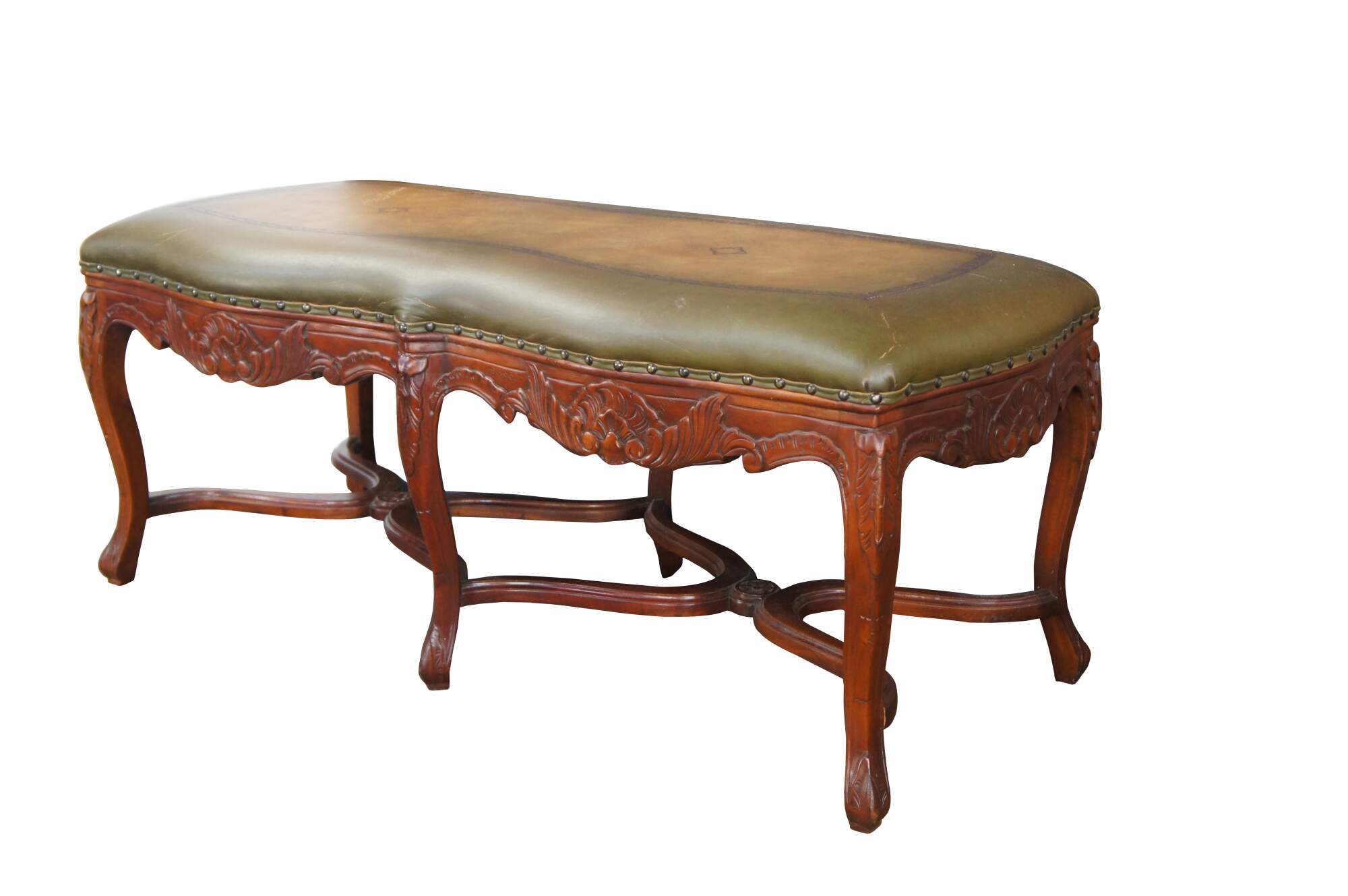 Late 20th Century French inspired foyer / window bench. Features tooled leather green upholstery over carved mahogany frame with cabriole legs and double x form stretchers.