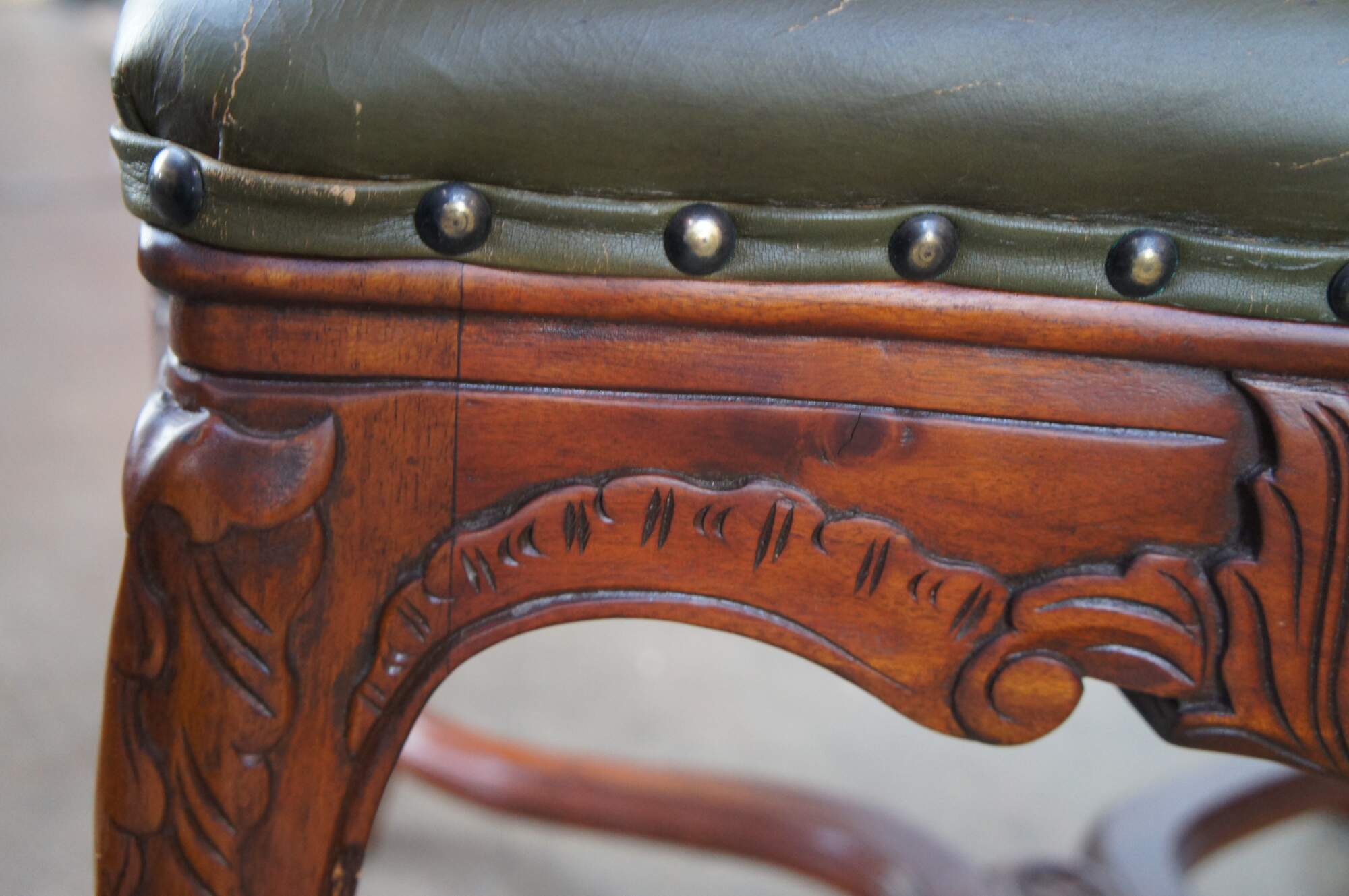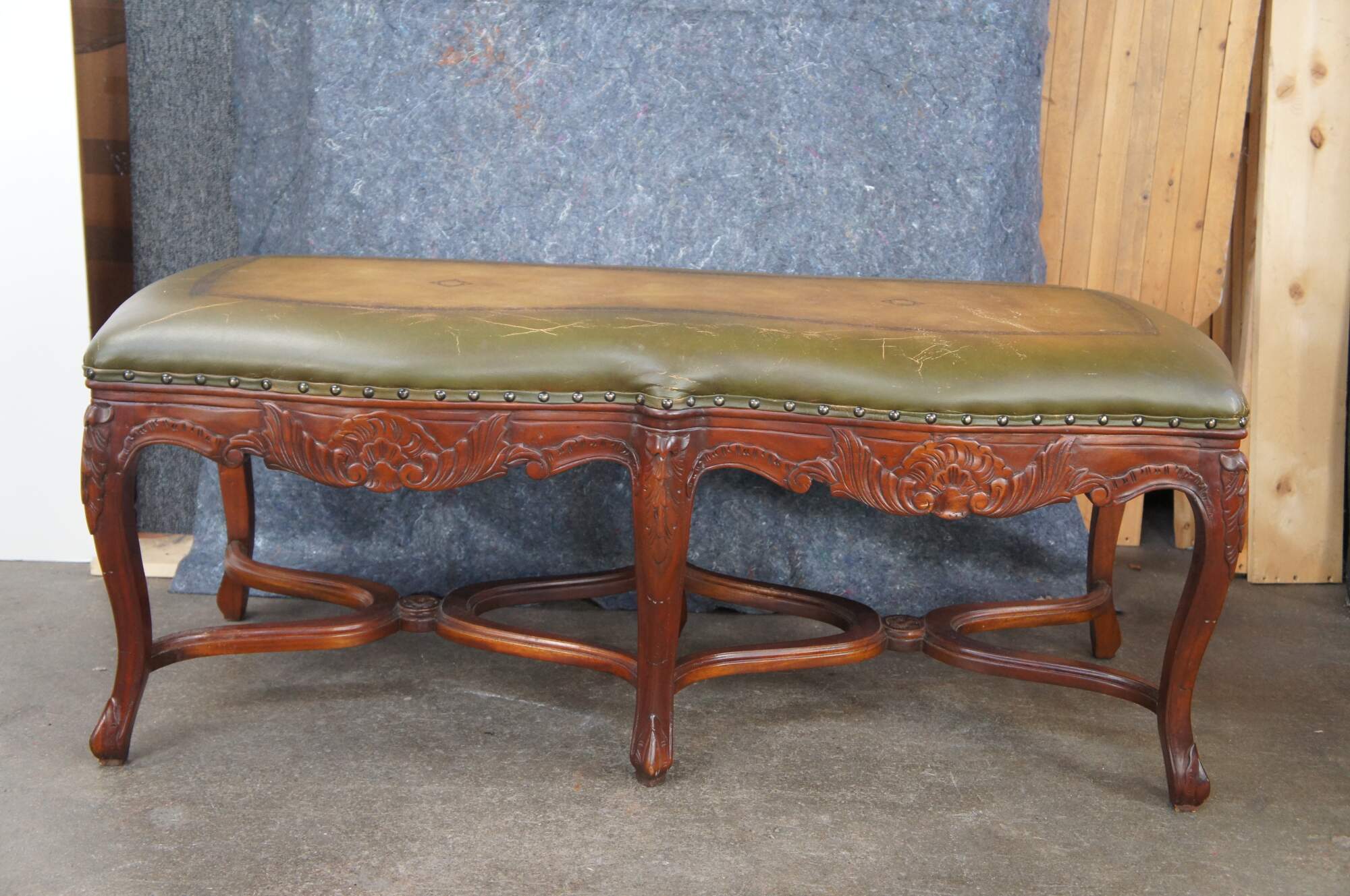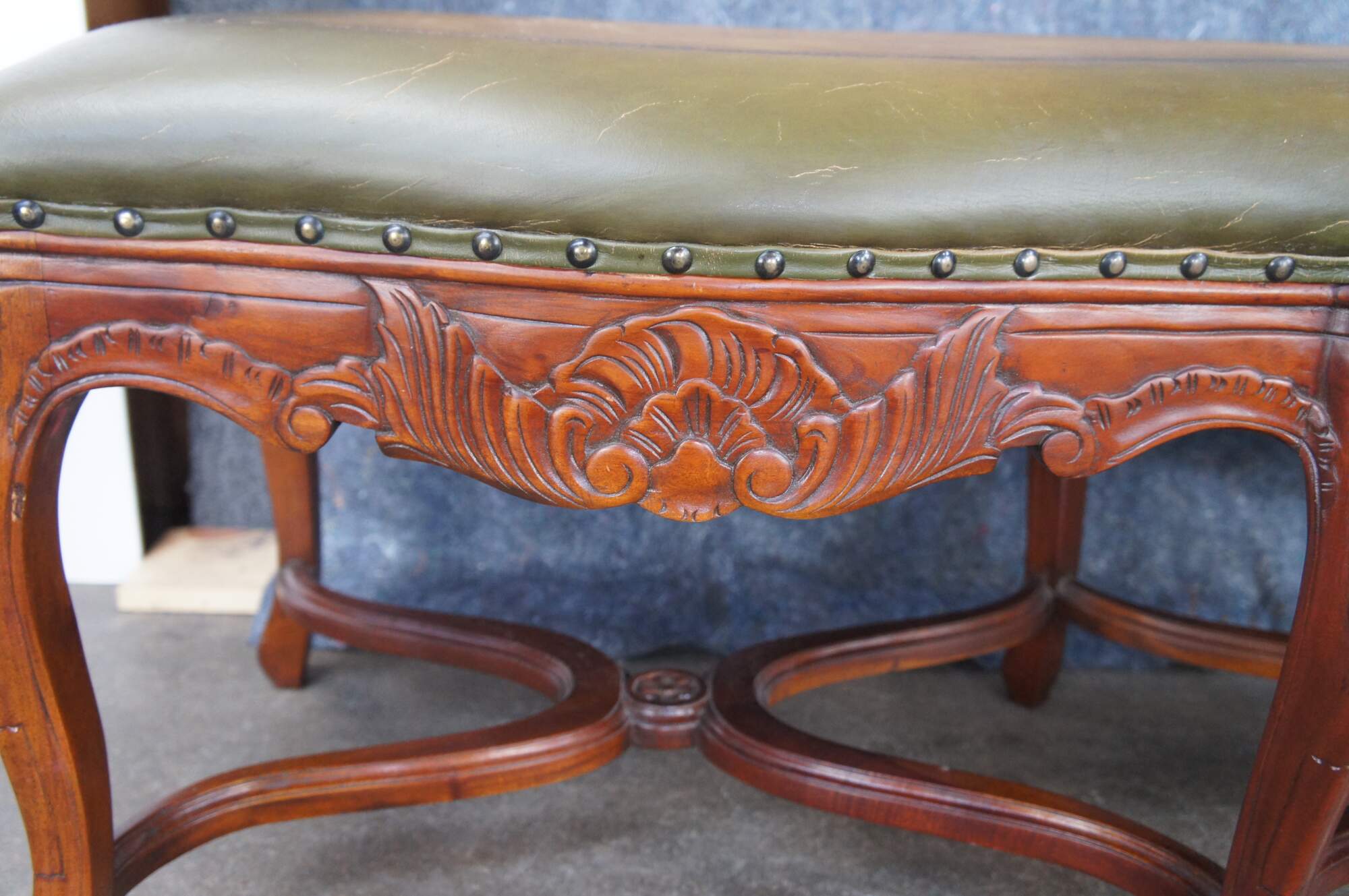 Late 20th Century French inspired foyer / window bench. Features tooled leather green upholstery over carved mahogany frame with cabriole legs and double x form stretchers.