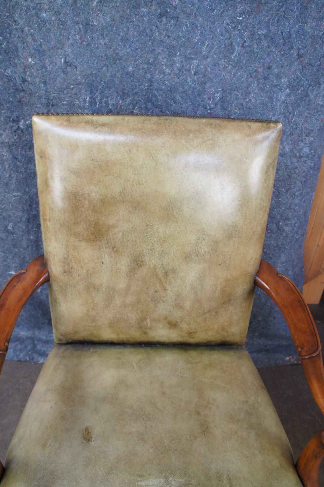 A stately Georgian style armchair by Arthur Brett, English Circa Late 20th Century. Features a mahogany frame with contoured gooseneck arms, a green leather upholstered seat with brass nailhead trim and cabriole legs, carved at the knee with pad feet. Perfect for use as a library reading chair, desk chair, or an occasional arm chair. #1919x, 139586
