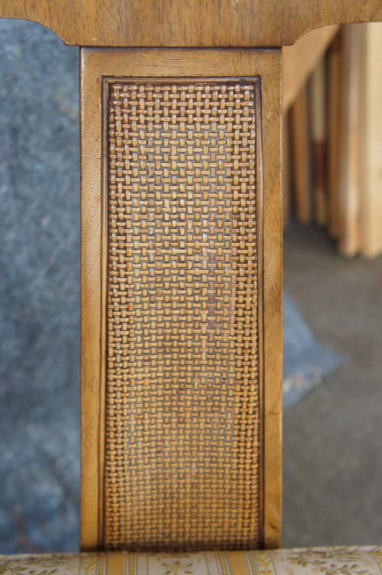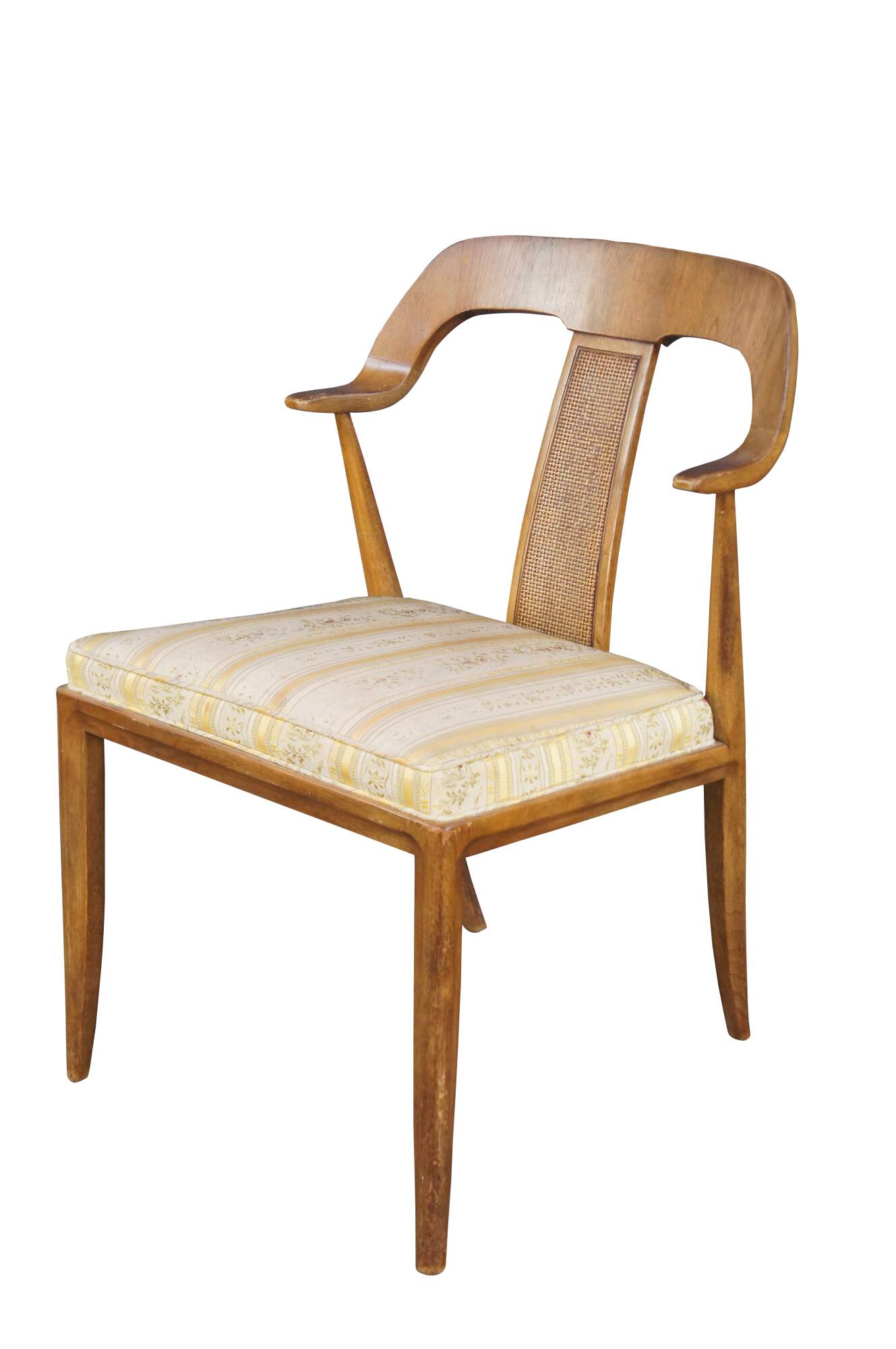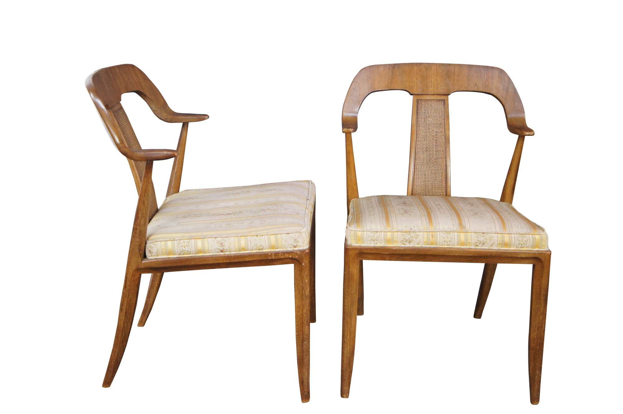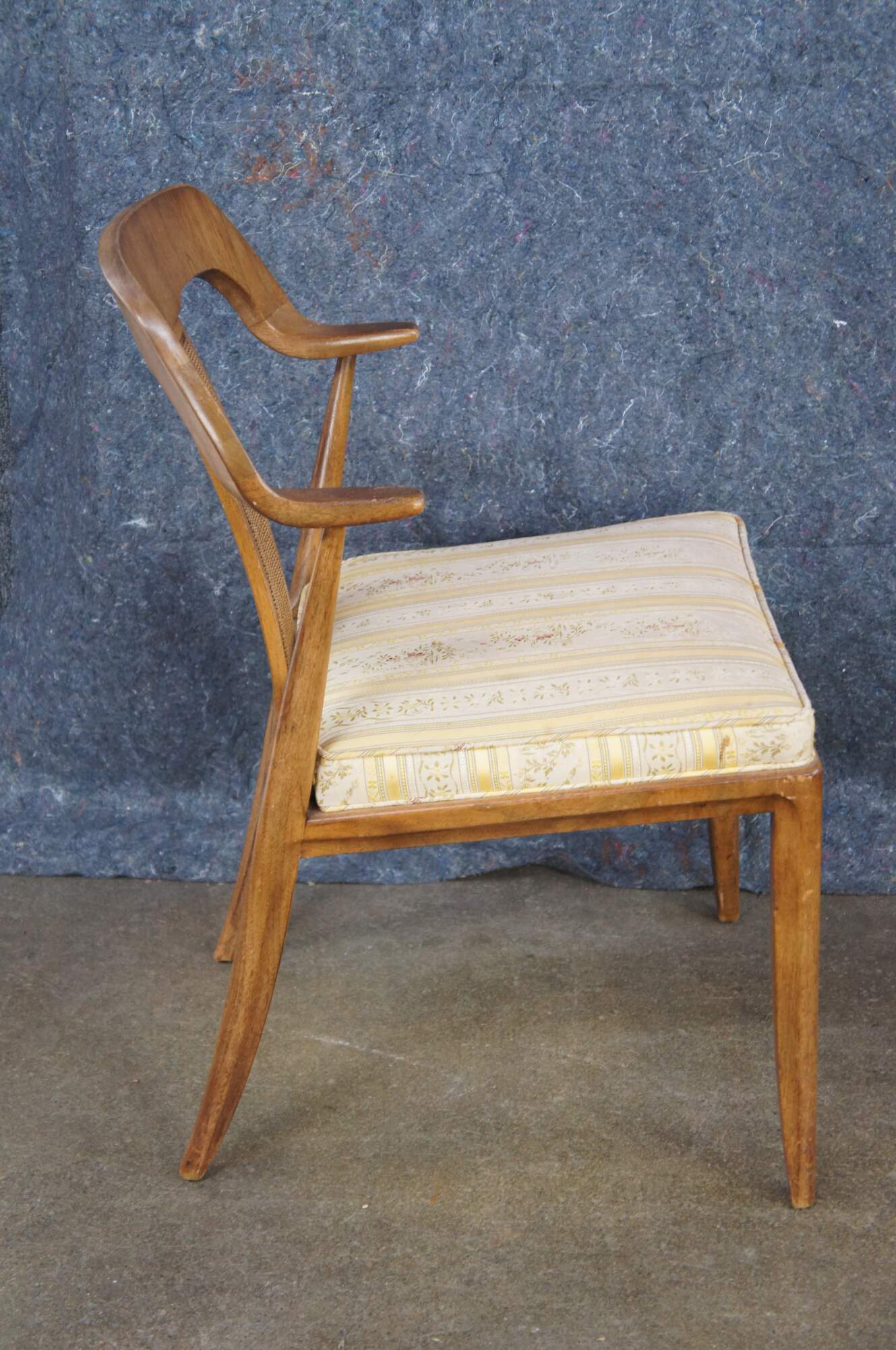 4 Michael Taylor for Tomlinson Sophisticate Walnut Dining Chairs. American Mid Century. Sculptural curved crests with woven wicker splats. Neoclassical style fabric.