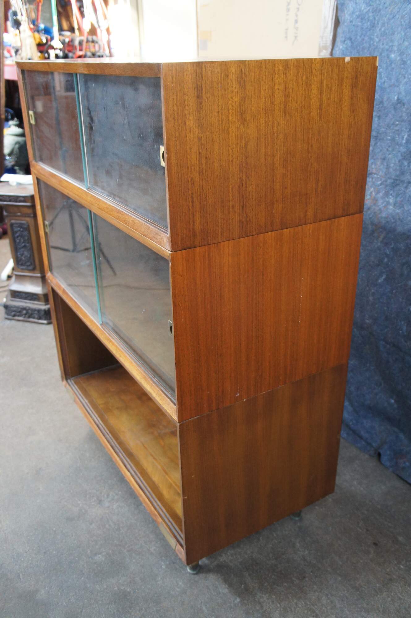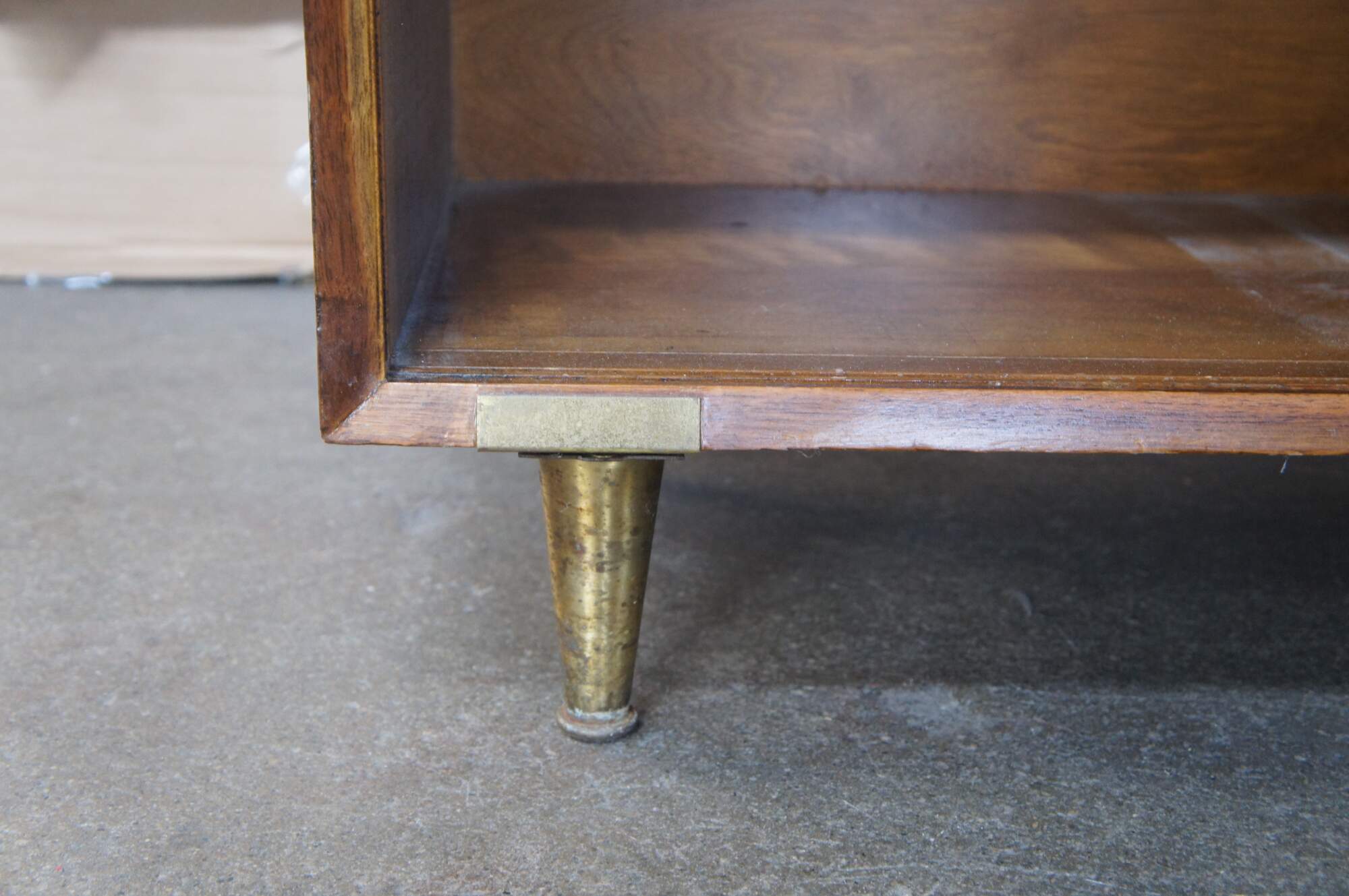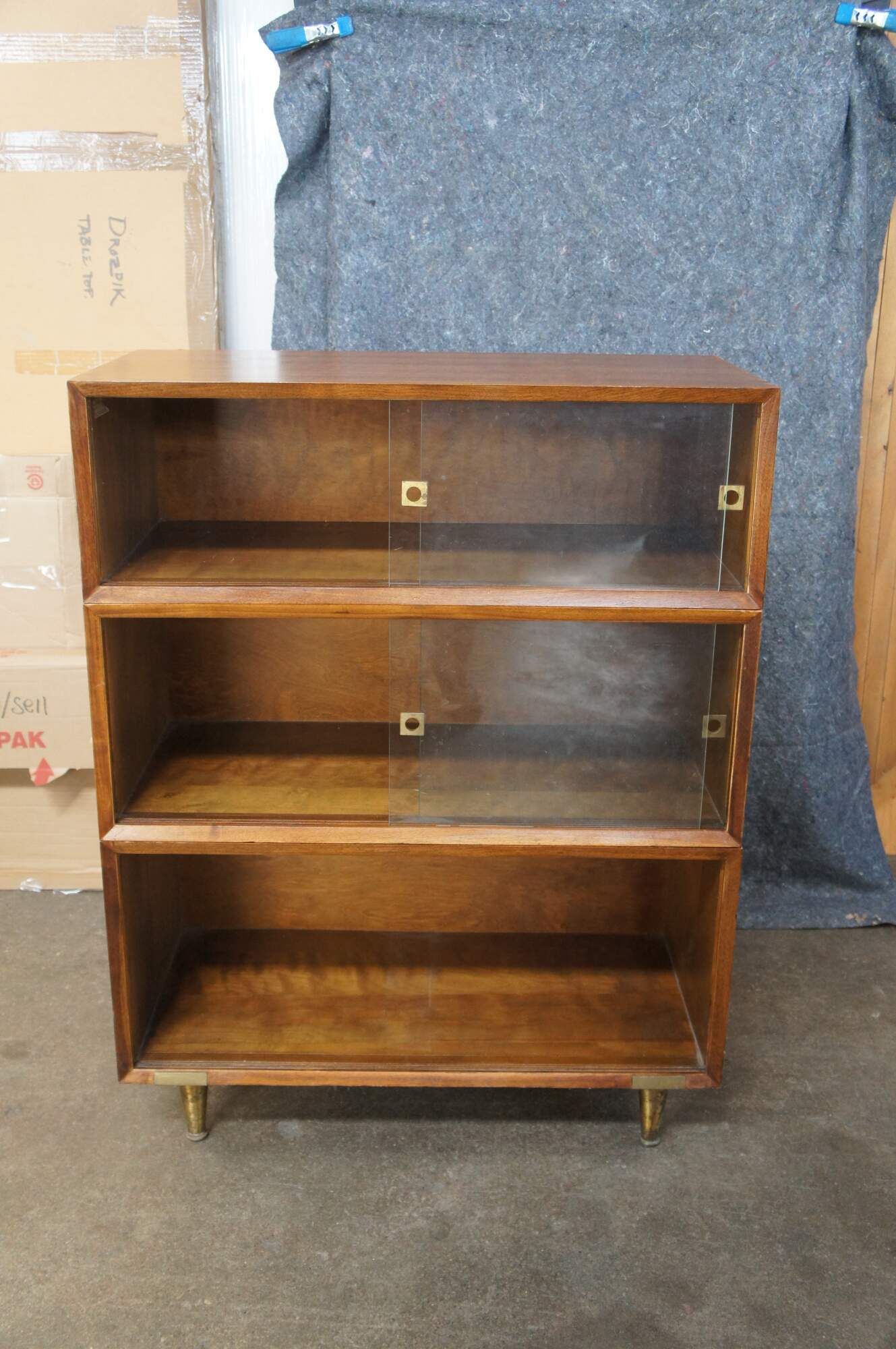 Hale Manufacturing Company Barrister Style Bookcase / Display Cabinet, circa 1970s. Made from gunstock walnut with brass tapered legs. The top two shelves have sliding glass with brass handles. The bottom section is missing glass. an intriguing cabinet with a mid century modern vibe to it.