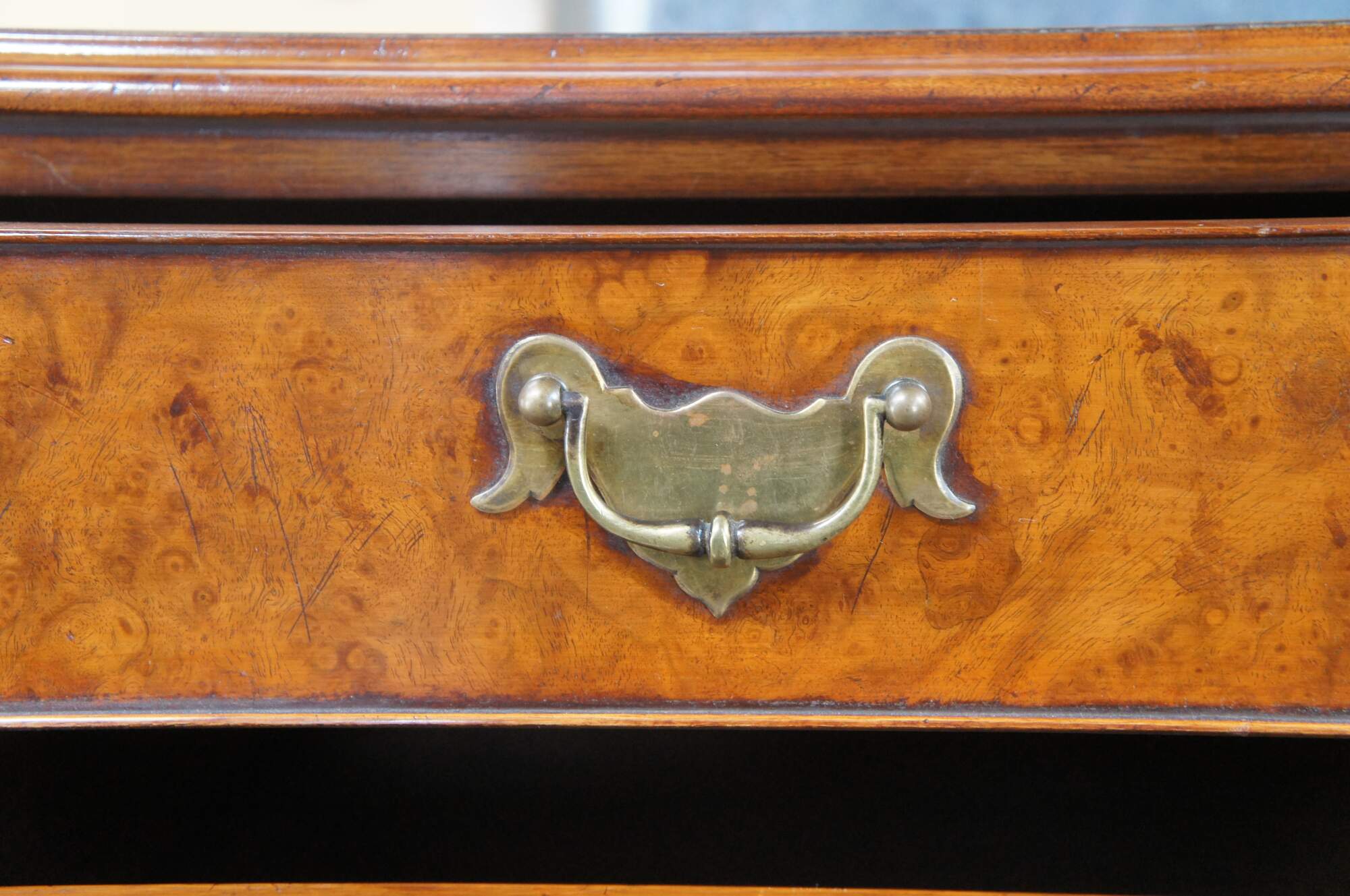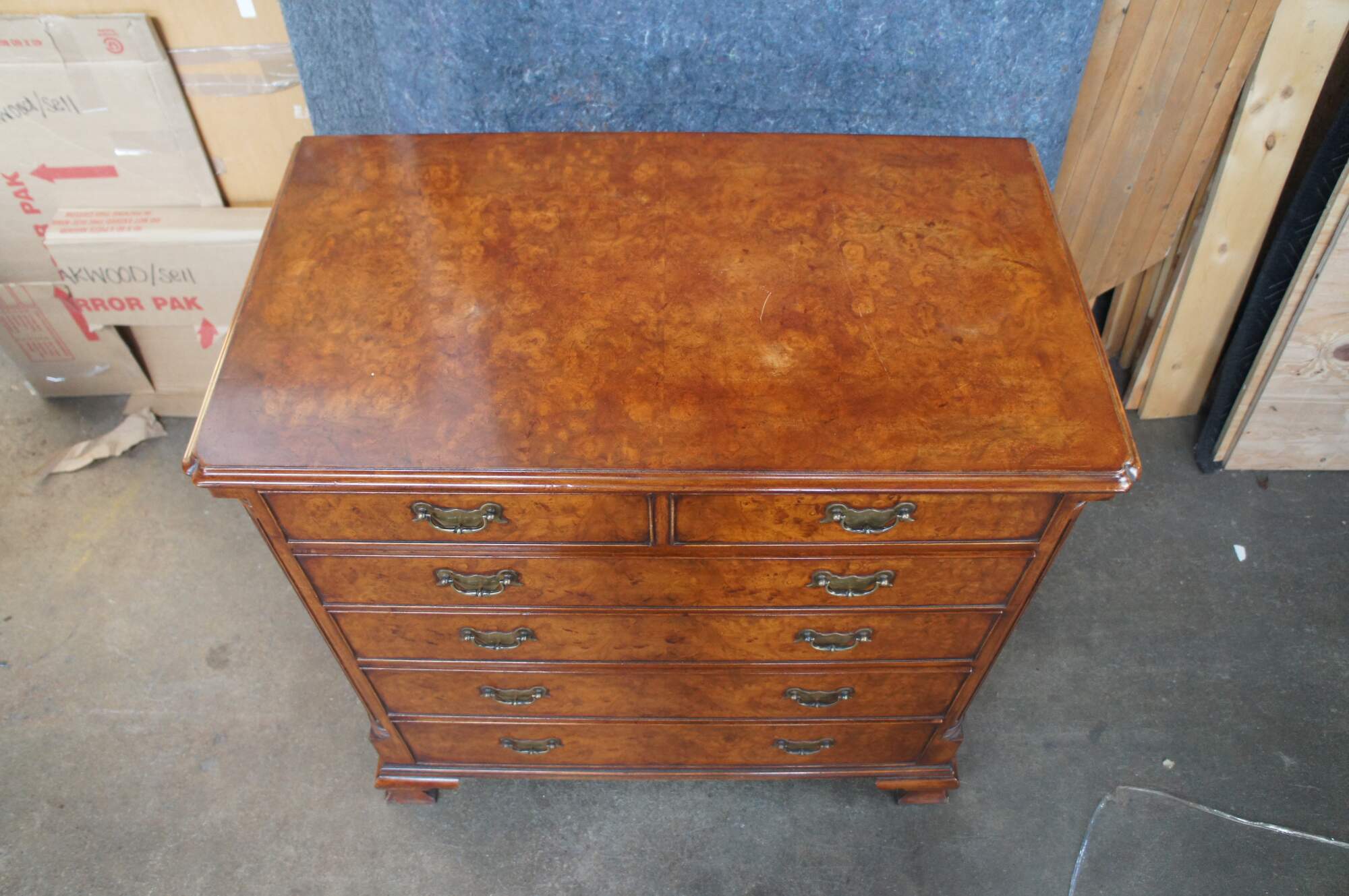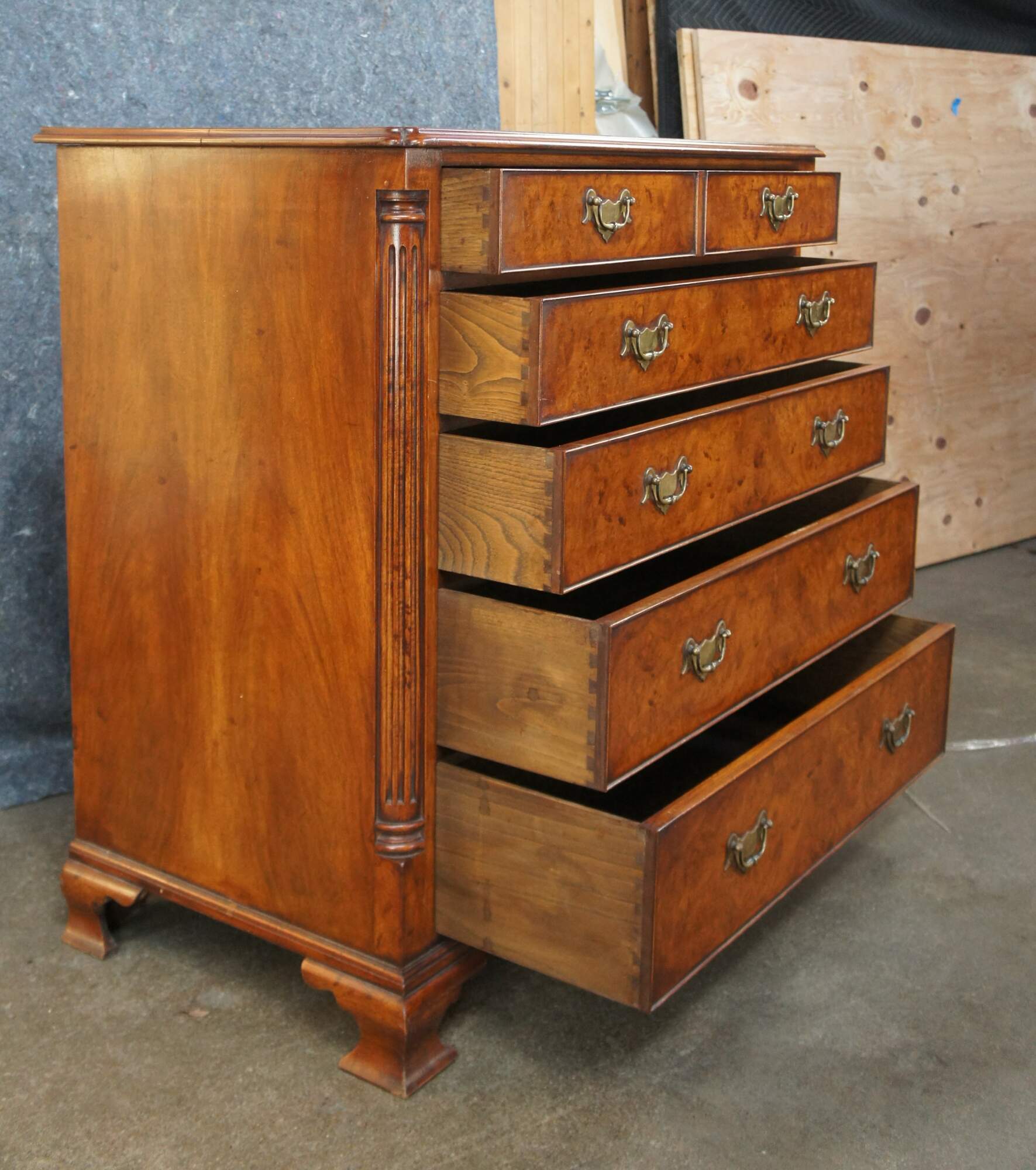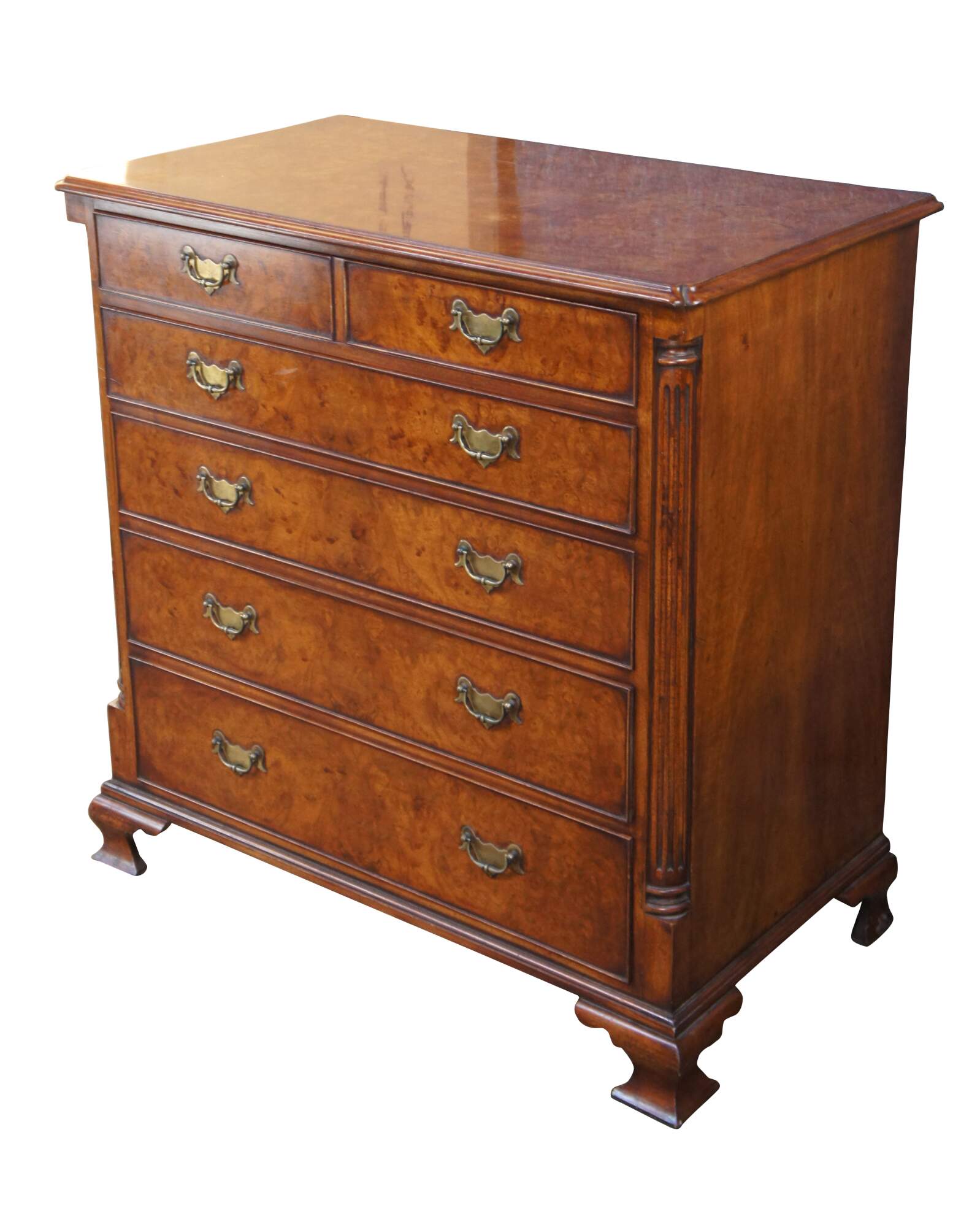 An exquisite 18th Century reproduction bachelors chest by Arthur Brett & Sons. Made from mahogany with burled front and top. Features a 2 over 4 drawer graduated design. Drawers are constructed from oak with dovetailing and colonial brass batwing hardware. The corners also known as "stiles" showcase quarter cut fluted columns. The case is supported by Ogee bracket feet. A truly exceptional example of craftsmaship and world class design.