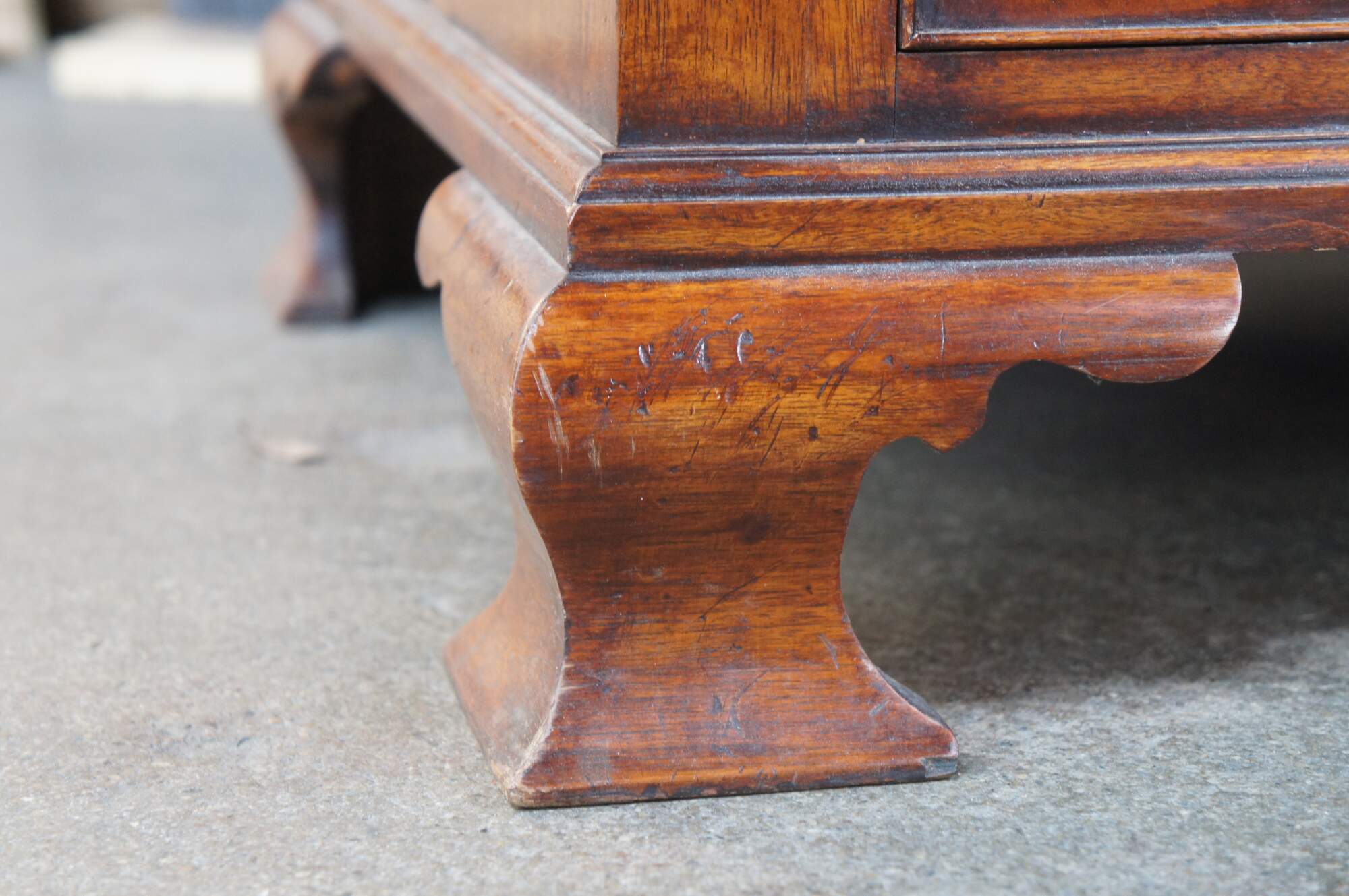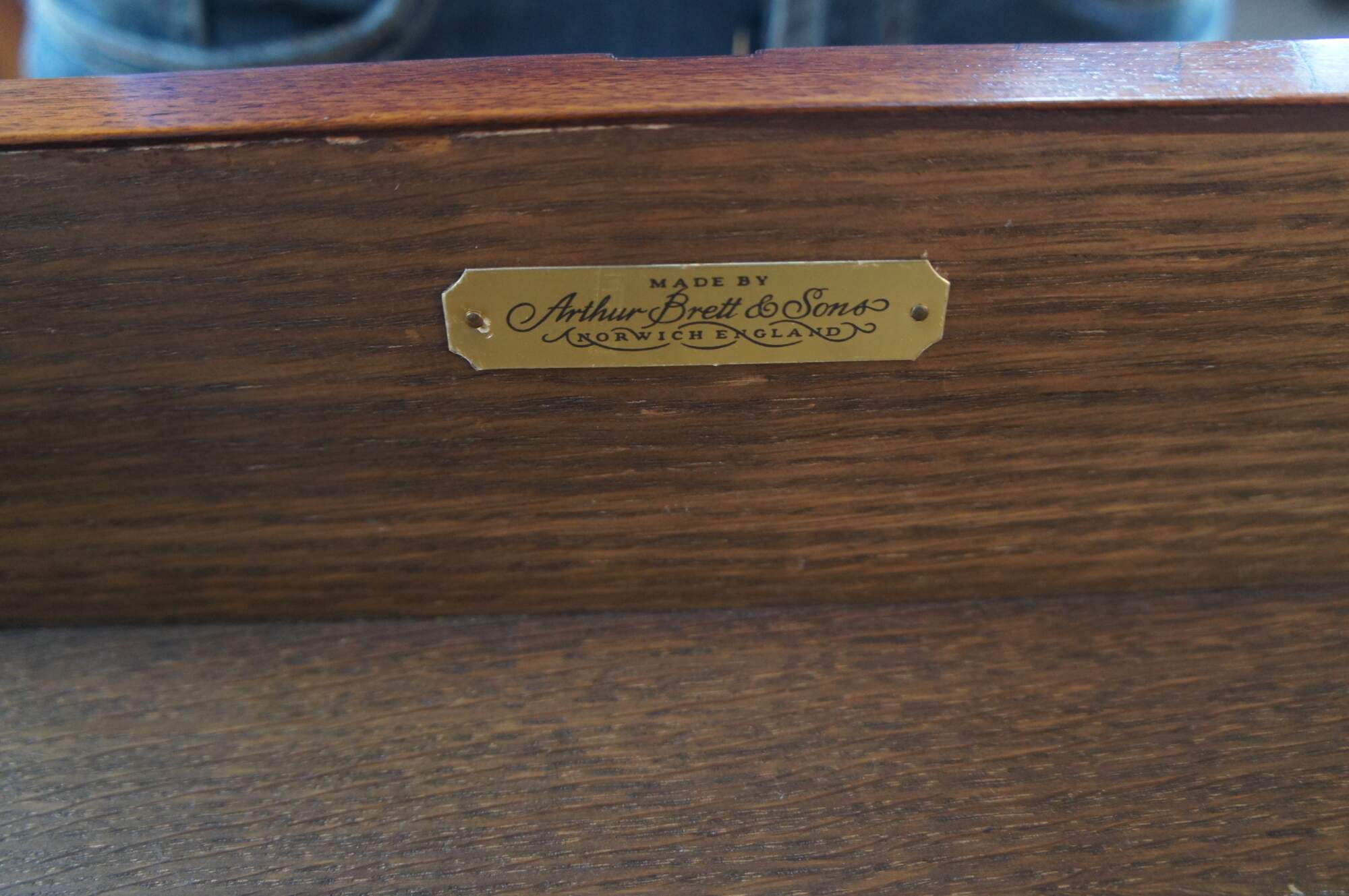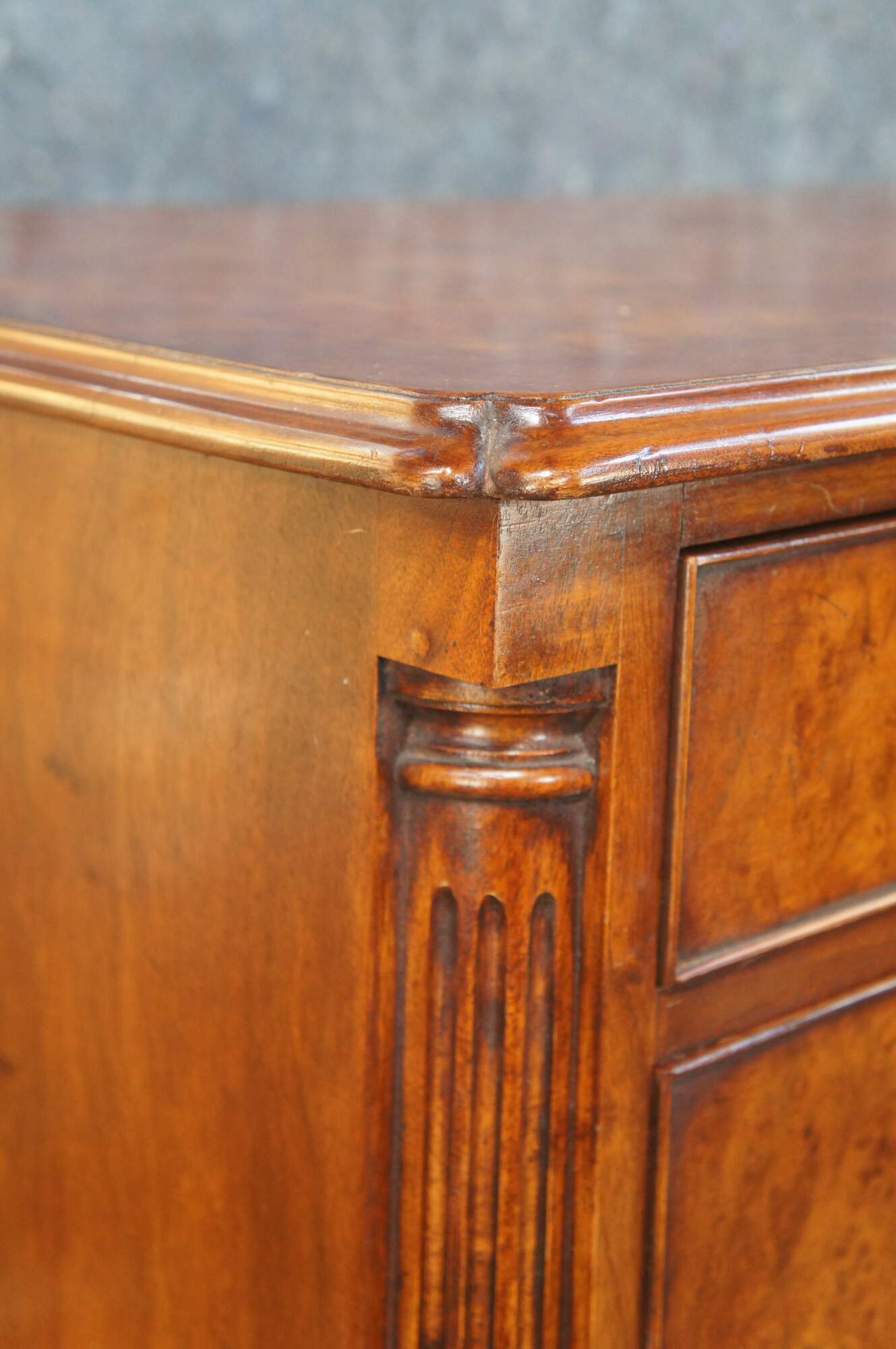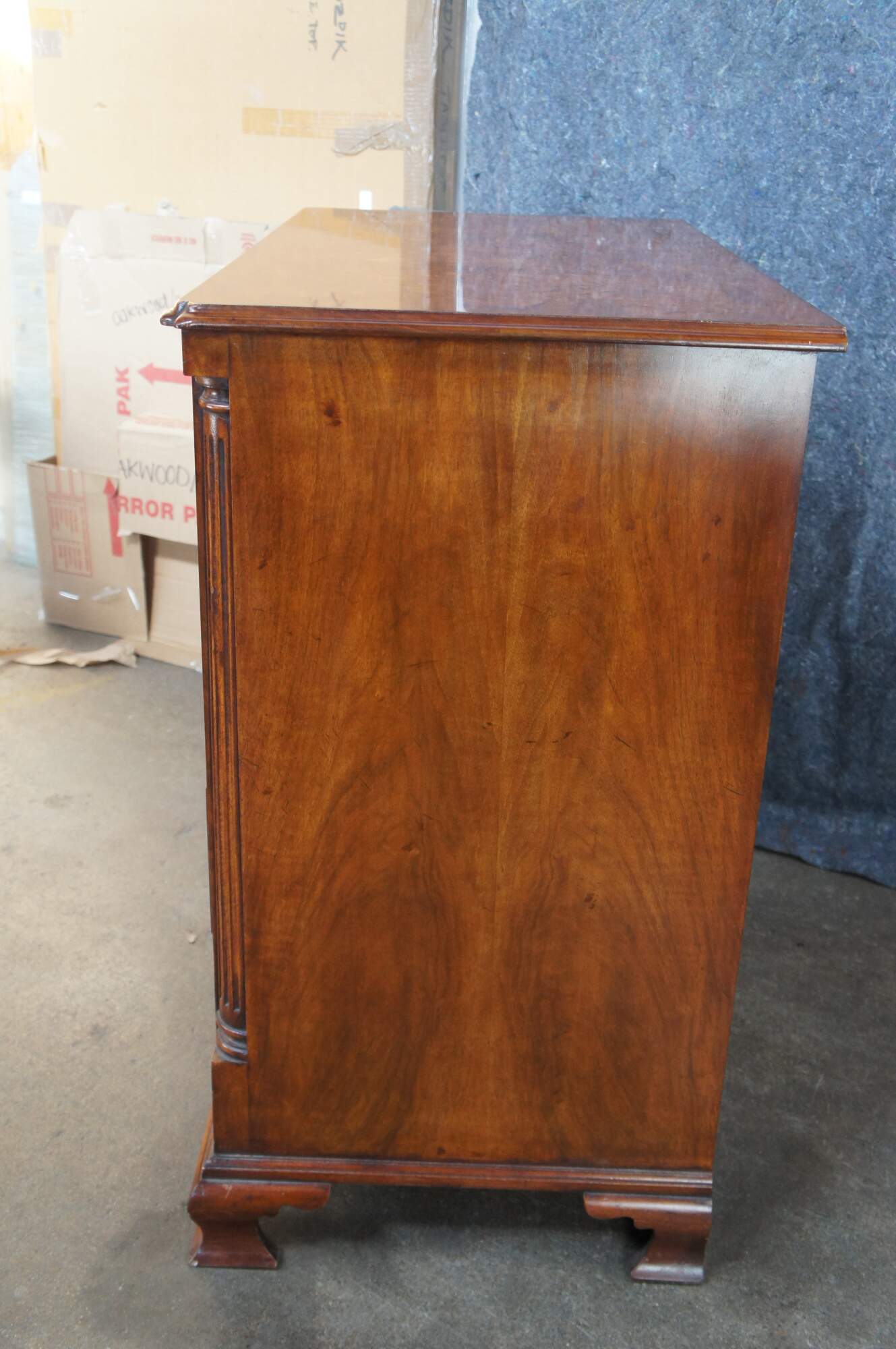 An exquisite 18th Century reproduction bachelors chest by Arthur Brett & Sons. Made from mahogany with burled front and top. Features a 2 over 4 drawer graduated design. Drawers are constructed from oak with dovetailing and colonial brass batwing hardware. The corners also known as "stiles" showcase quarter cut fluted columns. The case is supported by Ogee bracket feet. A truly exceptional example of craftsmaship and world class design.