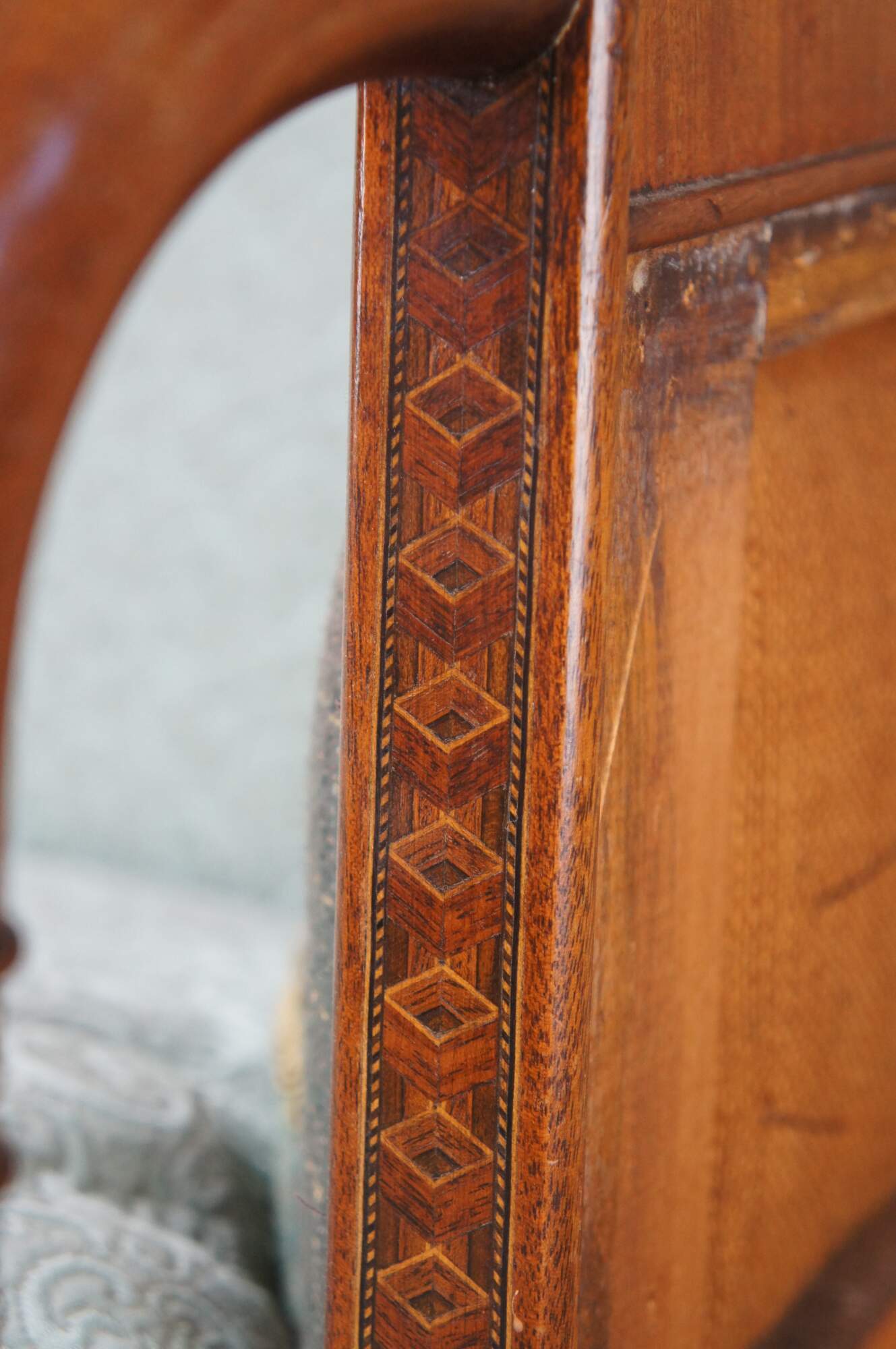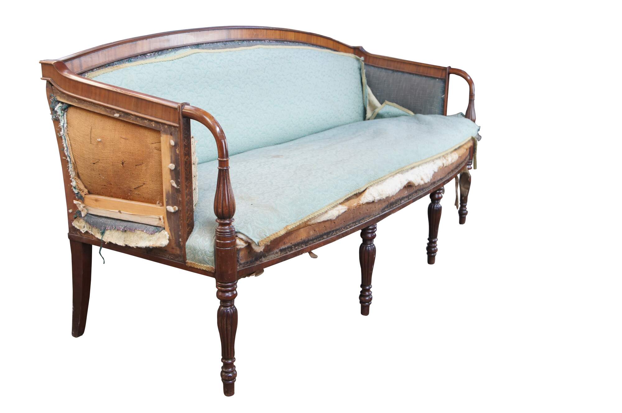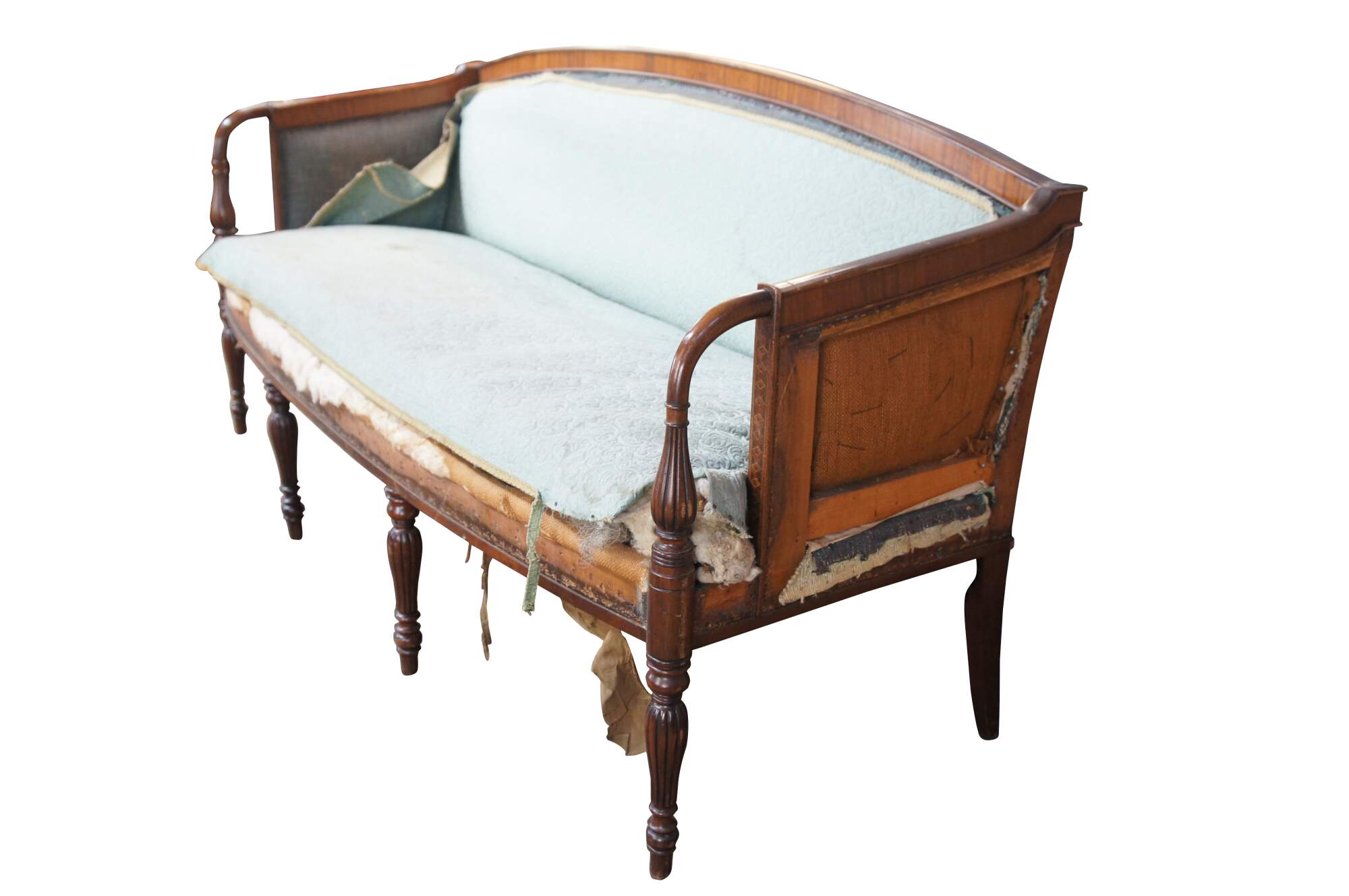 A Very Fine American Federal Period Carved Mahogany Sofa, circa 1810. Features a bowback frame with cross banding. Sloped arms lead to reeded supports in front of remarkable three-dimensional cubed and braided inlay. The sofa is supported by turned and reeded legs at the front and square tapered legs along the rear. The corss-banding along the back continues along the rear allowing the sofa to really stand out in any space. The sofa represents timeless design and is a great candidate for re-upholstery. Made in Boston, Massachusetts or Portsmouth, New Hampshire Circa 1810