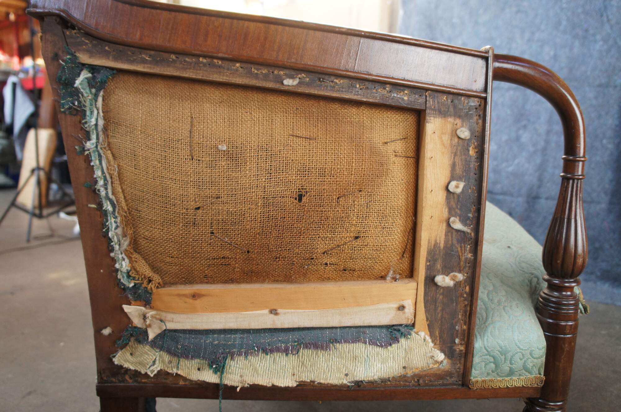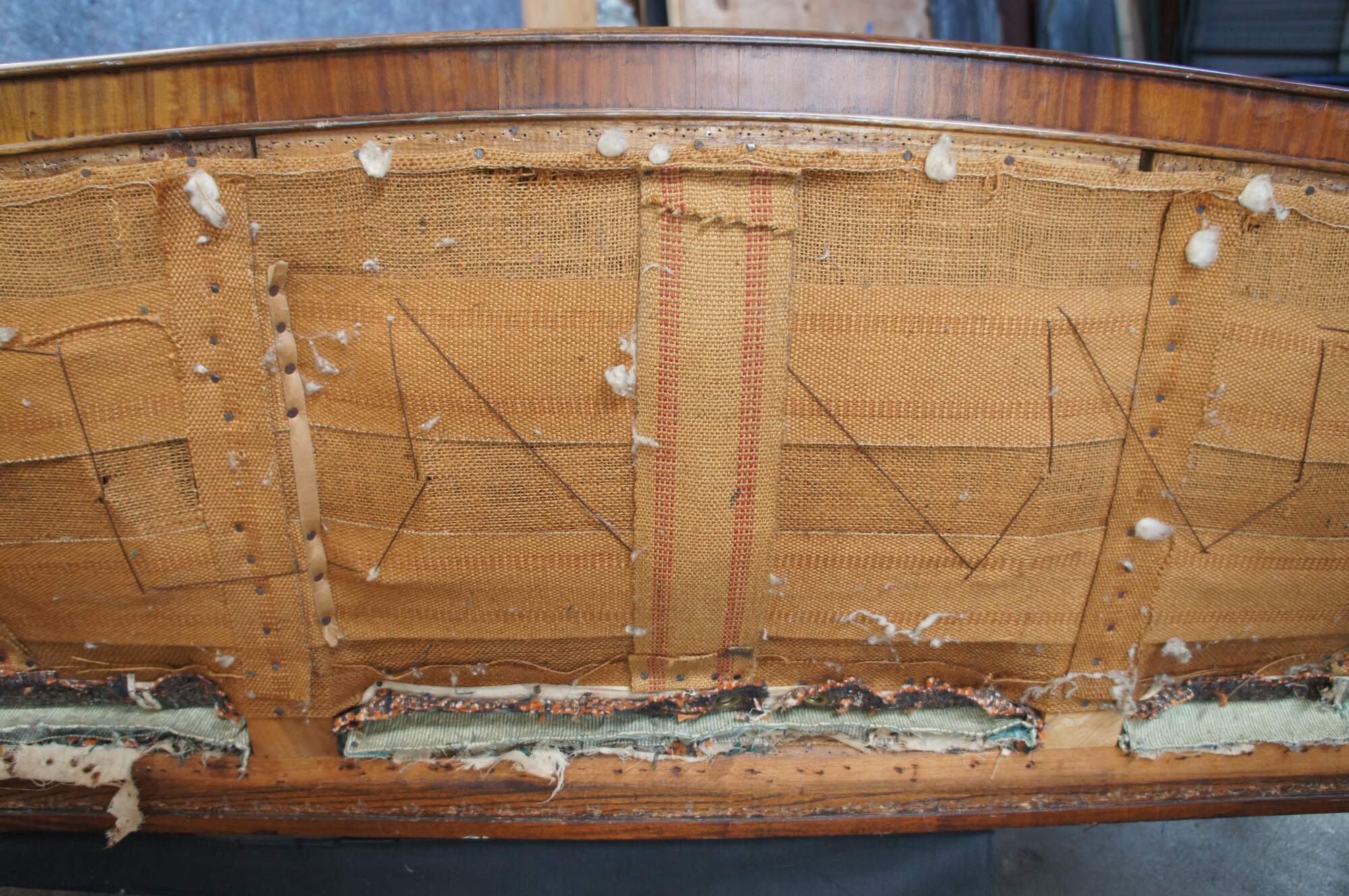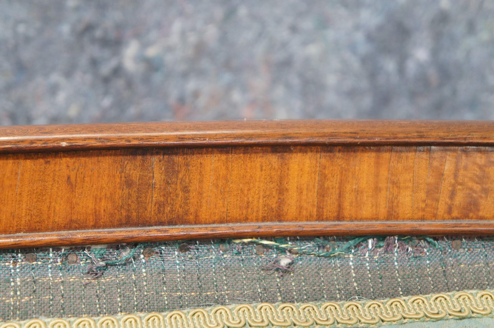 Good Overall; Frame shows some nick, marks and finish wear from age. Needs new upholstery. Old fabric is loose, missing in spots and stained.