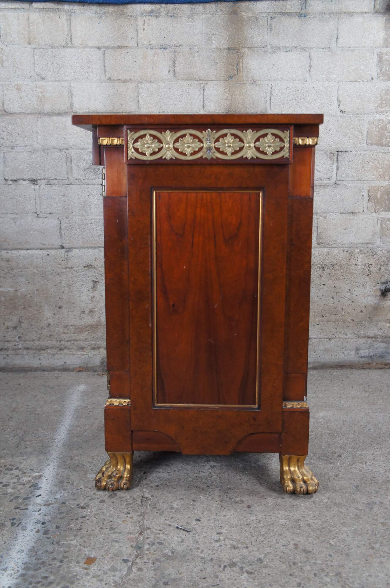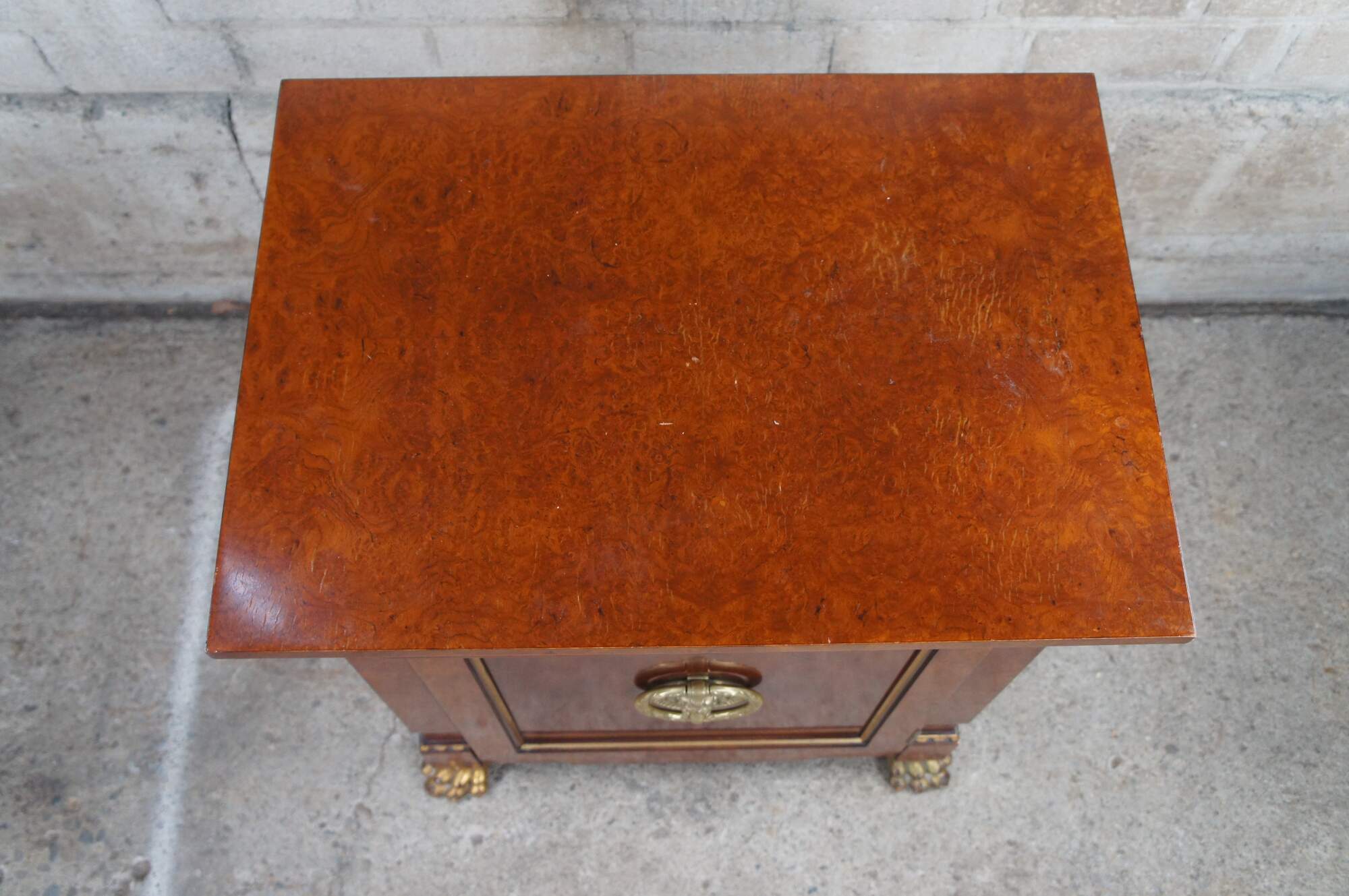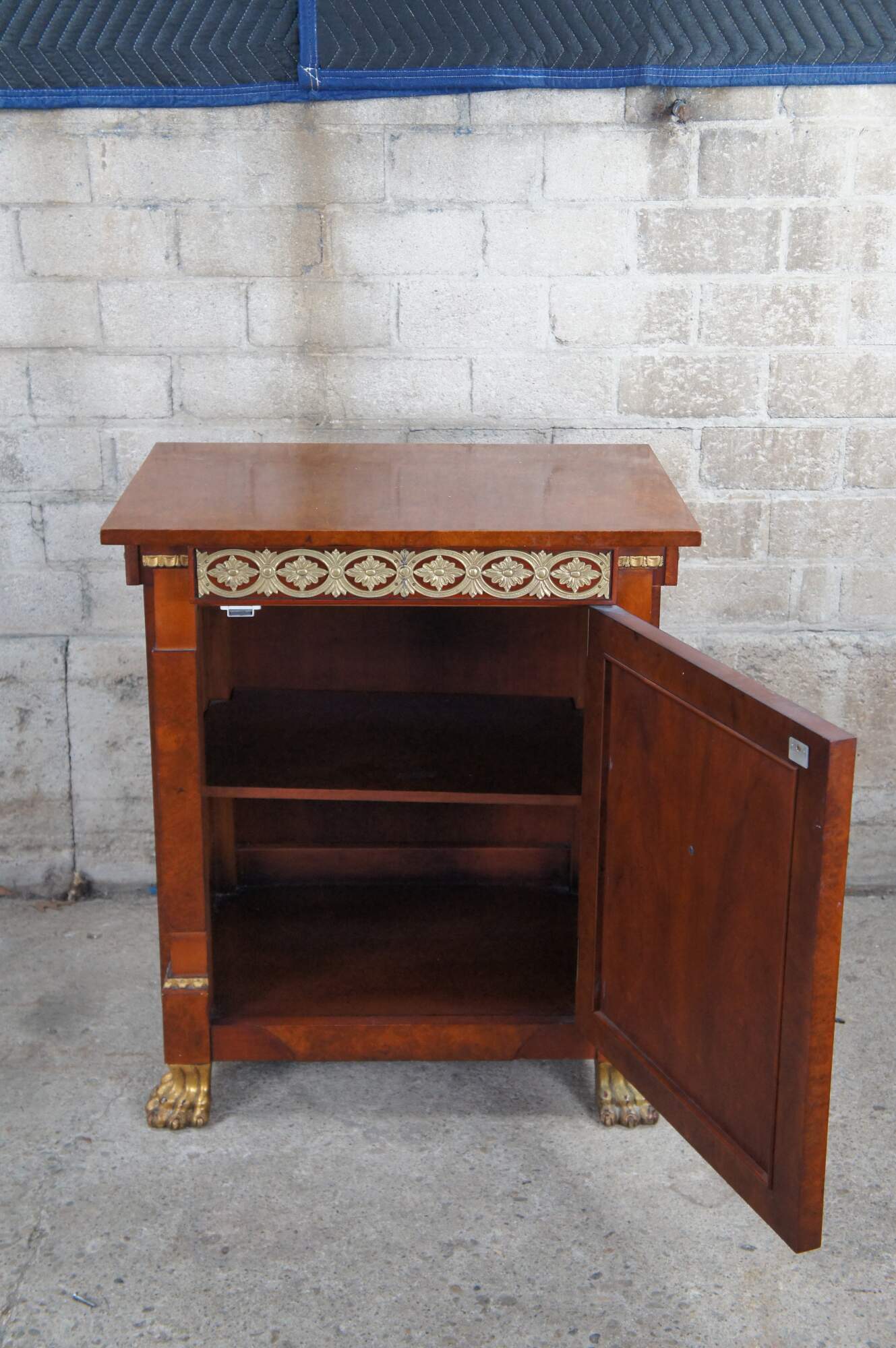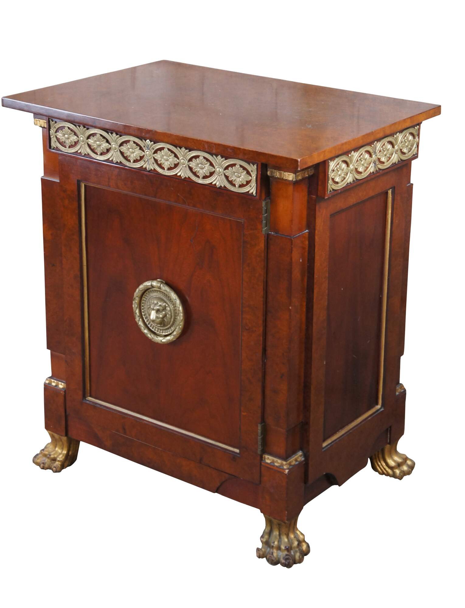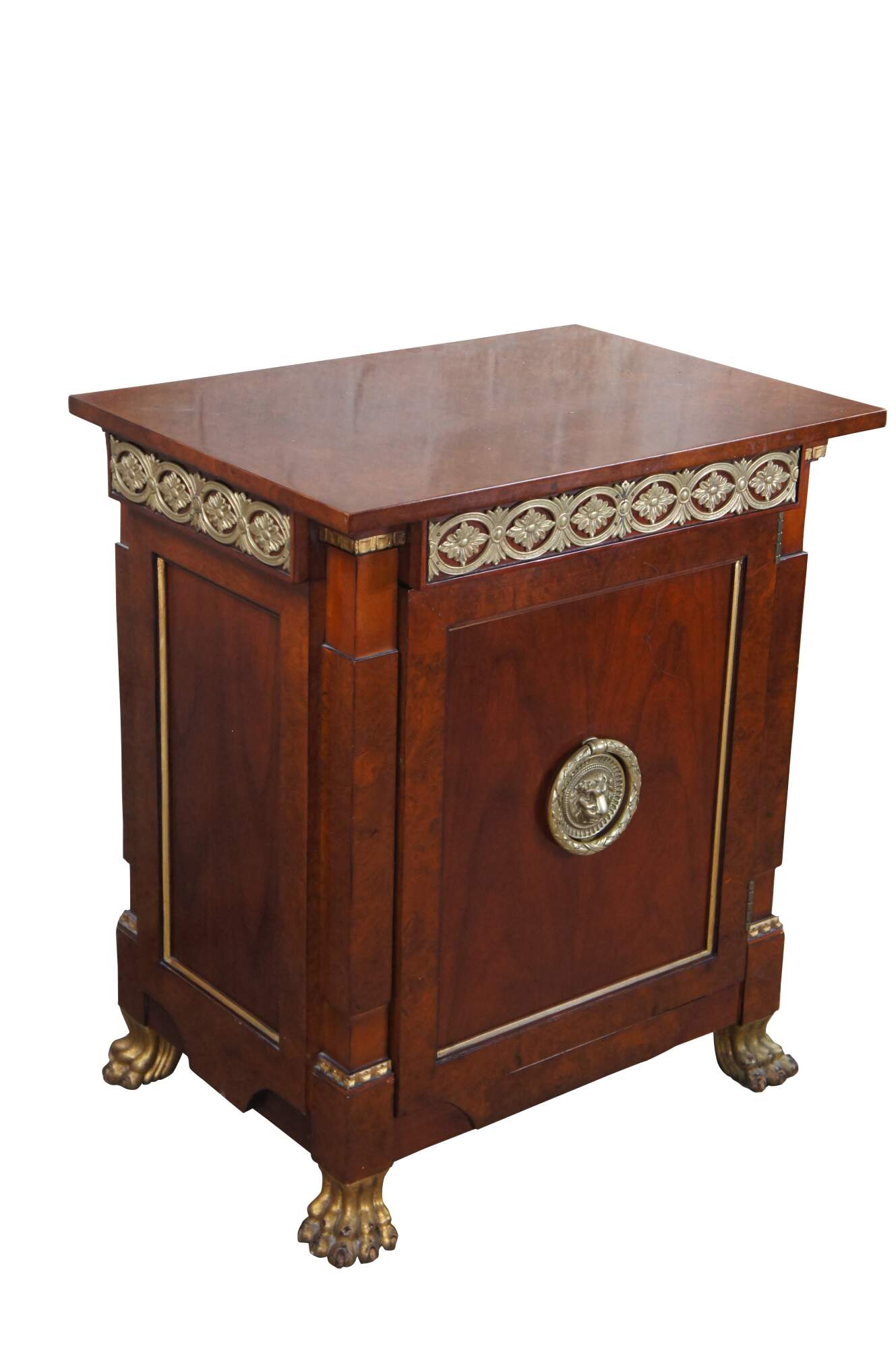 An exceptional nightstand or low cabinet by John Widdicomb. Part of their Russian Collection designed by Chad Womack in the 1970s. Features a cherry case with inset panels trimmed in brass, burled surfaces, gilt ormolu and paw feet. Features a hidden dovetailed drawer and a lower cabine with large lion knocker pull and interior with shelf. Makers mark on brass plate inside drawer
